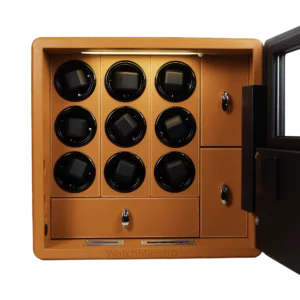WatchMaestro brings a cutting-edge Security Safe boasting an exterior adorned with an Orange Faux leather finish. This safe comes equipped with a Watch Winding Option, Jewelry Drawers, Smart Lock, and an Alarm System, offering a combination of elegance and security for your prized possessions. Inside, the watch winders ensure precise timekeeping for up to 6 watches, ready to go on your wrist at a moment’s notice. Crafted from solid steel, this safe embodies a myriad of features tailored to safeguard and maintain your valuables.