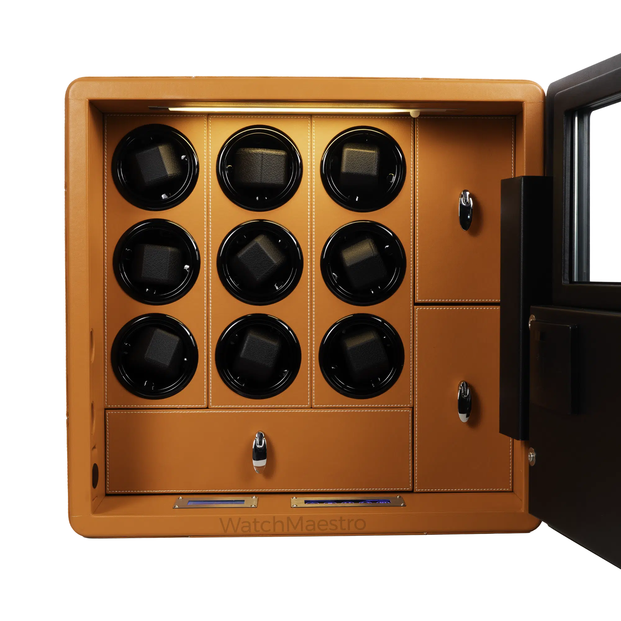 WatchMaestro brings a cutting-edge Security Safe boasting an exterior adorned with an Orange Faux leather finish. This safe comes equipped with a Watch Winding Option, Jewelry Drawers, Smart Lock, and an Alarm System, offering a combination of elegance and security for your prized possessions. Inside, the watch winders ensure precise timekeeping for up to 6 watches, ready to go on your wrist at a moment’s notice. Crafted from solid steel, this safe embodies a myriad of features tailored to safeguard and maintain your valuables.