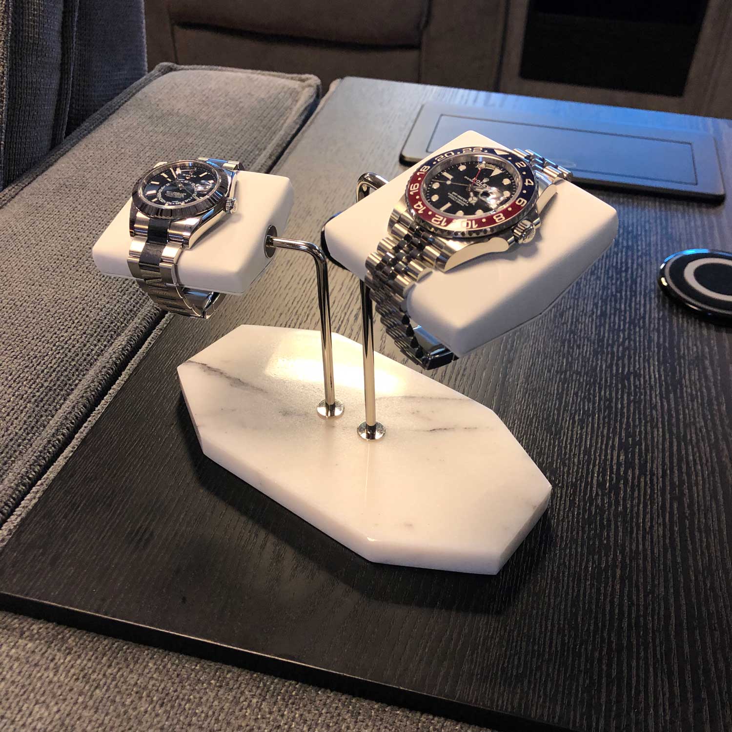 This new watch stand comes with two separate stands for two of your favorite watches. It displays them separately giving a sense of elegance. The base of the stand is made out of marble and has been shaped hexagonally to give a rich feel to your desk. The leather cushion on top assures that your watches are safe from any scratches. This also ensures that the watch does not slip off the stand.