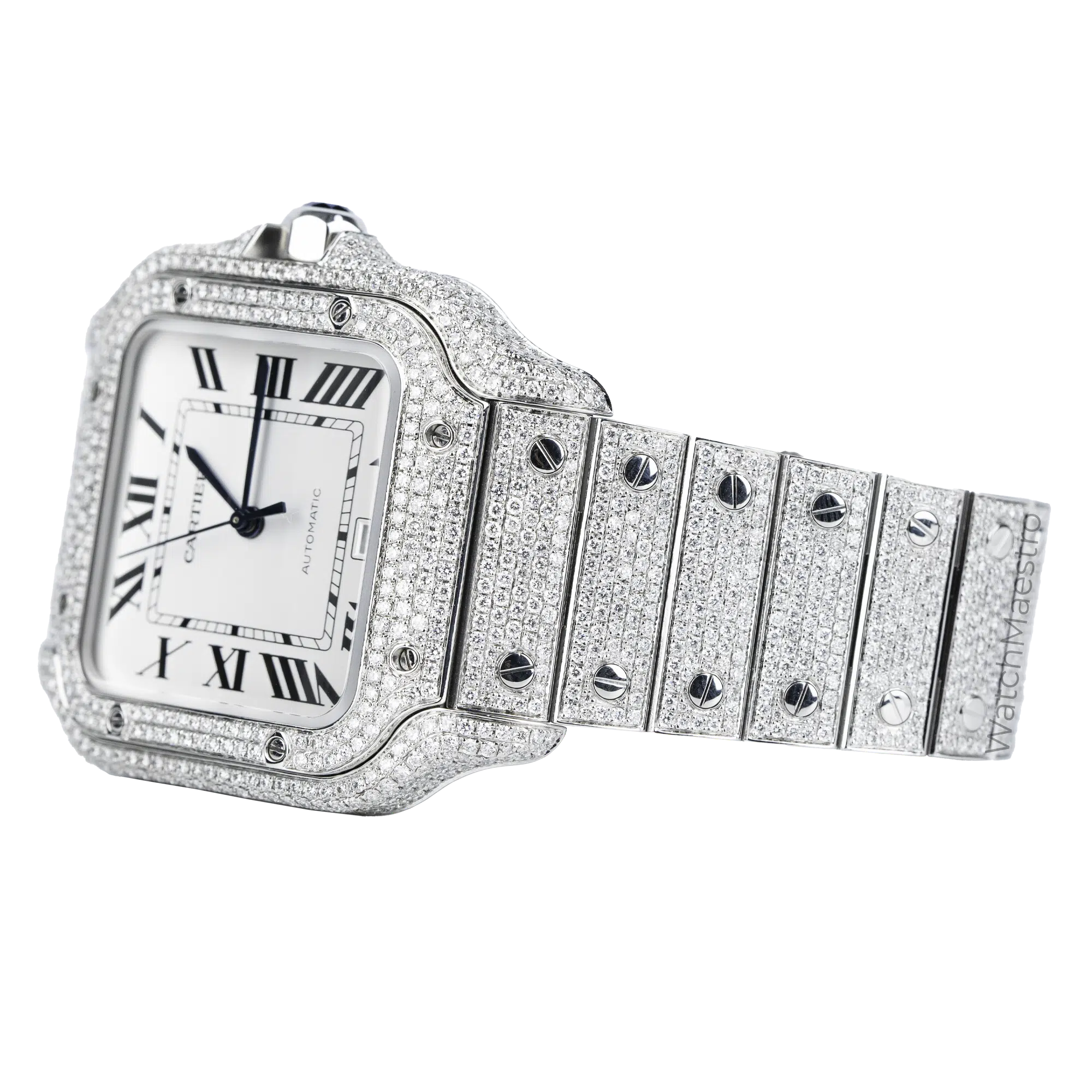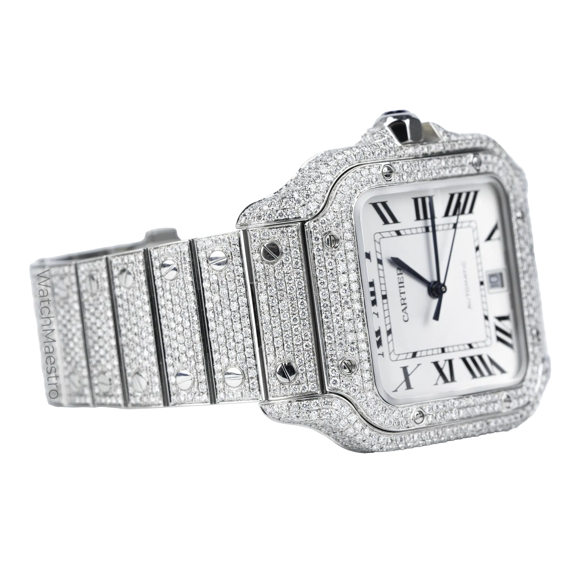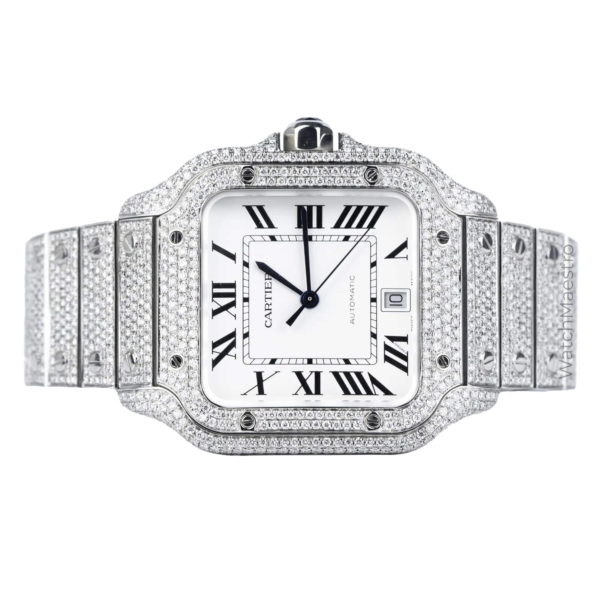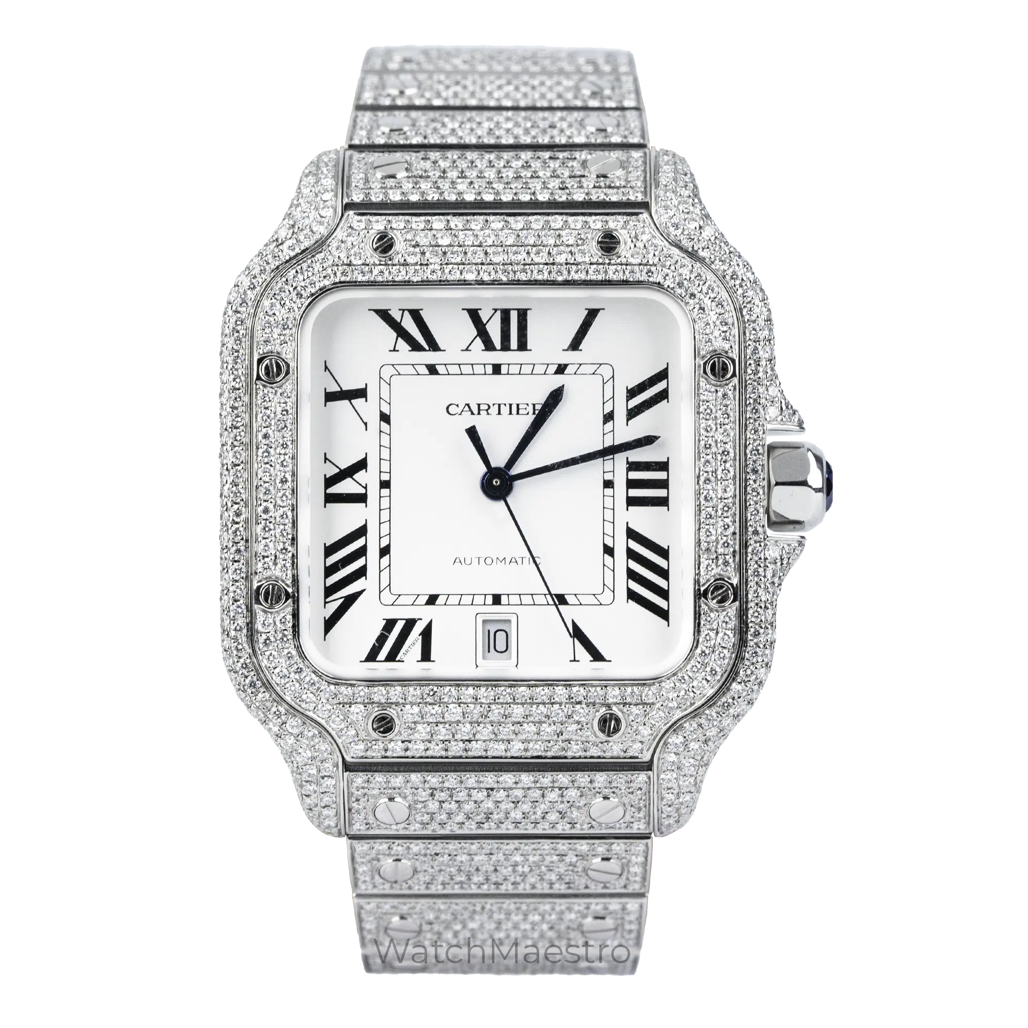 ساعة كارتييه سانتوس – تحفة فنية خالدة، مصنوعة من فولاذ مقاوم للصدأ بقطر 39.8 مم. وقد رُصِّعت هذه الساعة تحديدًا بألماس من سوق ما بعد البيع. تحتوي على 2100 ماسة، يبلغ وزنها الإجمالي 9 قيراط. هذه الماسات دائرية لامعة بلون G، وتتراوح درجة نقائها بين VVS1 وVS2. في حين أن الماس هو ما يلفت الانتباه، إلا أن الساعة، عند النظر إليها، ستشاهد ميناءً أبيض بأرقام رومانية كلاسيكية. تم تسليم الساعة بحالة ممتازة، وتأتي كاملةً مع علبتها وأوراقها. تم شراؤها عام 2022، ولا تزال تتمتع بضمان الشركة المصنعة، بل وضمان WatchMaestro لمدة عامين.