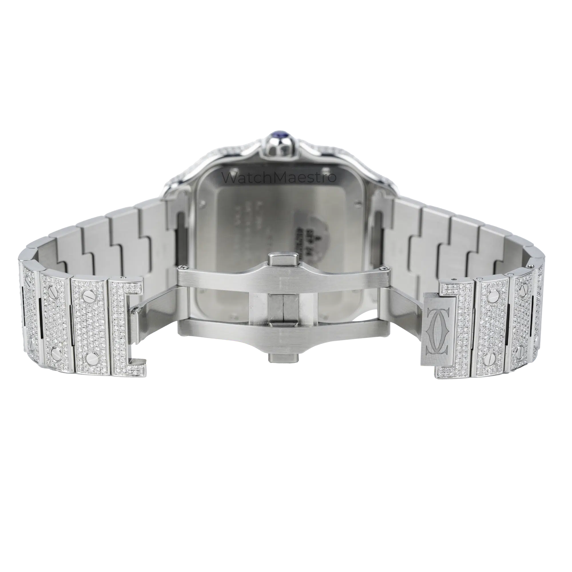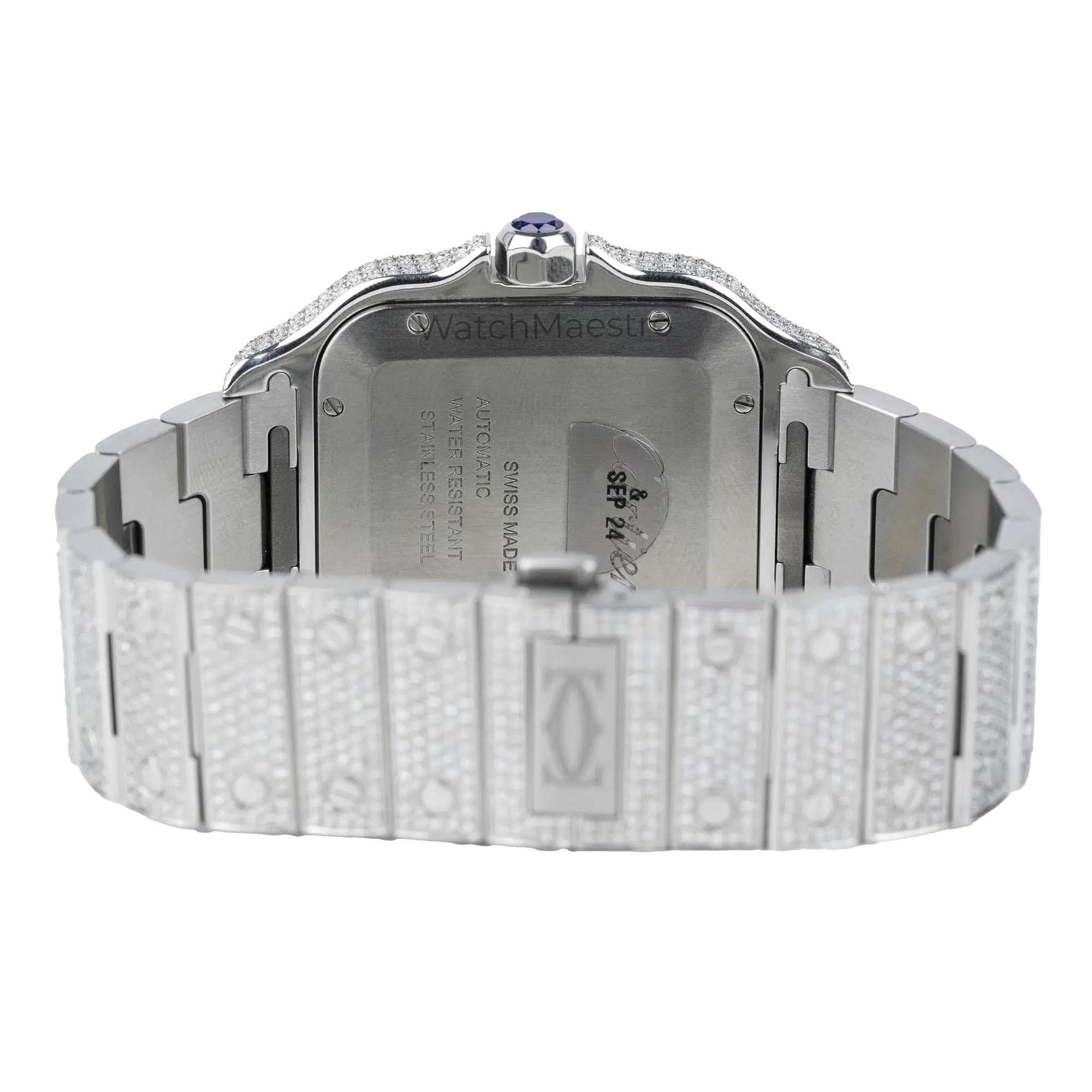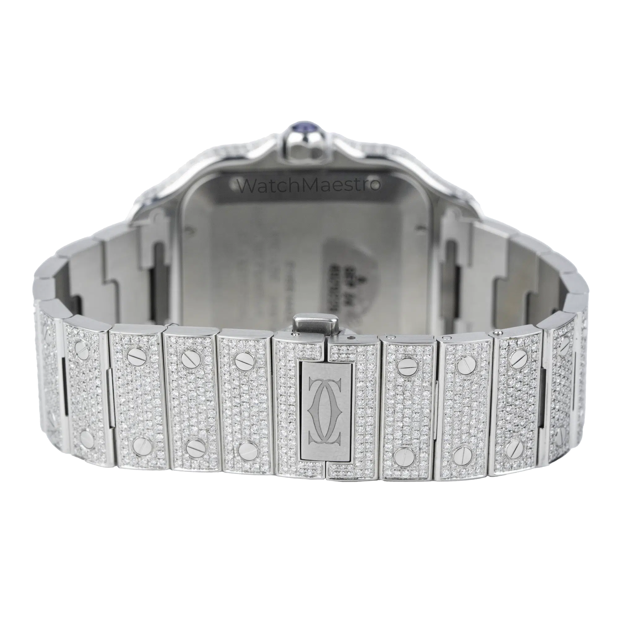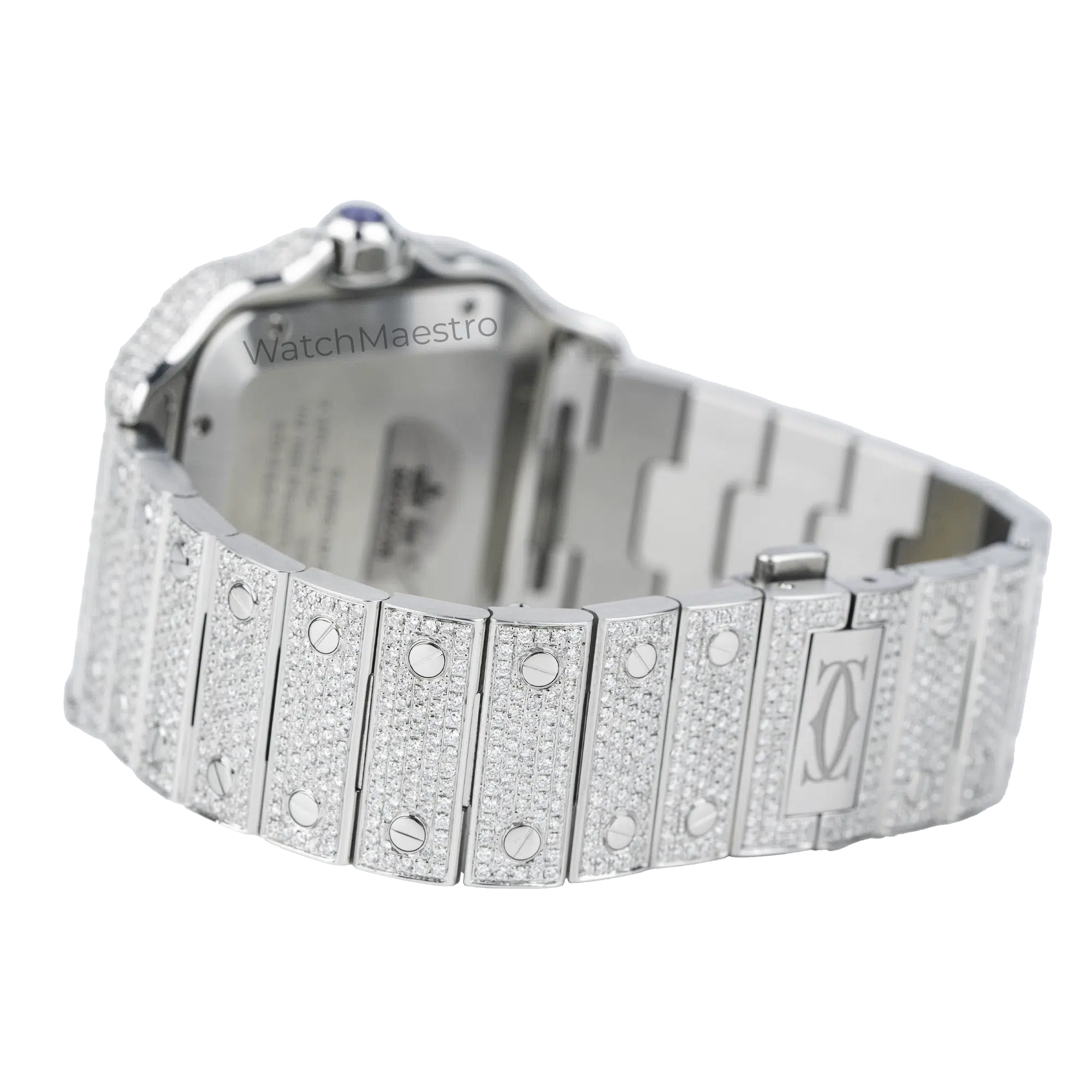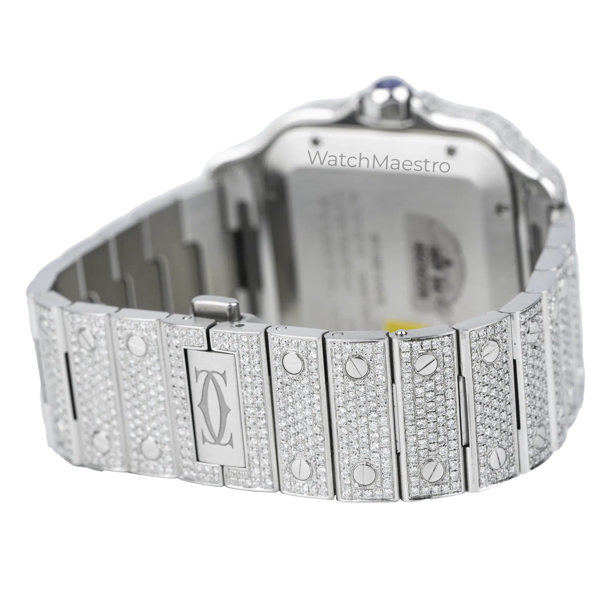 ساعة كارتييه سانتوس – تحفة فنية خالدة، مصنوعة من فولاذ مقاوم للصدأ بقطر 39.8 مم. وقد رُصِّعت هذه الساعة تحديدًا بألماس من سوق ما بعد البيع. تحتوي على 2100 ماسة، يبلغ وزنها الإجمالي 9 قيراط. هذه الماسات دائرية لامعة بلون G، وتتراوح درجة نقائها بين VVS1 وVS2. في حين أن الماس هو ما يلفت الانتباه، إلا أن الساعة، عند النظر إليها، ستشاهد ميناءً أبيض بأرقام رومانية كلاسيكية. تم تسليم الساعة بحالة ممتازة، وتأتي كاملةً مع علبتها وأوراقها. تم شراؤها عام 2022، ولا تزال تتمتع بضمان الشركة المصنعة، بل وضمان WatchMaestro لمدة عامين.