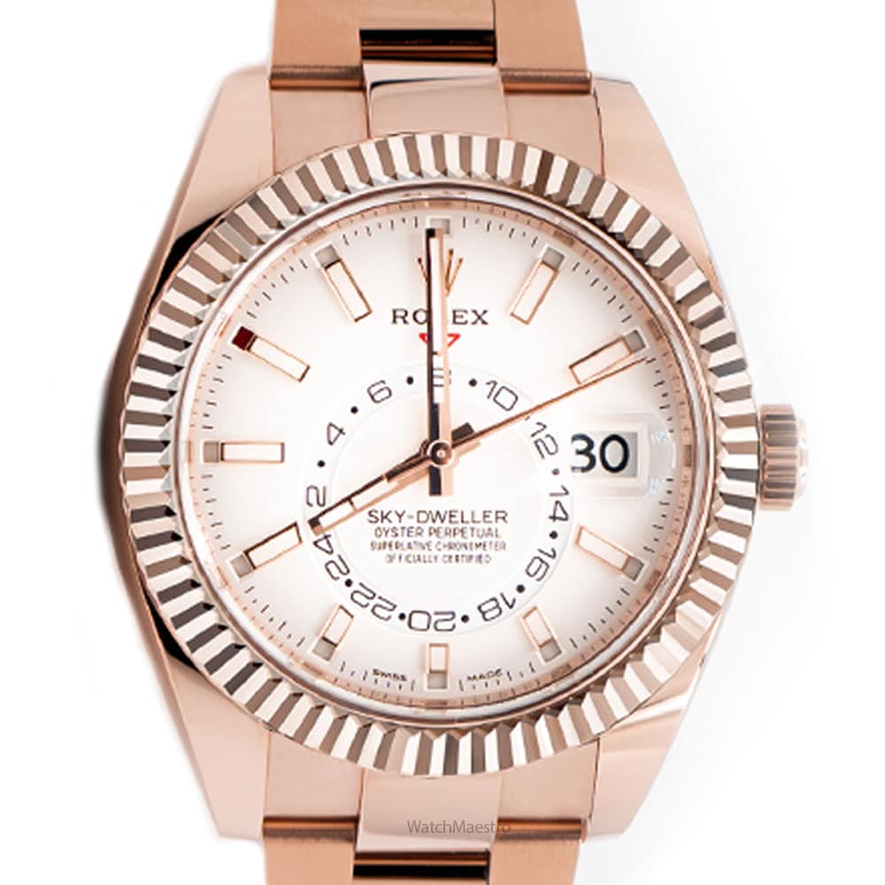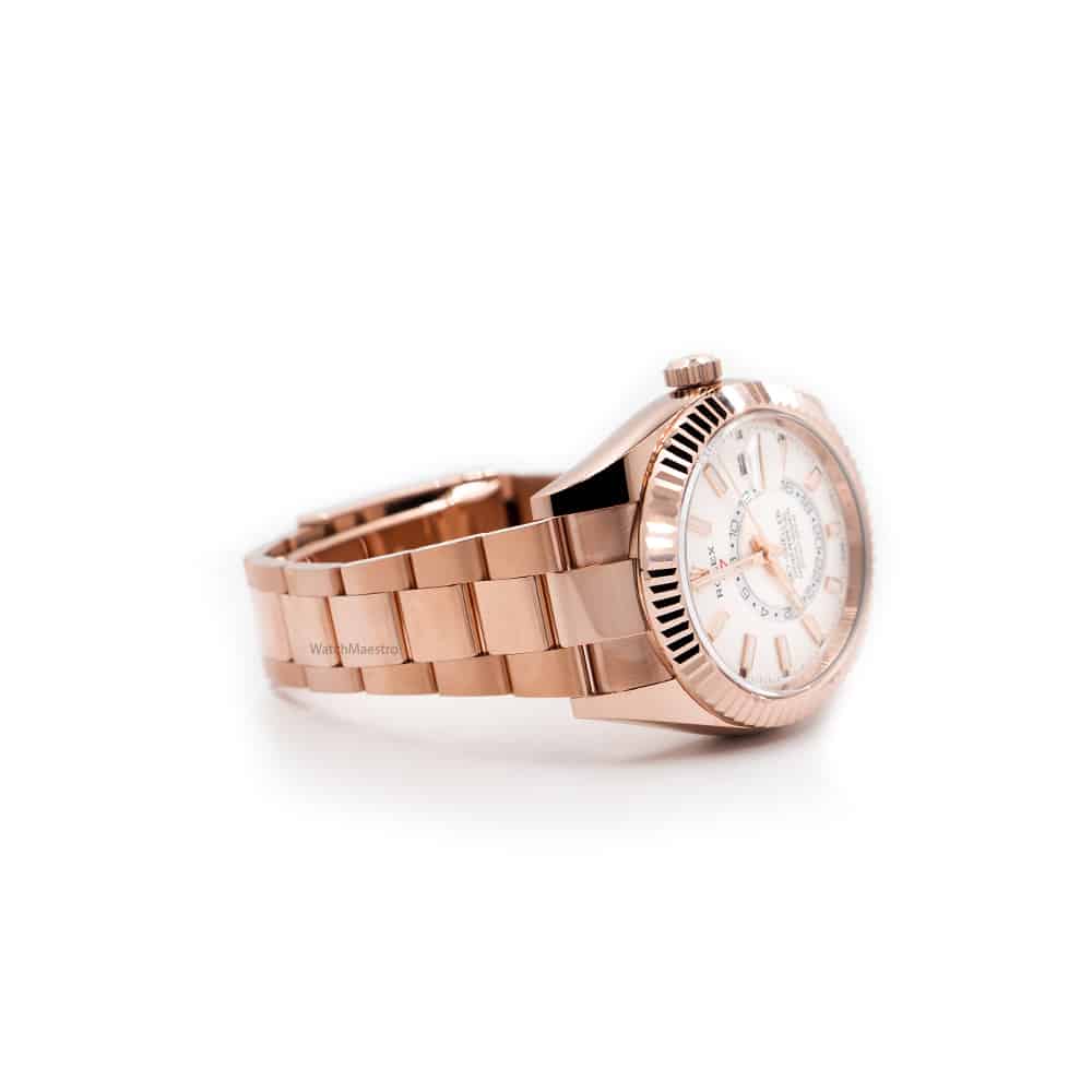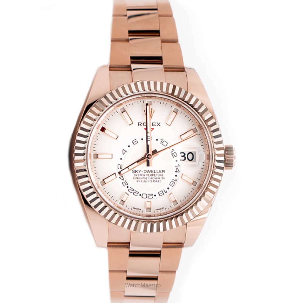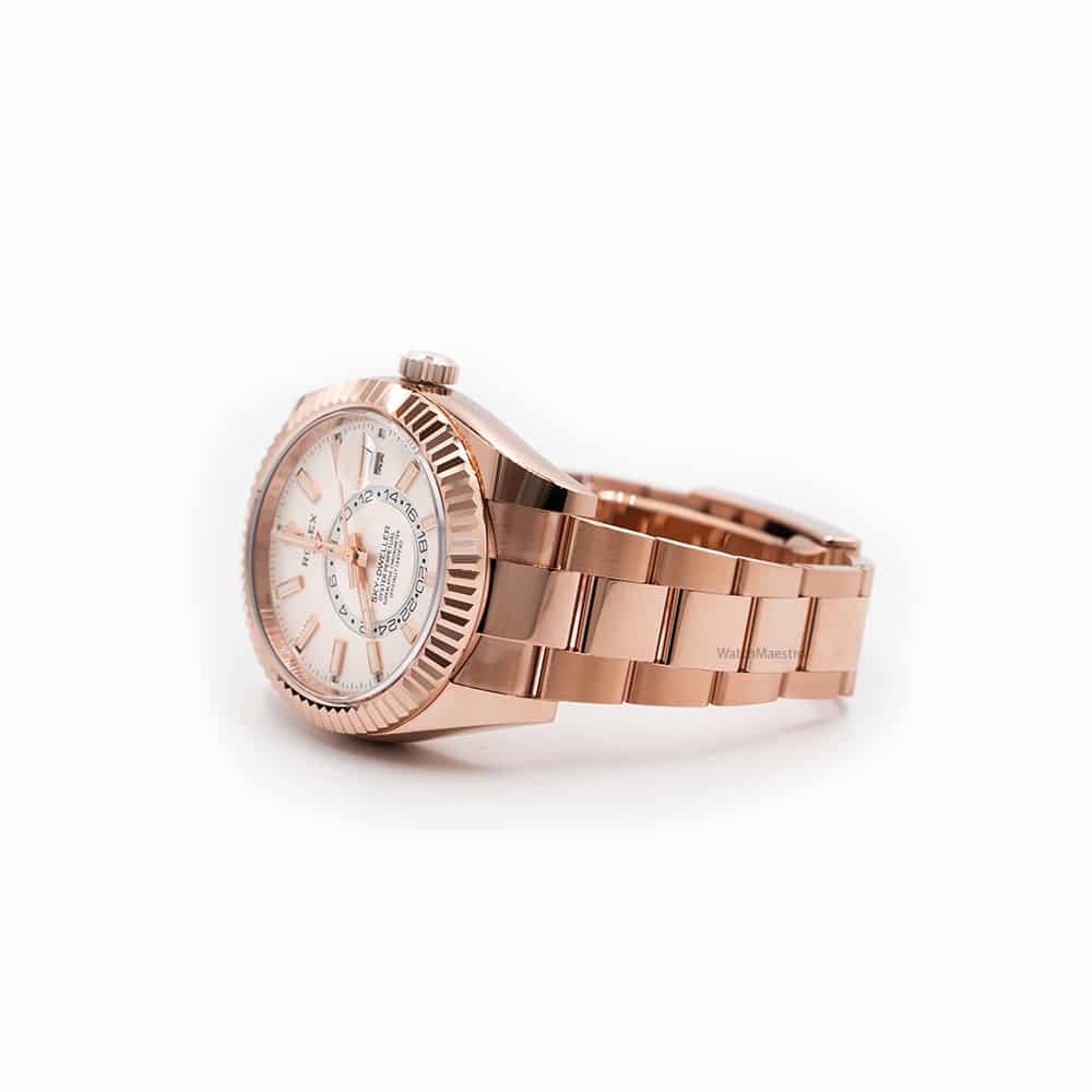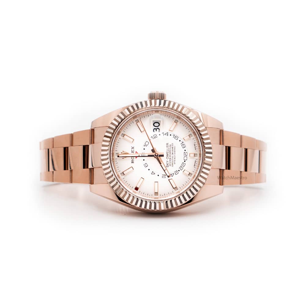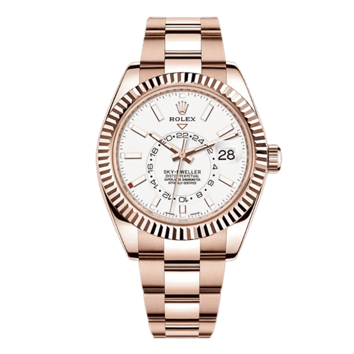 ساعة رولكس سكاي-دويلر جديدة كليًا، بميناء أبيض بقطر 42 مم. إصدارها مصنوع من ذهب إيفروز، ومزوّد بسوار أويستر. تم شراؤها في أبريل 2022، وتتميز بإطار رولكس المخدد المميز. مع الطلب الكبير من هواة الساعات، يصعب الحصول على هذه الساعة المميزة.
