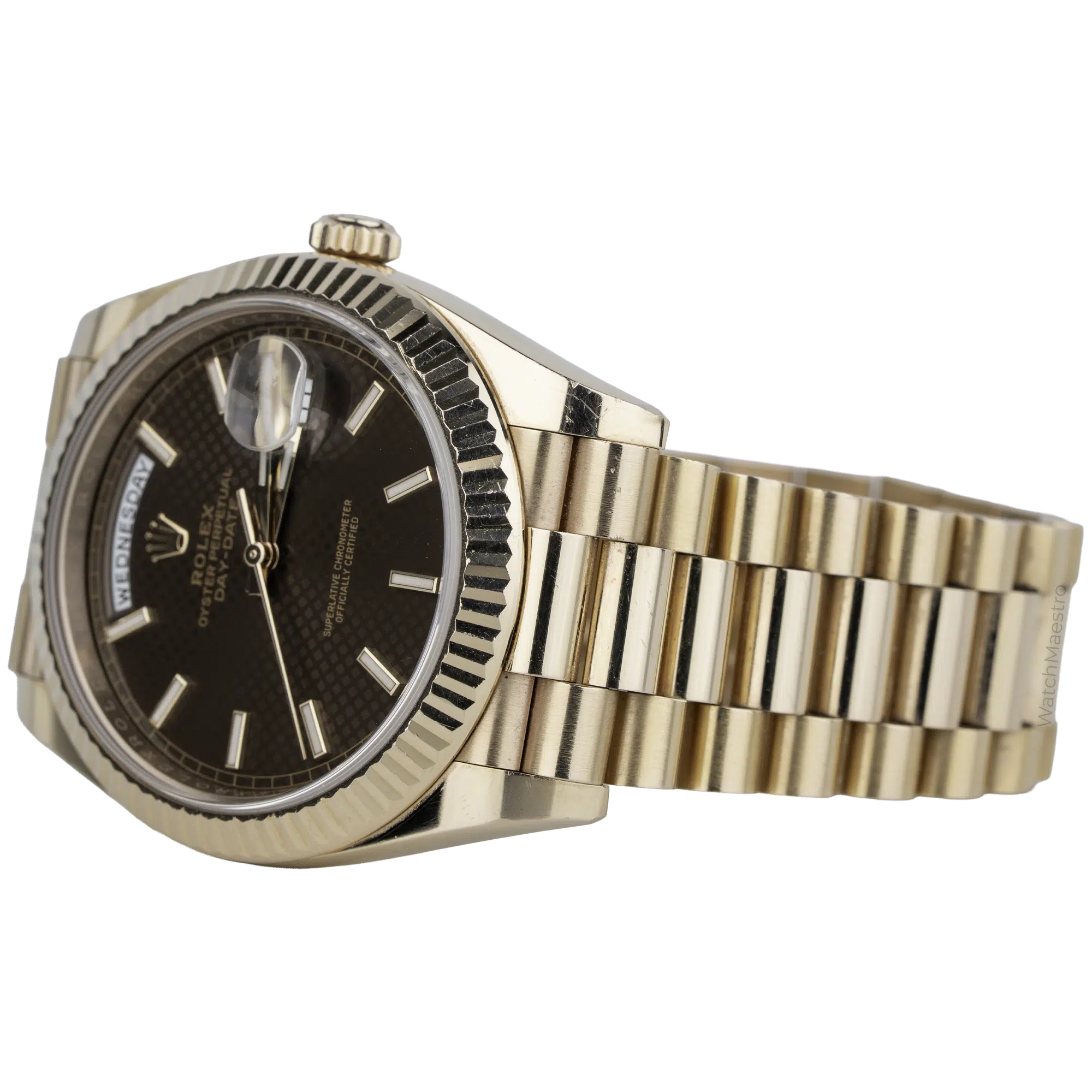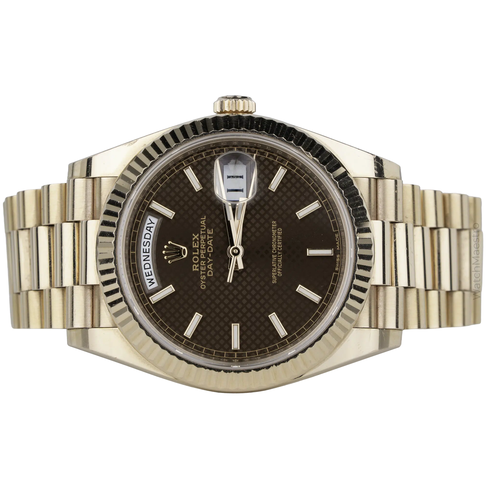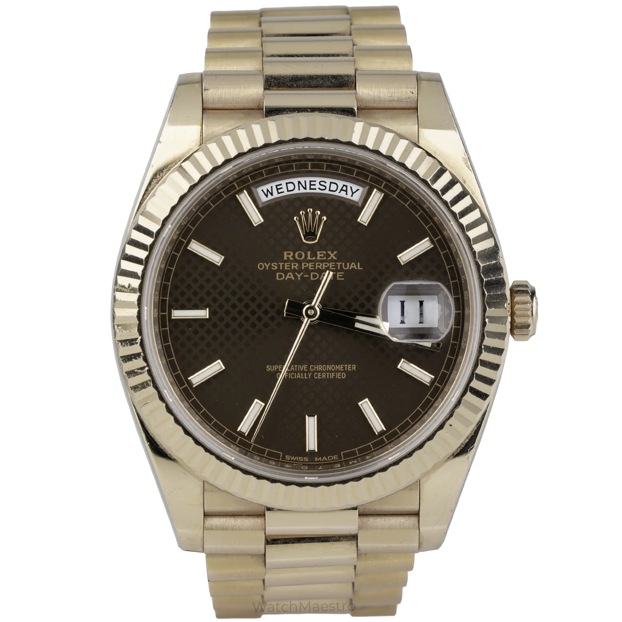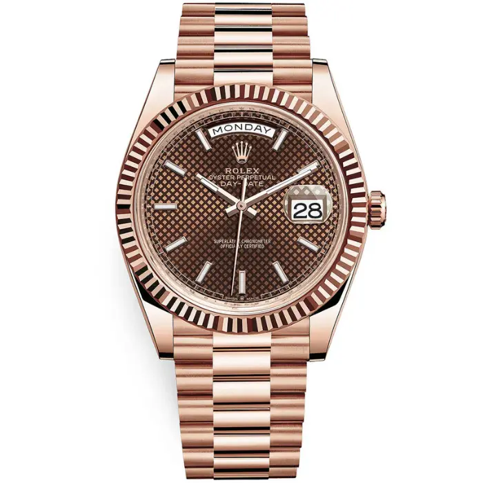 هذه ساعة رولكس داي-ديت ٤٠ مم مستعملة، تتميز بميناء “شوكولاتة موتيف” الذي توقف إنتاجه. برأيي، يبدو هذا الميناء أجمل بكثير من الميناء العادي، وكونه نادرًا، سيجعلك مميزًا في غرفة مليئة بالساعات الفاخرة. اشتريتها عام ٢٠١٨، وتأتي مع العلبة والأوراق. صُنعت الساعة من الذهب الوردي عيار ١٨ قيراطًا، وتتميز بإطار مُخدّد وسوار رئاسي. تُجسّد هذه الساعة من رولكس رمزًا حقيقيًا للفخامة والرقي.
