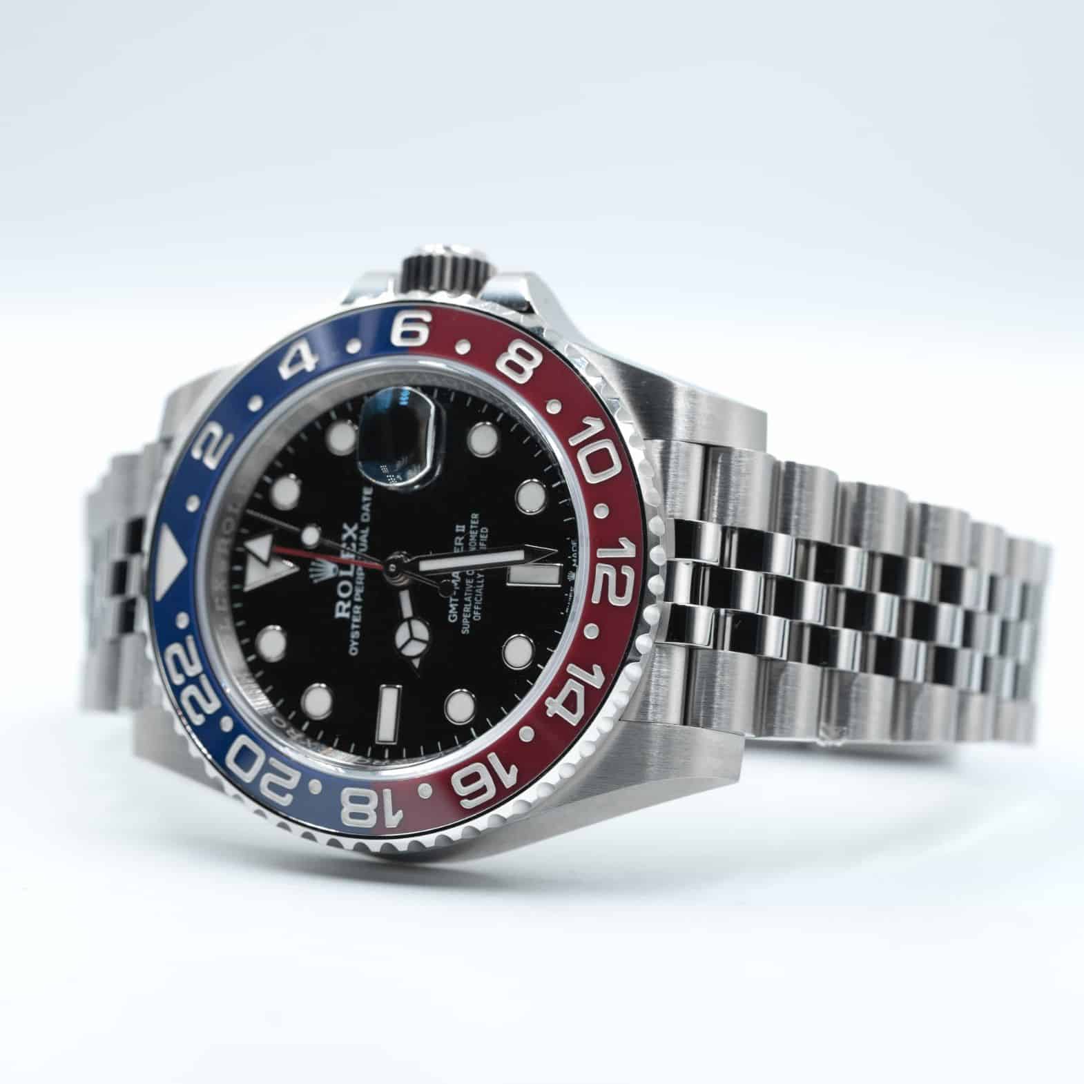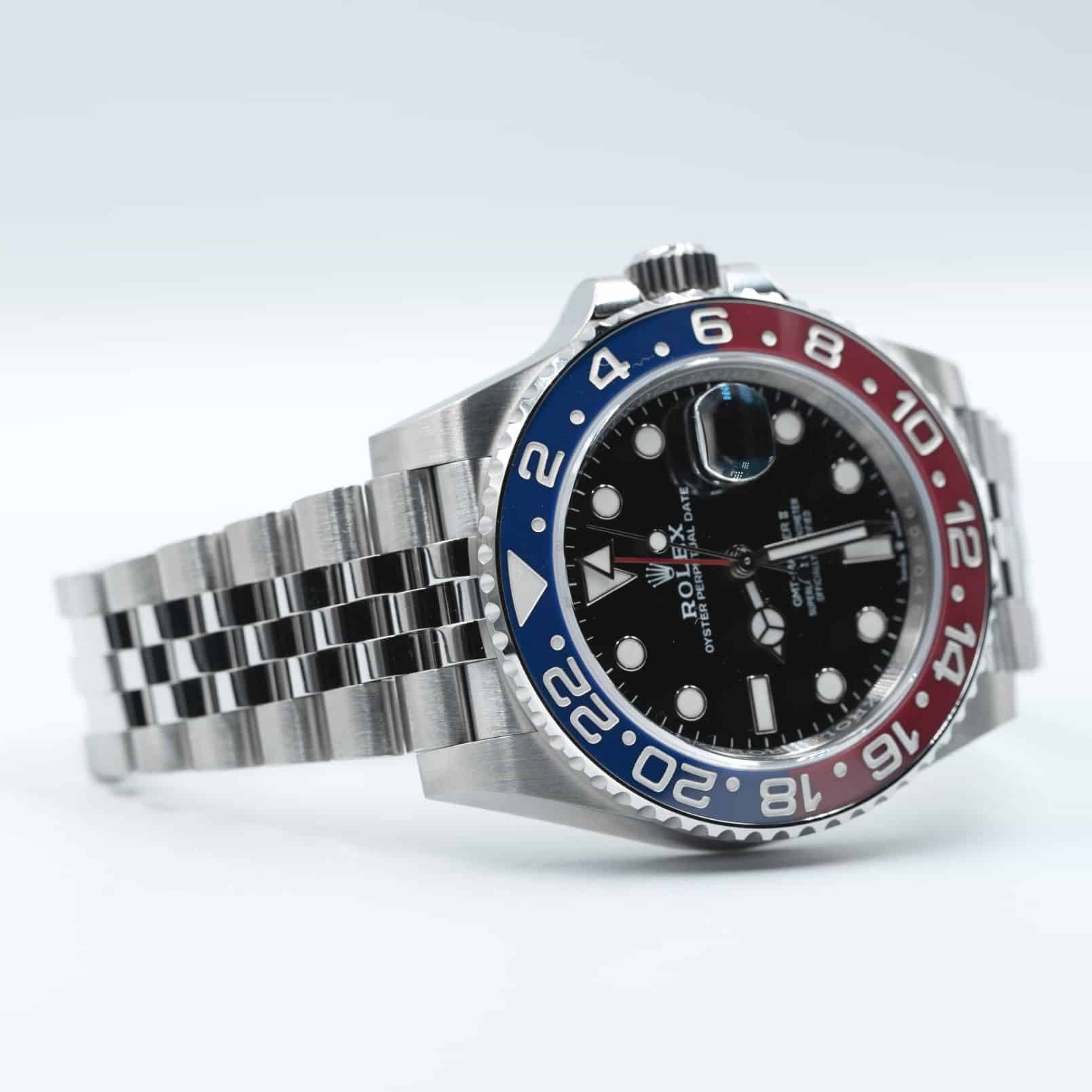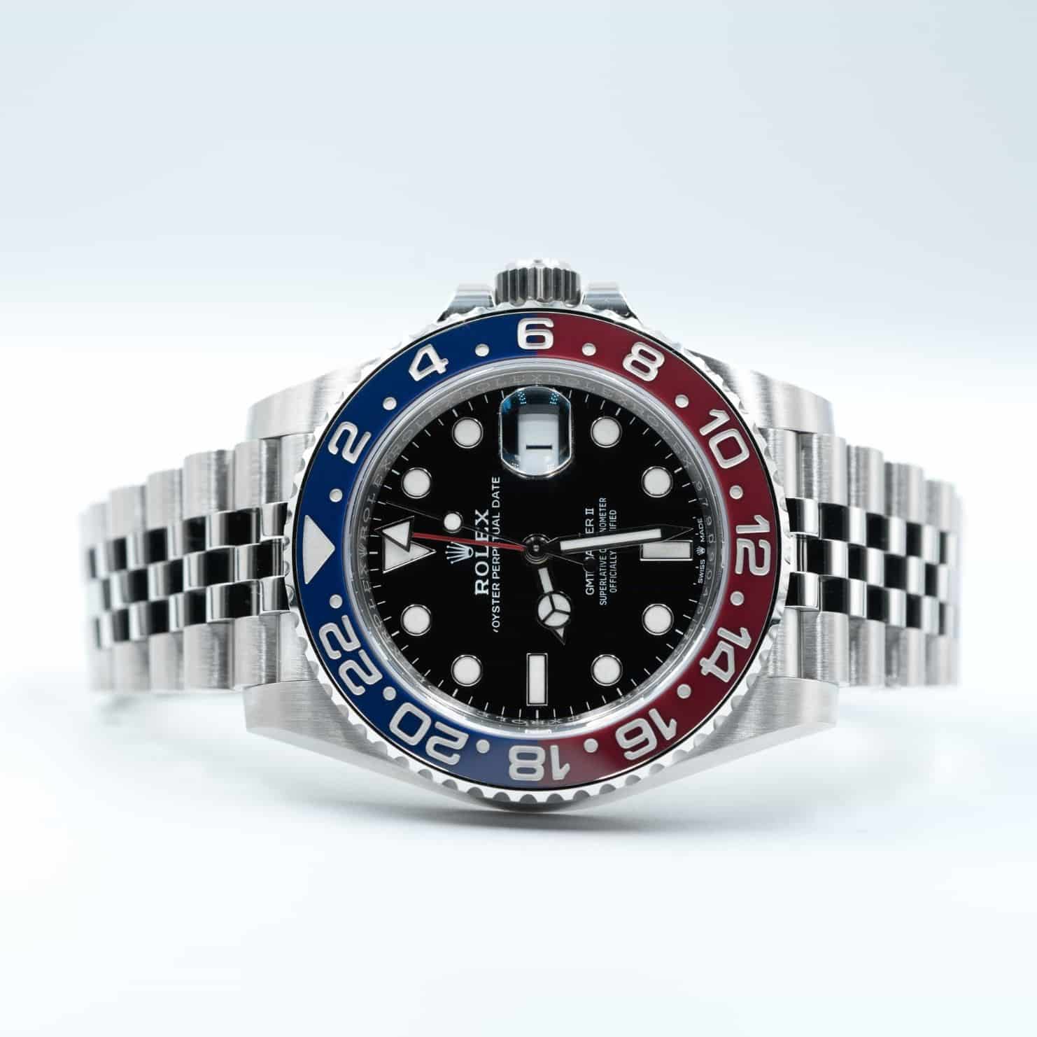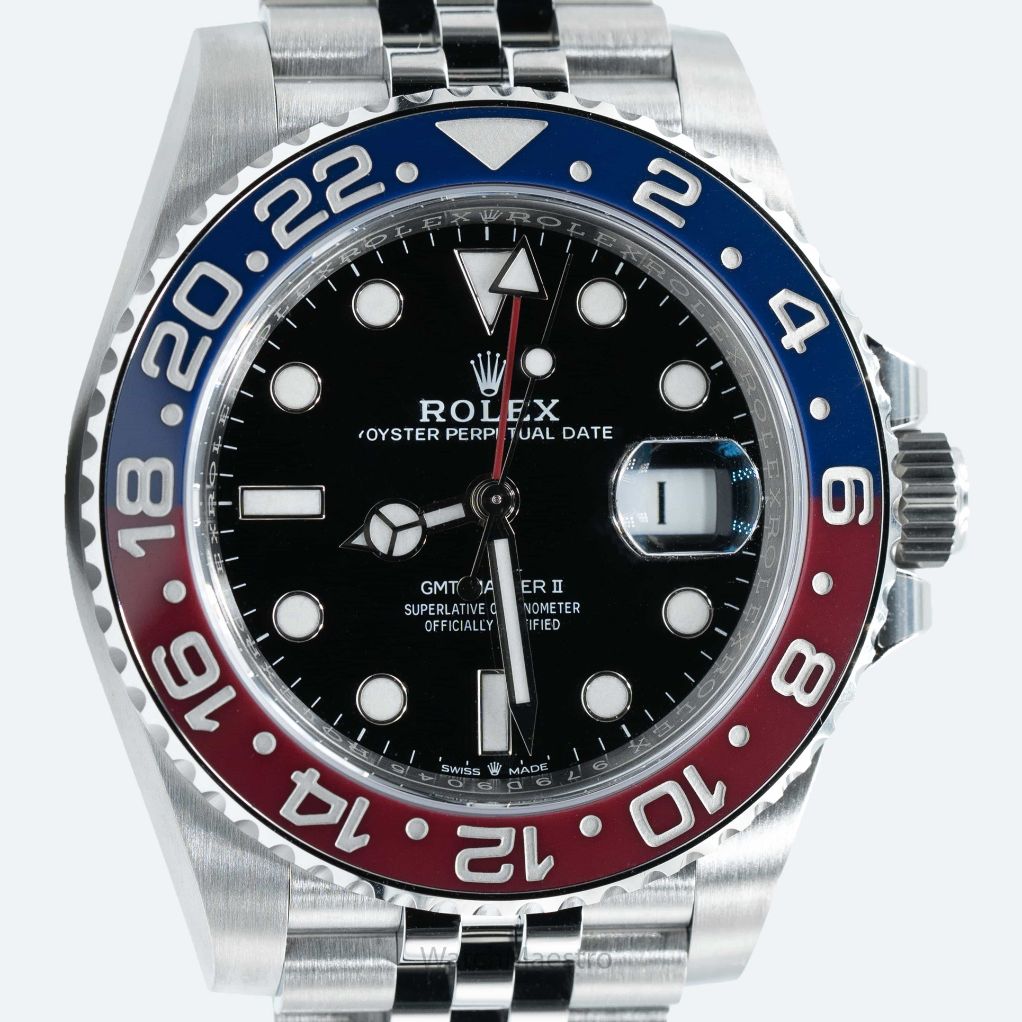 ساعة رولكس جي إم تي ماستر II. اشتق اسم ساعة رولكس بيبسي من شعار شركة بيبسيكو. يُعدّ الإطار الأزرق والأحمر رمزًا مميزًا، ويمثل اللونان الفرق بين الليل والنهار لدى عشاق الساعات.