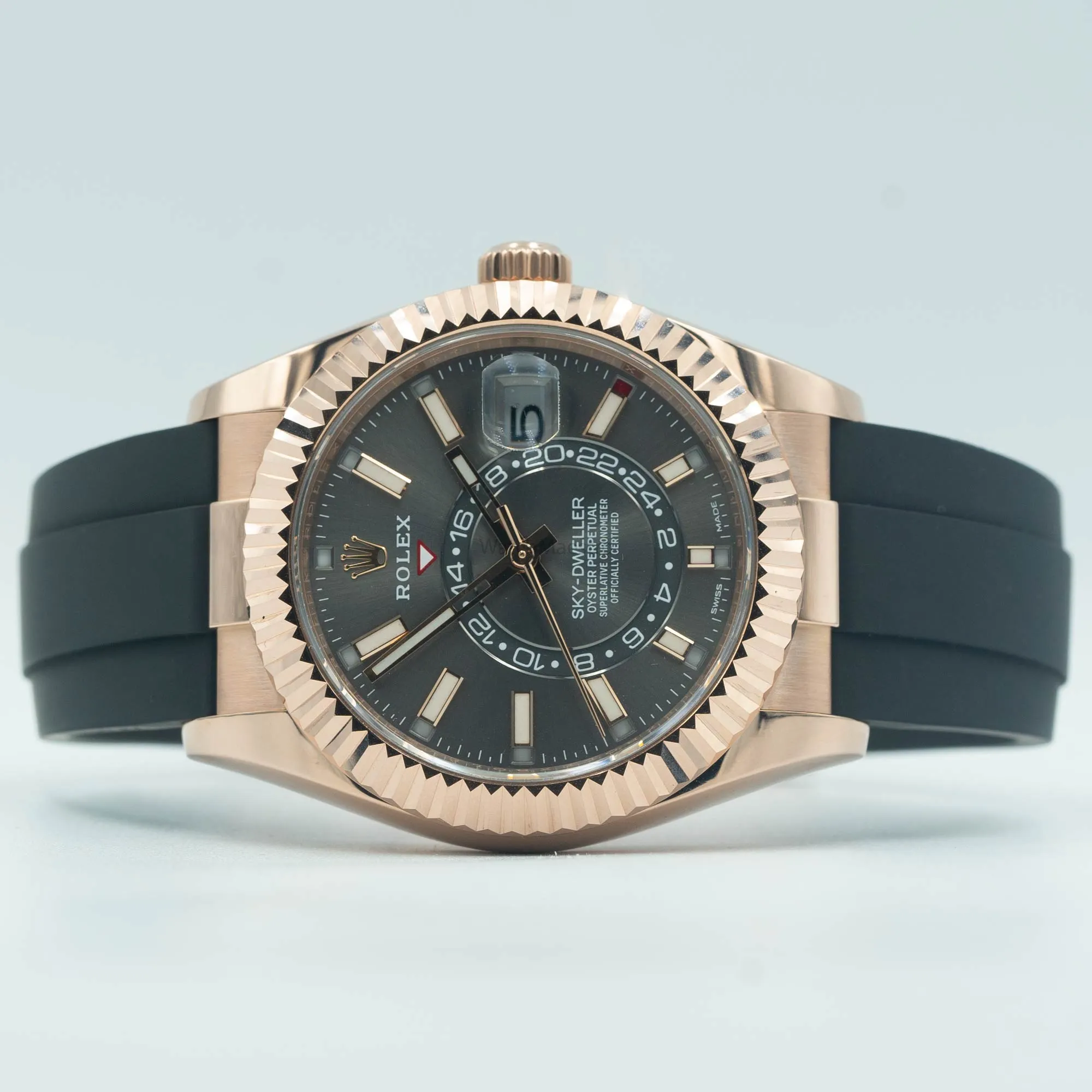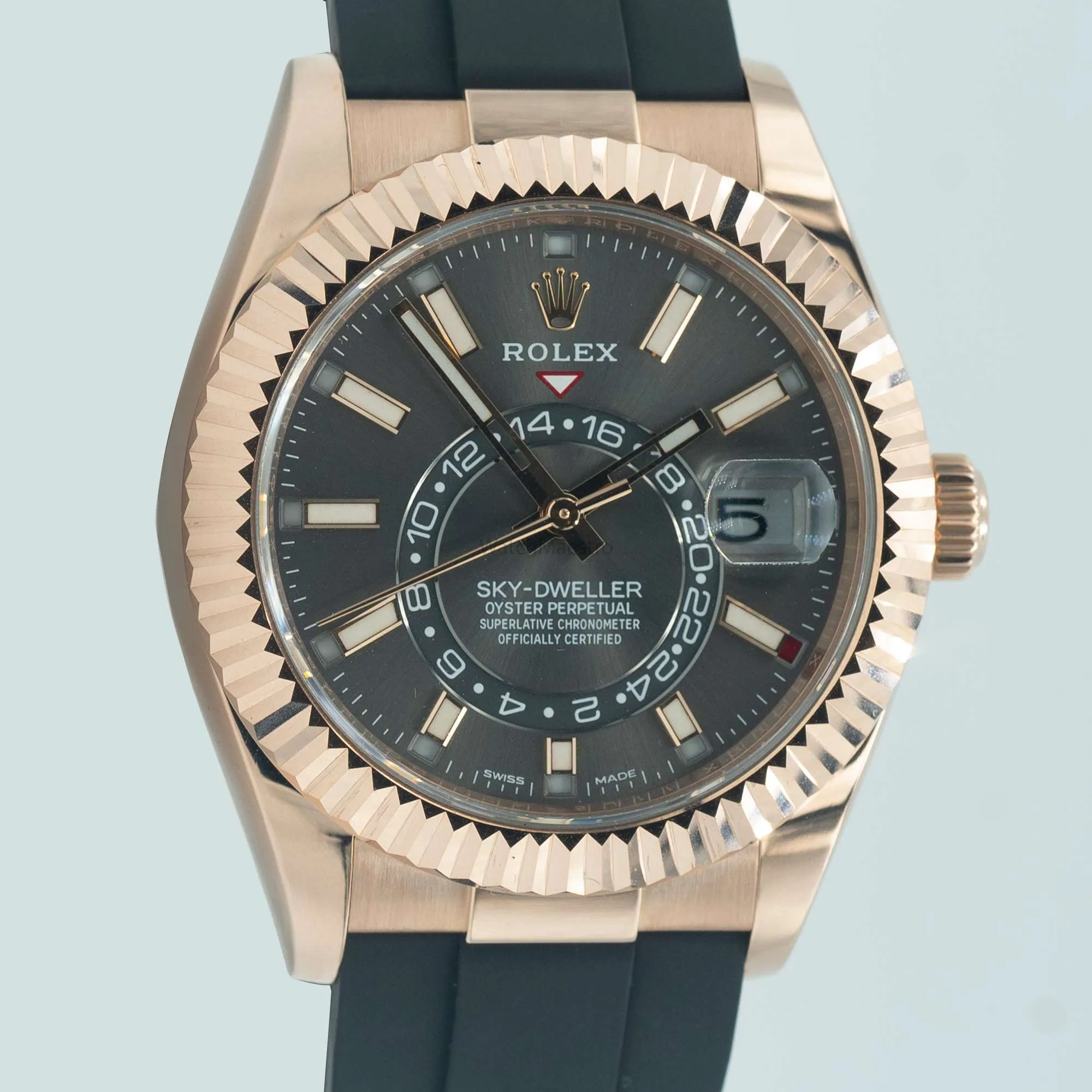 هذه ساعة رولكس سكاي-دويلر مستعملة، رقم المرجع 326235، بميناء رمادي أنيق. صُنعت علبتها من الذهب الوردي عيار 18 قيراطًا، وهي مُزودة بسوار أويستر فليكس، مما يجعلها مريحة للغاية للارتداء، خاصةً لمن يتبعون نمط حياة نشطًا.