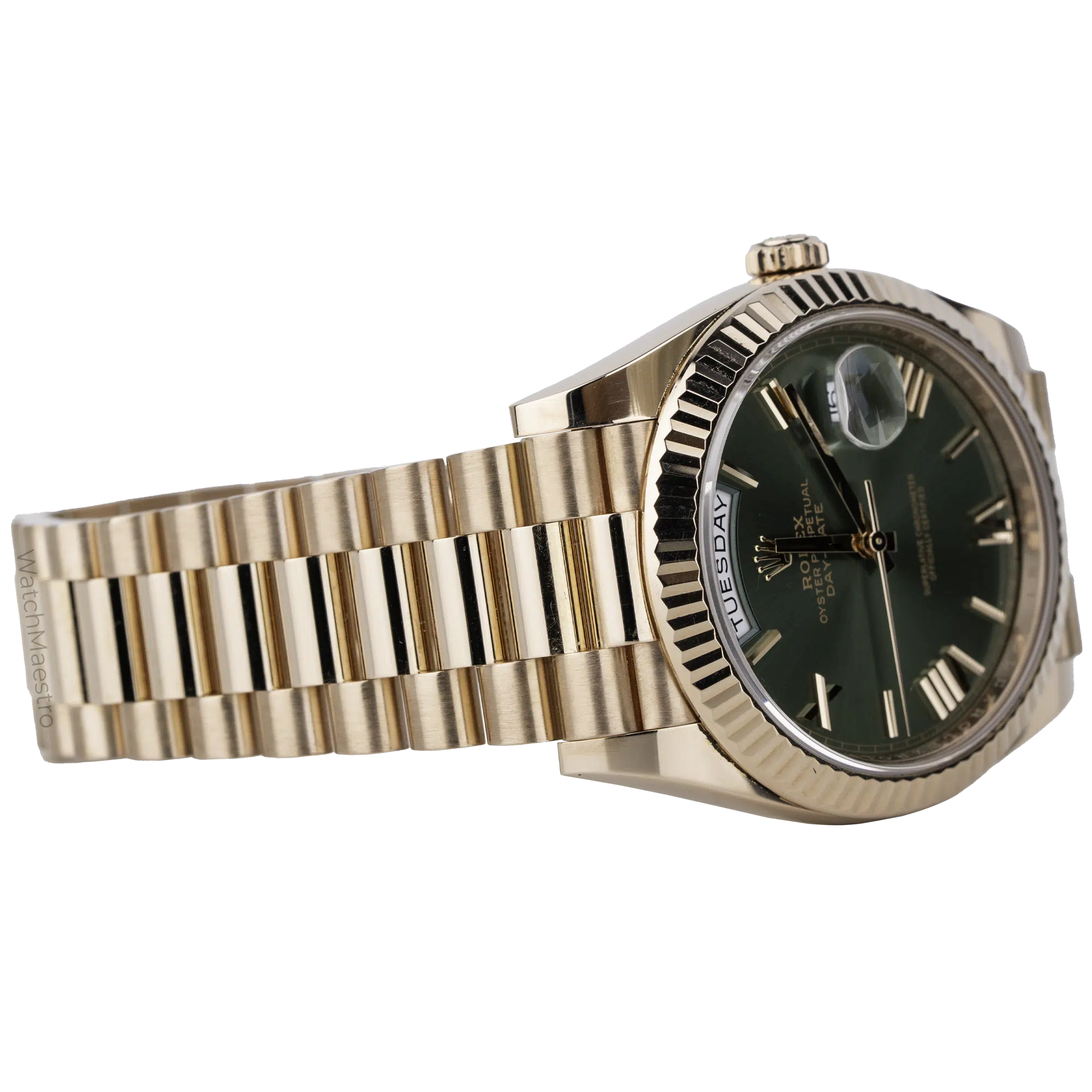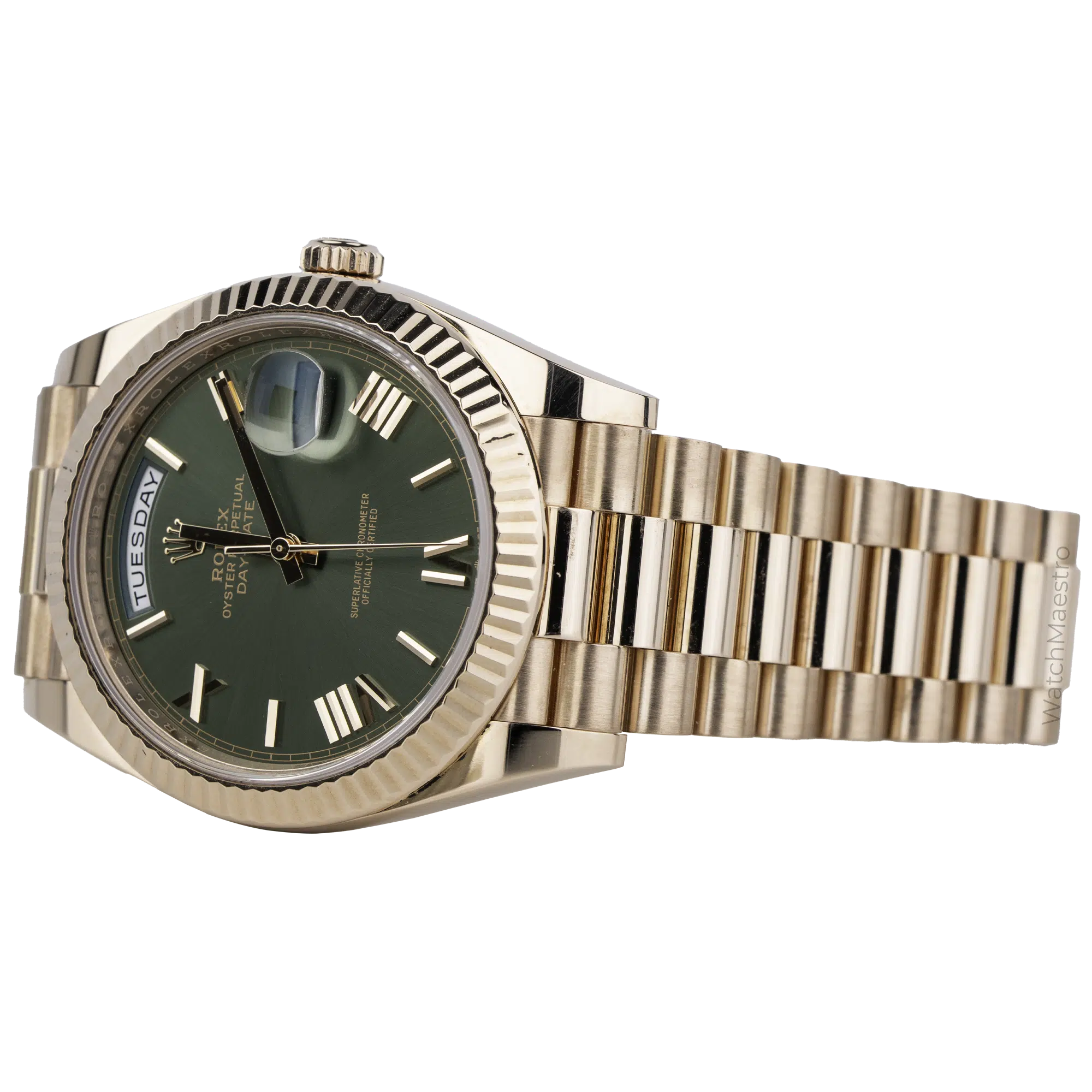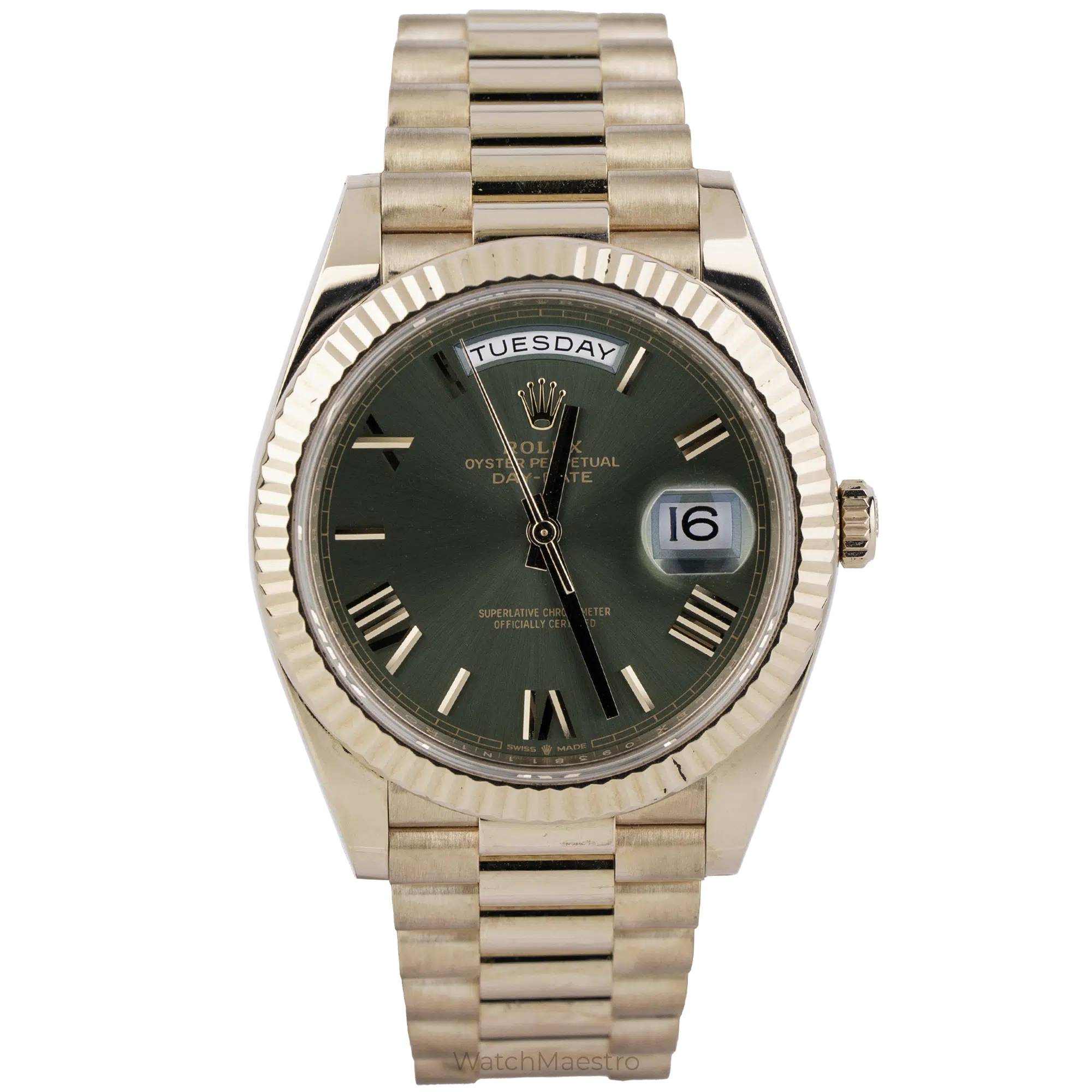 أضف ساعة رولكس داي-ديت المميزة إلى مجموعتك، والمتوفرة الآن بميناء أخضر زيتوني جميل بقطر 40 مم وأرقام رومانية. اشتريت هذه الساعة عام 2021، وهي بحالة مستعملة. تصلك كاملةً بعلبتها الأصلية وأوراقها، مما يضمن أصالتها. ويزيد من أناقتها سوار بريزيدنت الشهير المصنوع من الذهب الوردي عيار 18 قيراطًا، مما يوفر الراحة والأناقة. يندمج السوار بسلاسة مع علبة الذهب الوردي عيار 18 قيراطًا المزودة بإطار مُخدّد من الذهب الوردي. إنها ليست مجرد ساعة، بل رمز للنجاح، وارتداء هذه الساعة على معصمك في اجتماع العمل القادم سيُغير منظور عملائك.