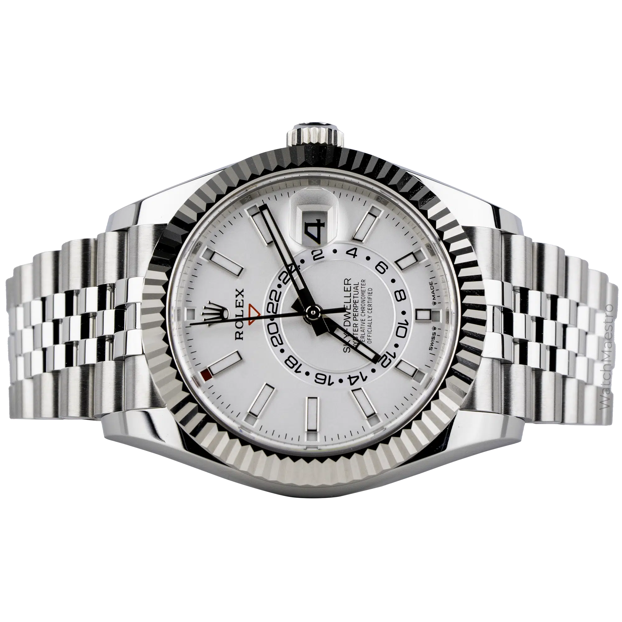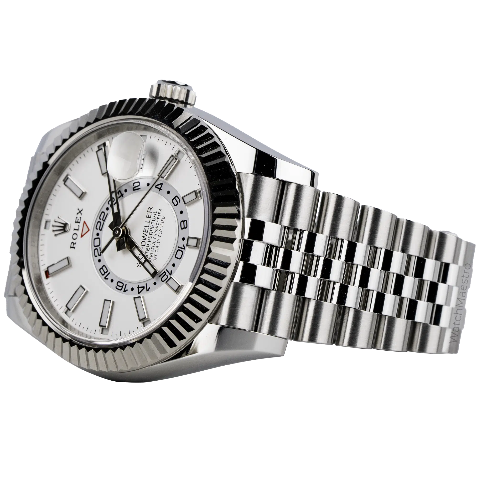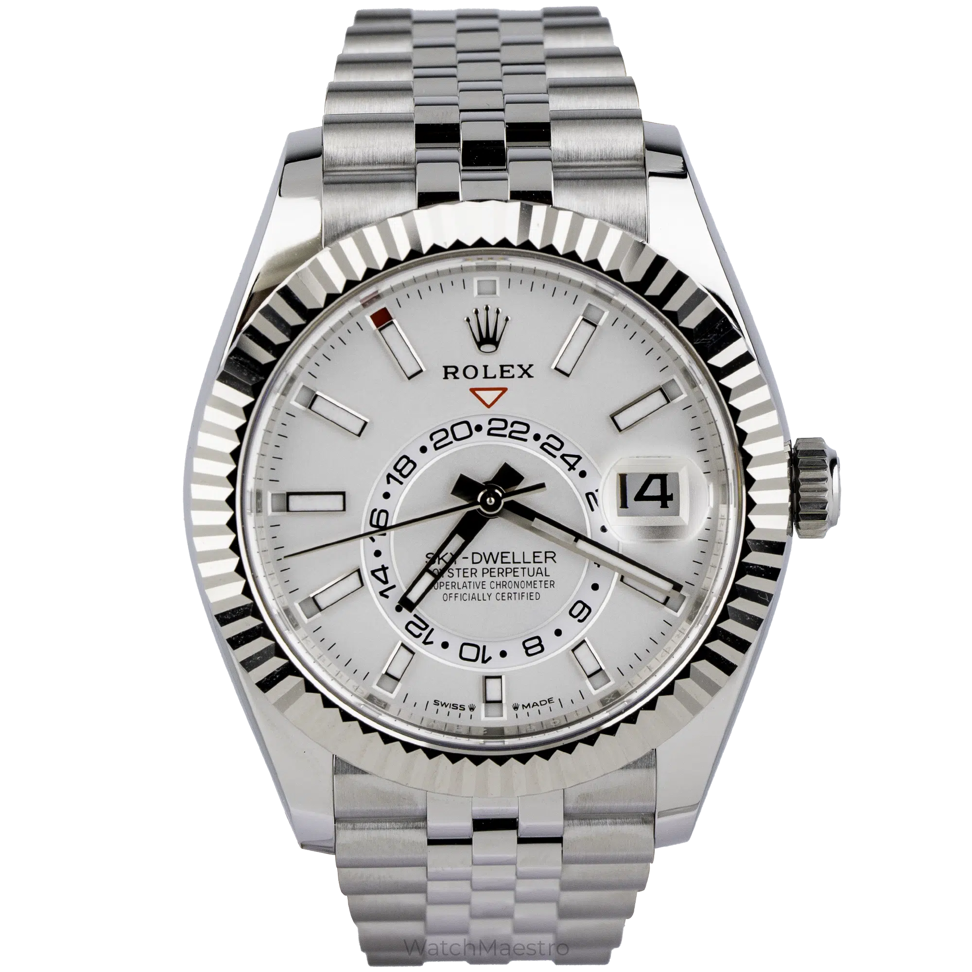 ساعة رولكس سكاي-دويلر، إحدى أكثر ساعات رولكس تعقيدًا على الإطلاق، متوفرة الآن بميناء أبيض ساحر. علبتها المصنوعة من الفولاذ المقاوم للصدأ بقطر 42 مم، ومُحاطة بسوار جوبيلي. كما تتميز هذه الساعة من رولكس، رقمها المرجعي 336934، بإطار مُخدّد من الذهب الأبيض. تم شراؤها عام 2025، وهي لا تزال جديدة كليًا، وتأتي مع علبتها وأوراقها، مما يؤكد أصالتها.