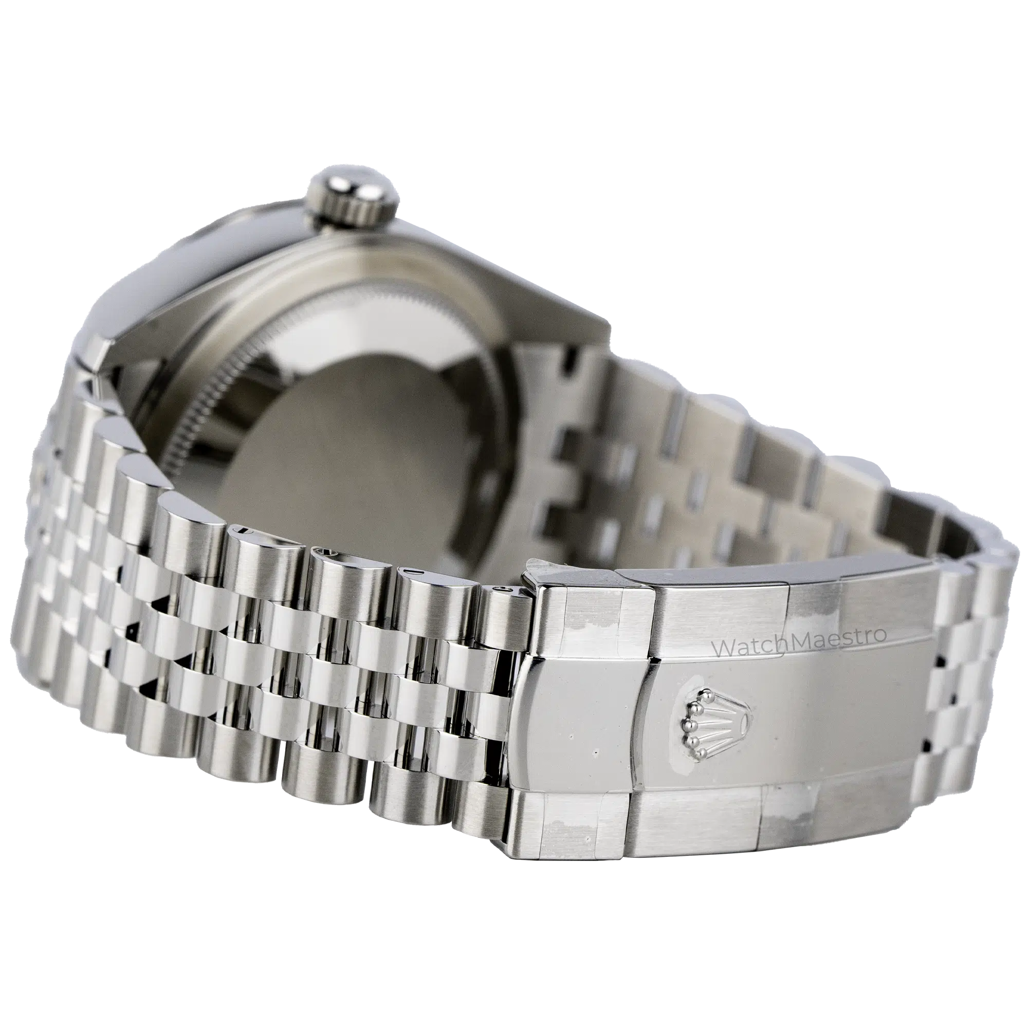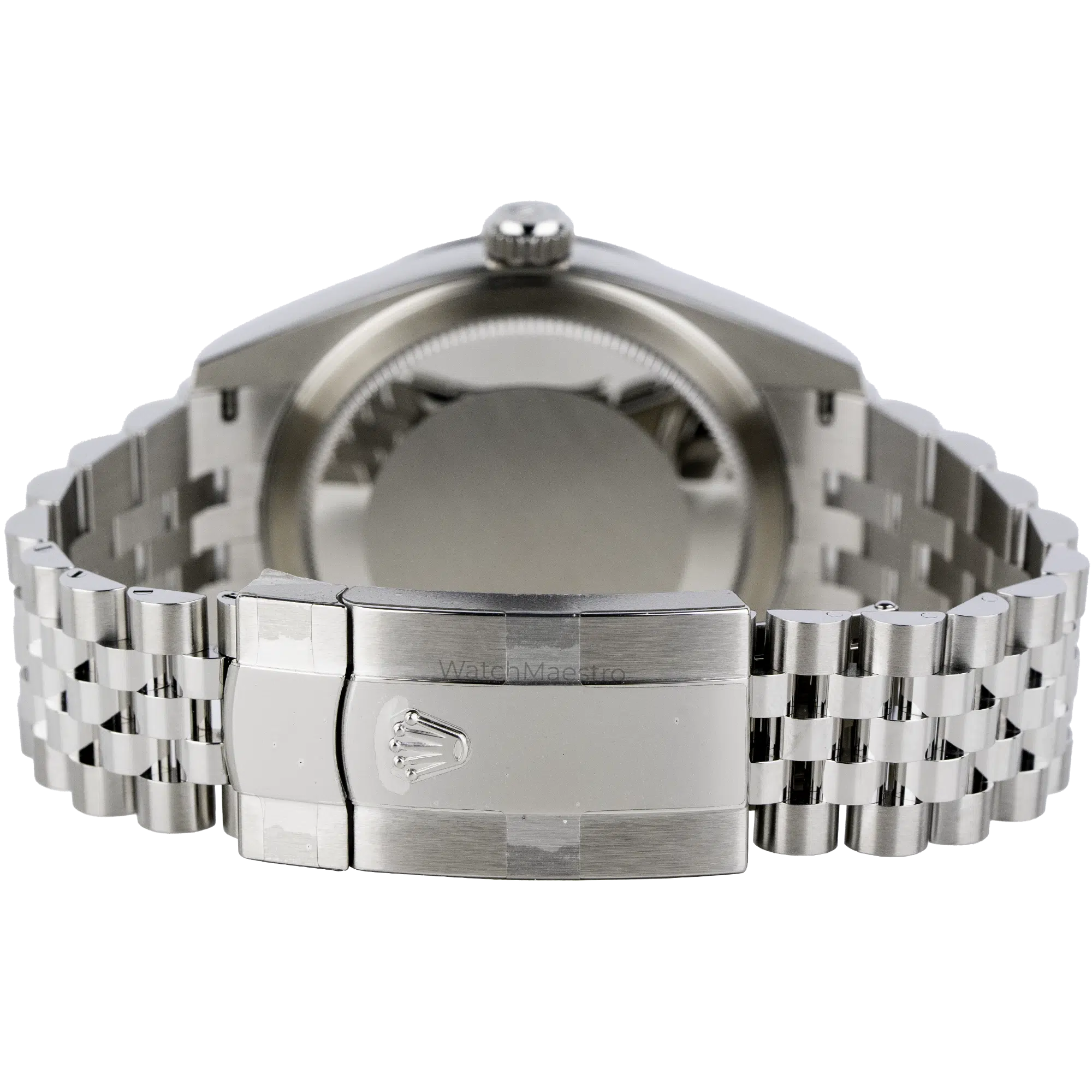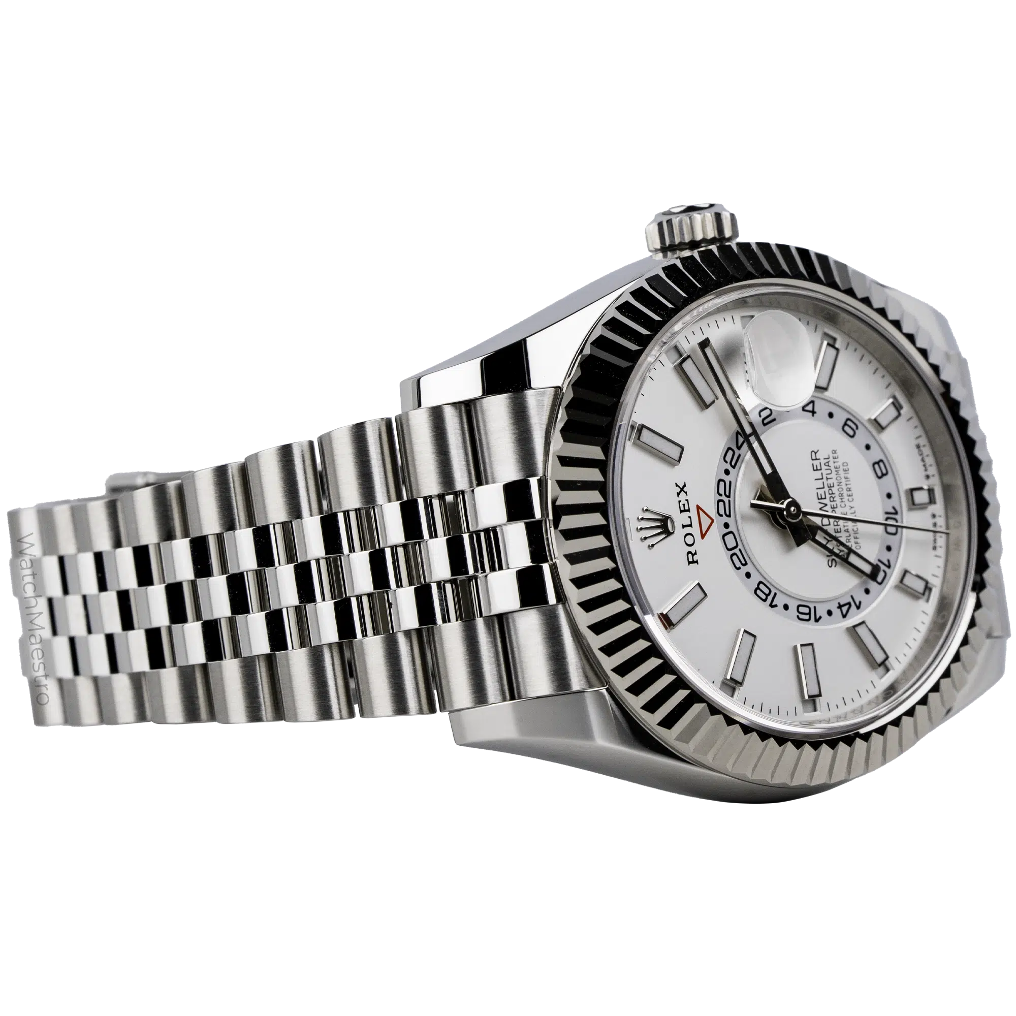 ساعة رولكس سكاي-دويلر، إحدى أكثر ساعات رولكس تعقيدًا على الإطلاق، متوفرة الآن بميناء أبيض ساحر. علبتها المصنوعة من الفولاذ المقاوم للصدأ بقطر 42 مم، ومُحاطة بسوار جوبيلي. كما تتميز هذه الساعة من رولكس، رقمها المرجعي 336934، بإطار مُخدّد من الذهب الأبيض. تم شراؤها عام 2025، وهي لا تزال جديدة كليًا، وتأتي مع علبتها وأوراقها، مما يؤكد أصالتها.