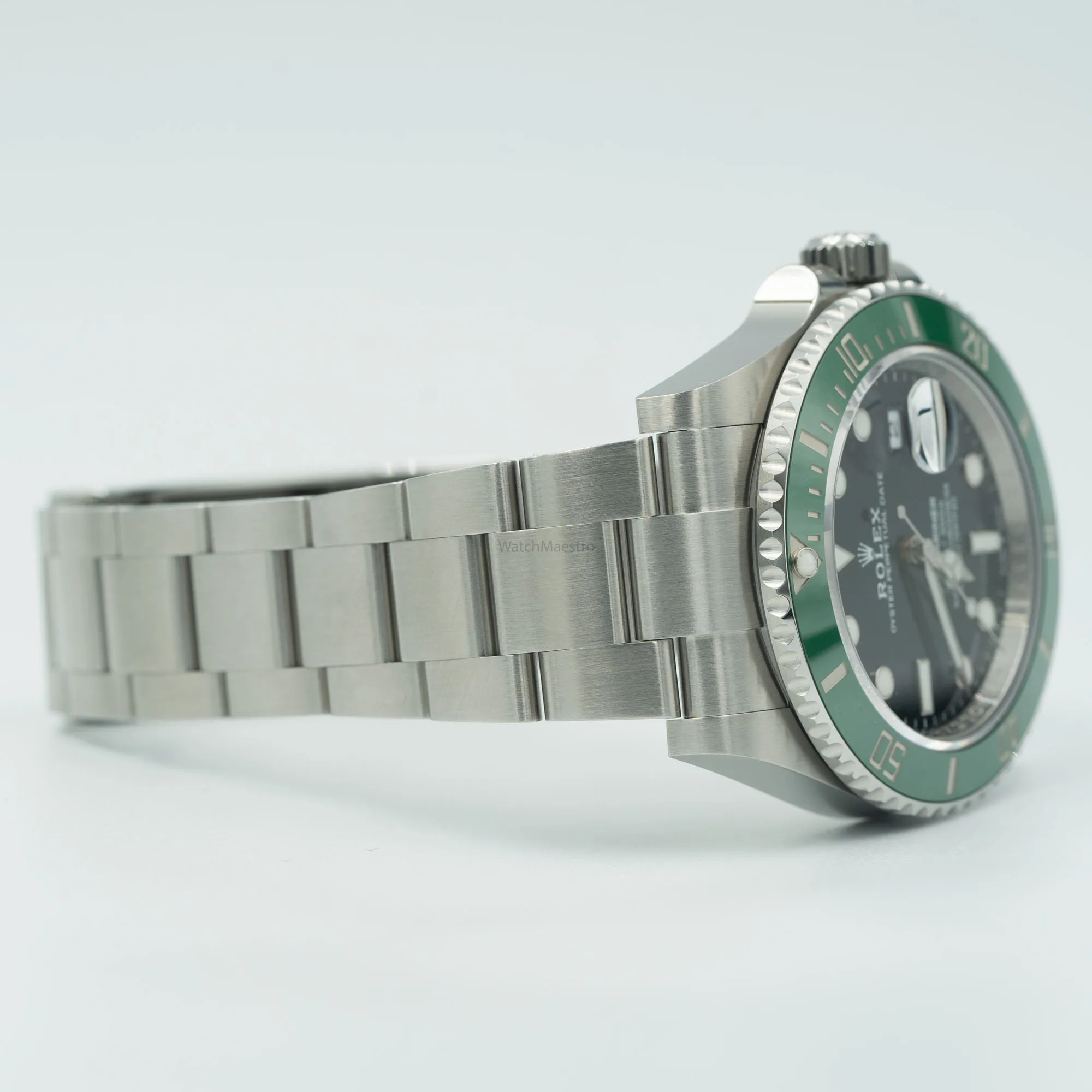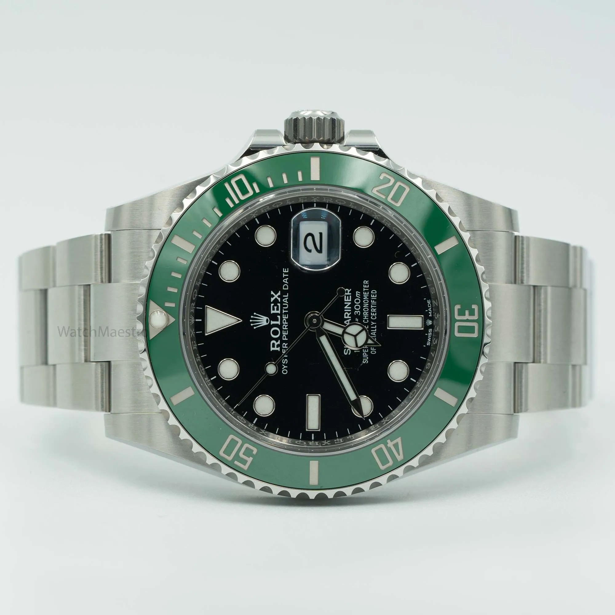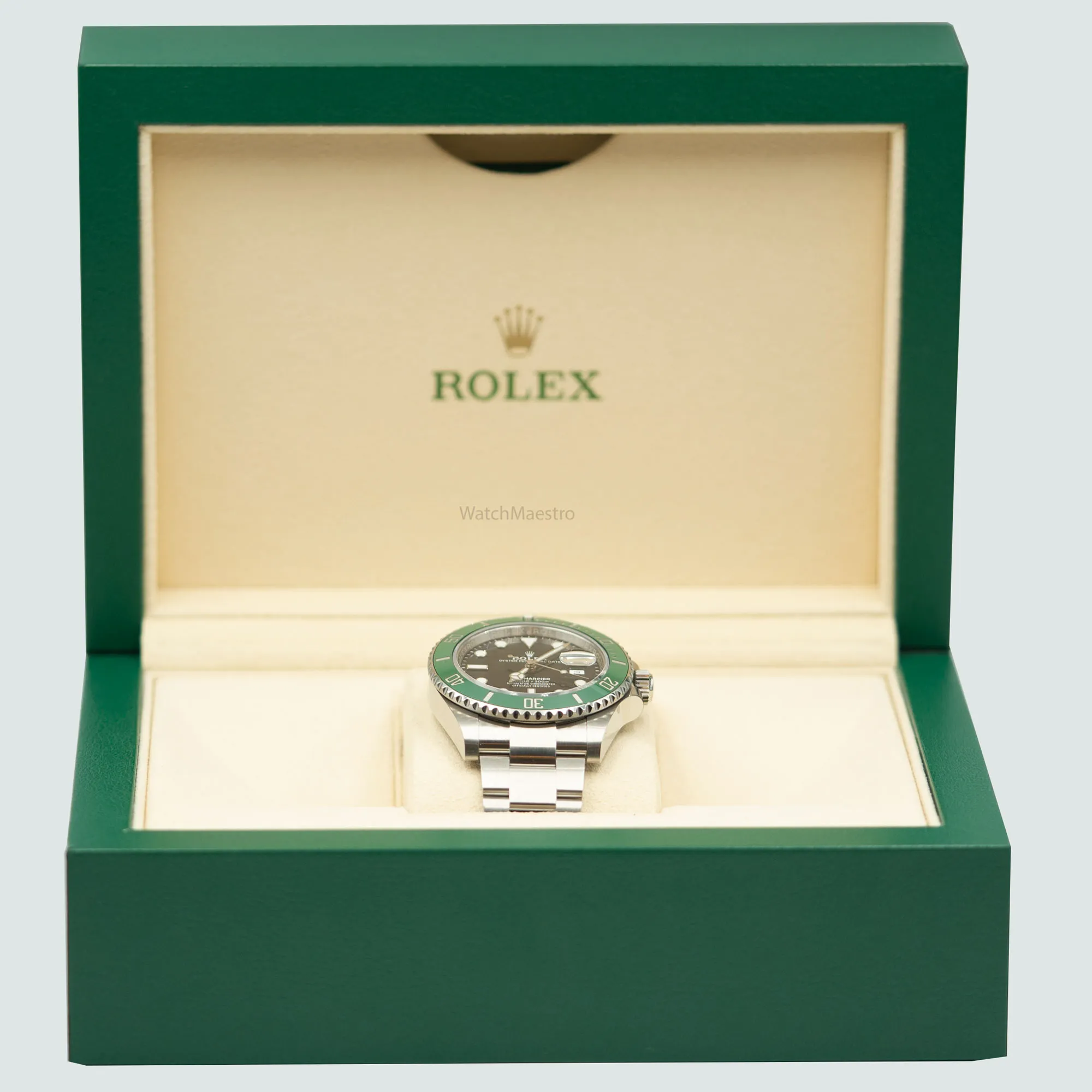 This Rolex Submariner Starbucks is brand new and is presented with its display box. The purchase year of the watch is 2022 and is preserved in pristine condition. It retains all the factory stickers along with the necessary documents to certify its authenticity.