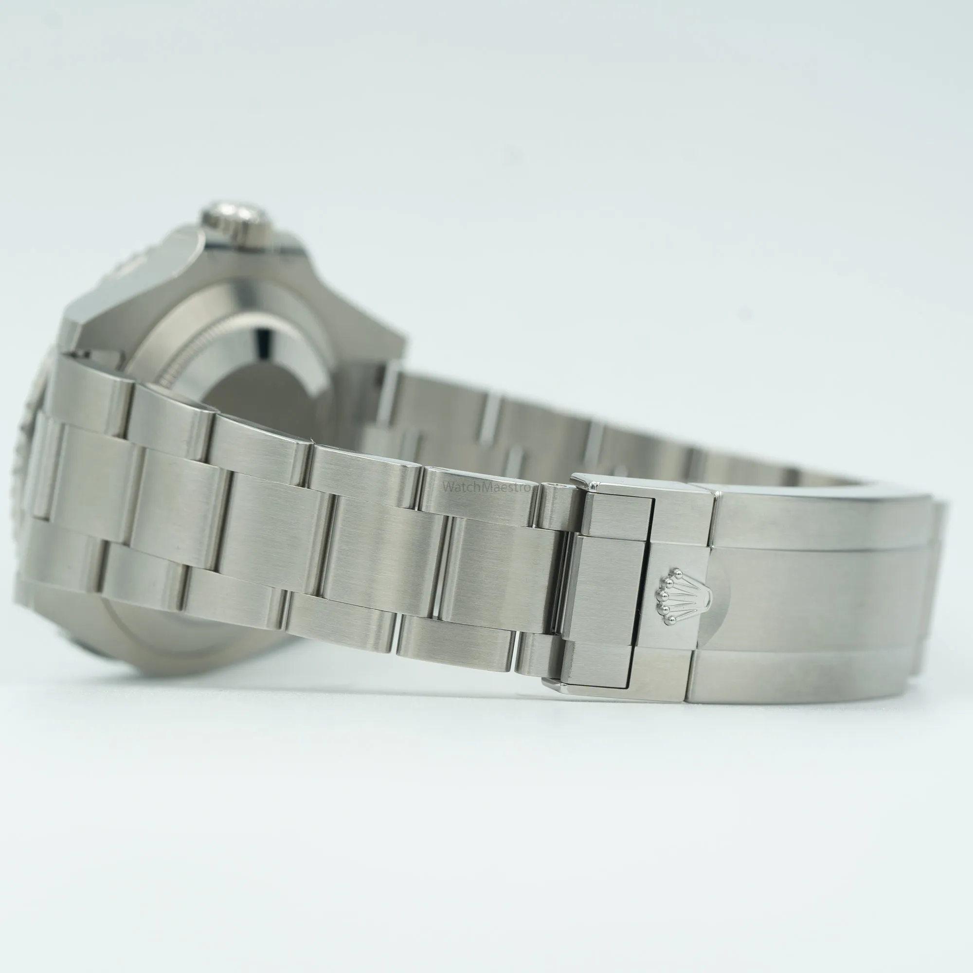 A 41mm case is featured for the first time in the history of the Rolex Submariner 126610LV, also known as Rolex Starbucks. The distinctive design incorporates a green “Cerachrom” ceramic bezel, making it a favorite amongst collectors. The watch gets a more streamlined and seamless look with a revised lug profile and wider bracelet. Housed inside the 300m waterproof case is Rolex’s latest generation caliber 3235. The power reserve is rated at 70 hours and provides the wearer with up to 20mm of incremental tool-free adjustment.