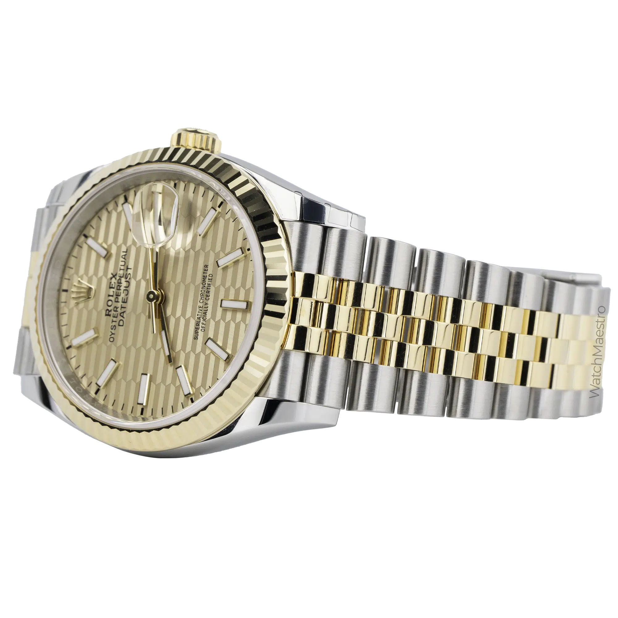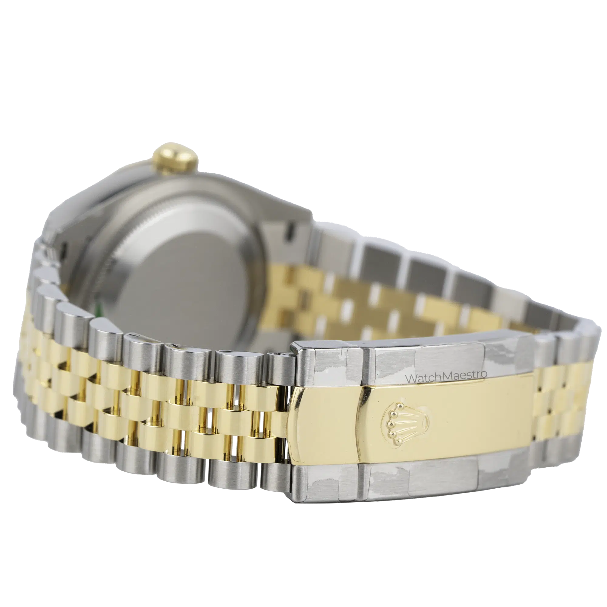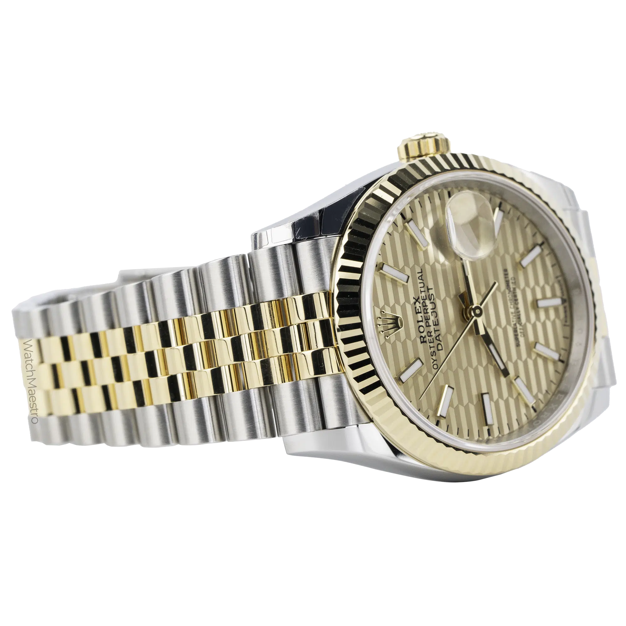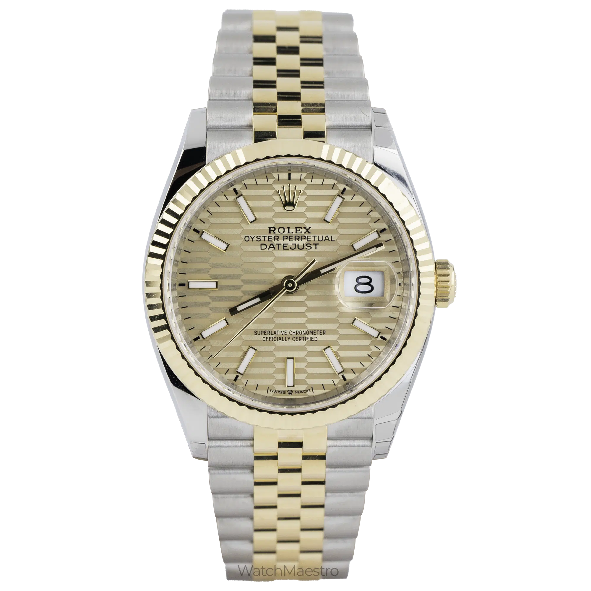 This is the Rolex Datejust in its 36mm avatar featuring a Champagne Motif. The dial has now been discontinued making it even more desirable than before. The watch is crafted out of 18kt Yellow Gold and Stainless Steel, to which the Champagne dial serves as a great backdrop. The Jubilee Bracelet and the Fluted Bezel further lift up the style of the watch. Being 36mm, this watch is considered a Unisex model so both men and women can enjoy wearing it. Purchased in 2024, the watch comes complete with box and papers, sheltered under the Rolex warranty. The watch has never been worn before and it even has a few factory stickers on it.