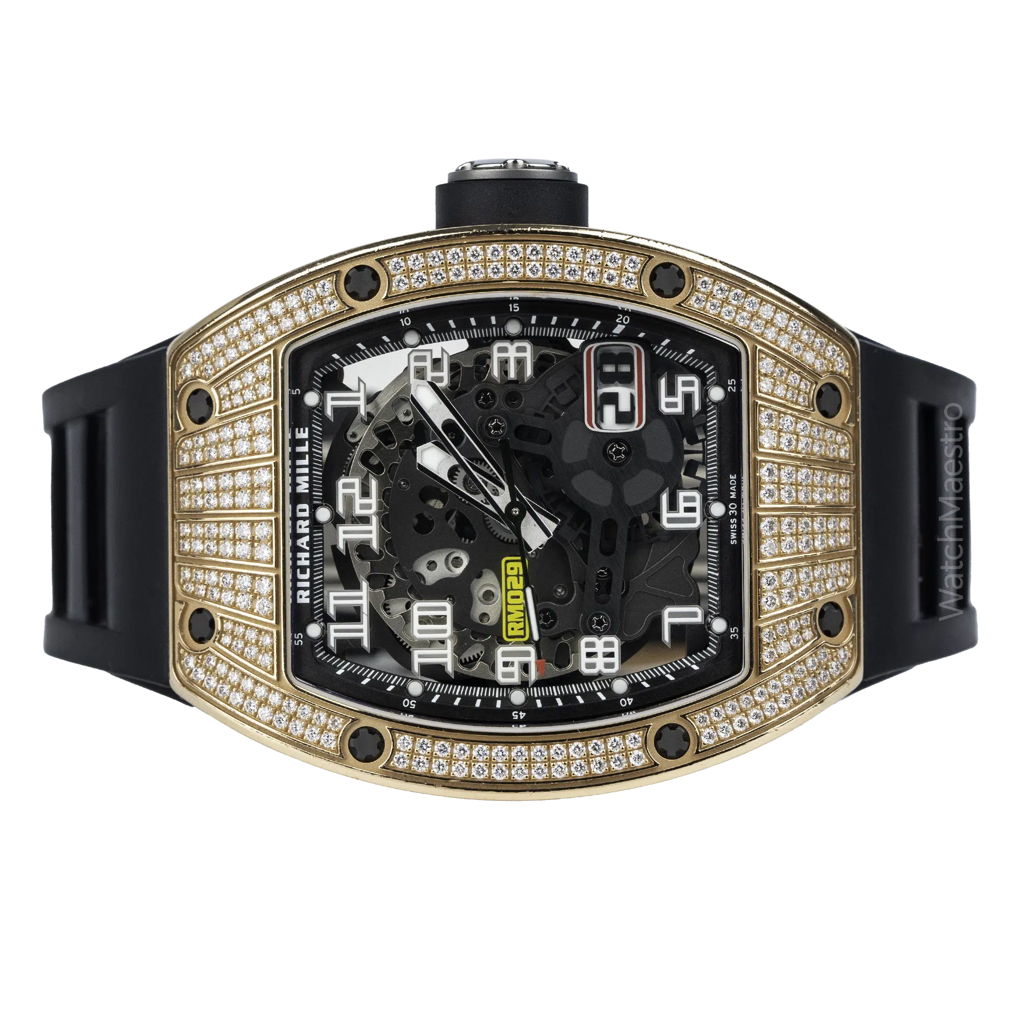 Get more attention at your wrist with the Richard Mille RM 029—a fusion of precious materials and top-notch design. Especially with the factory-set diamonds, this is a watch that is very hard to come across. So, what are you waiting for? Add this beast to your collection today!