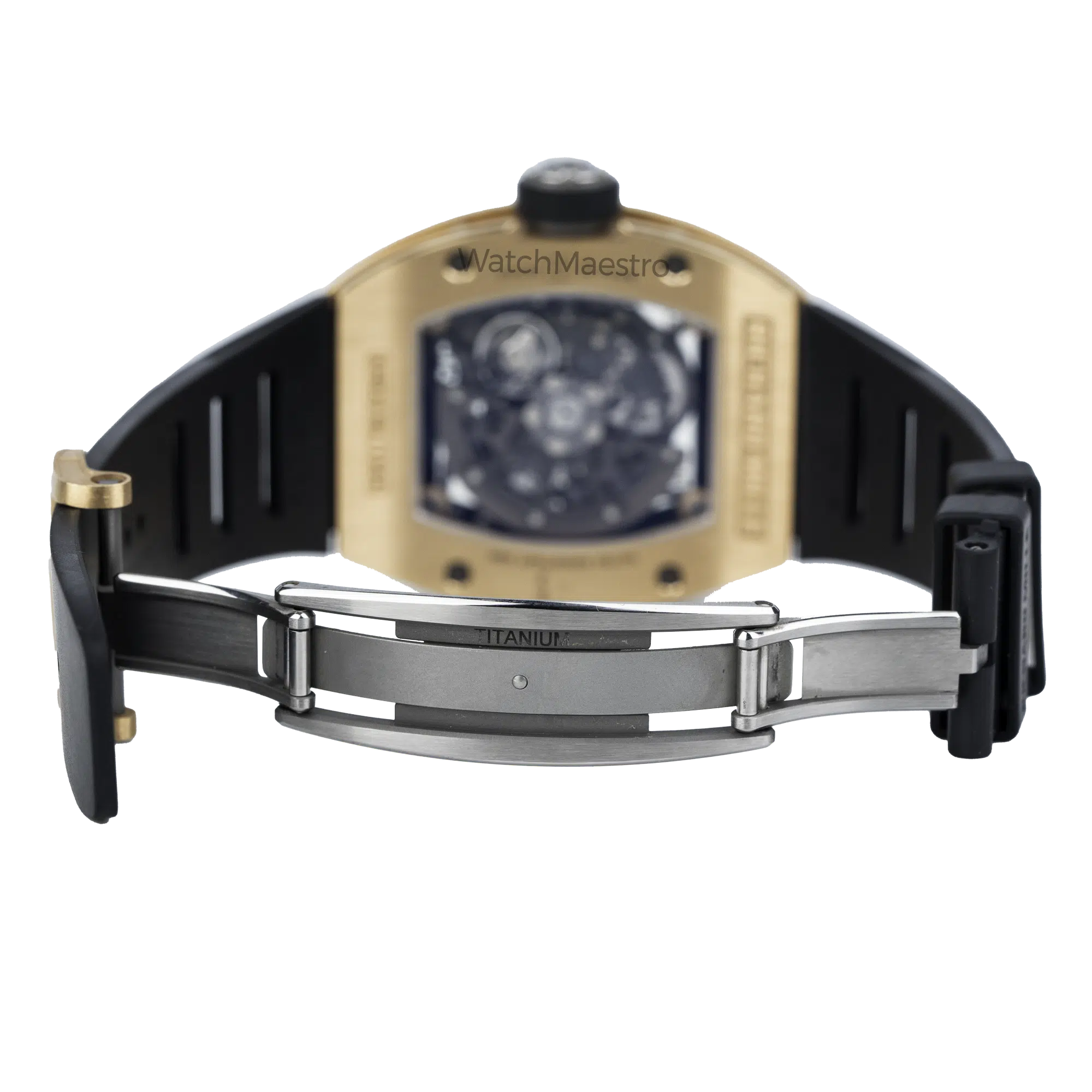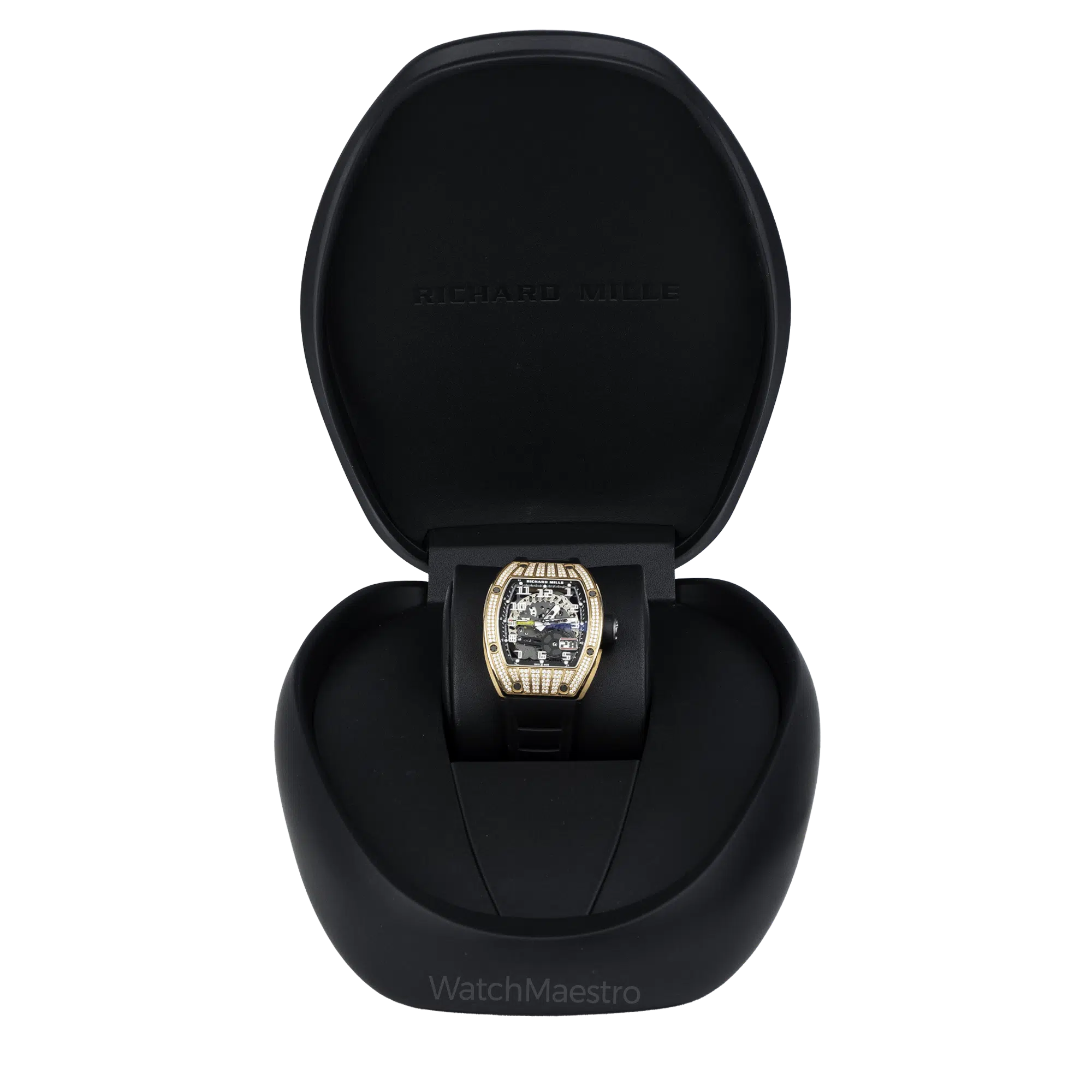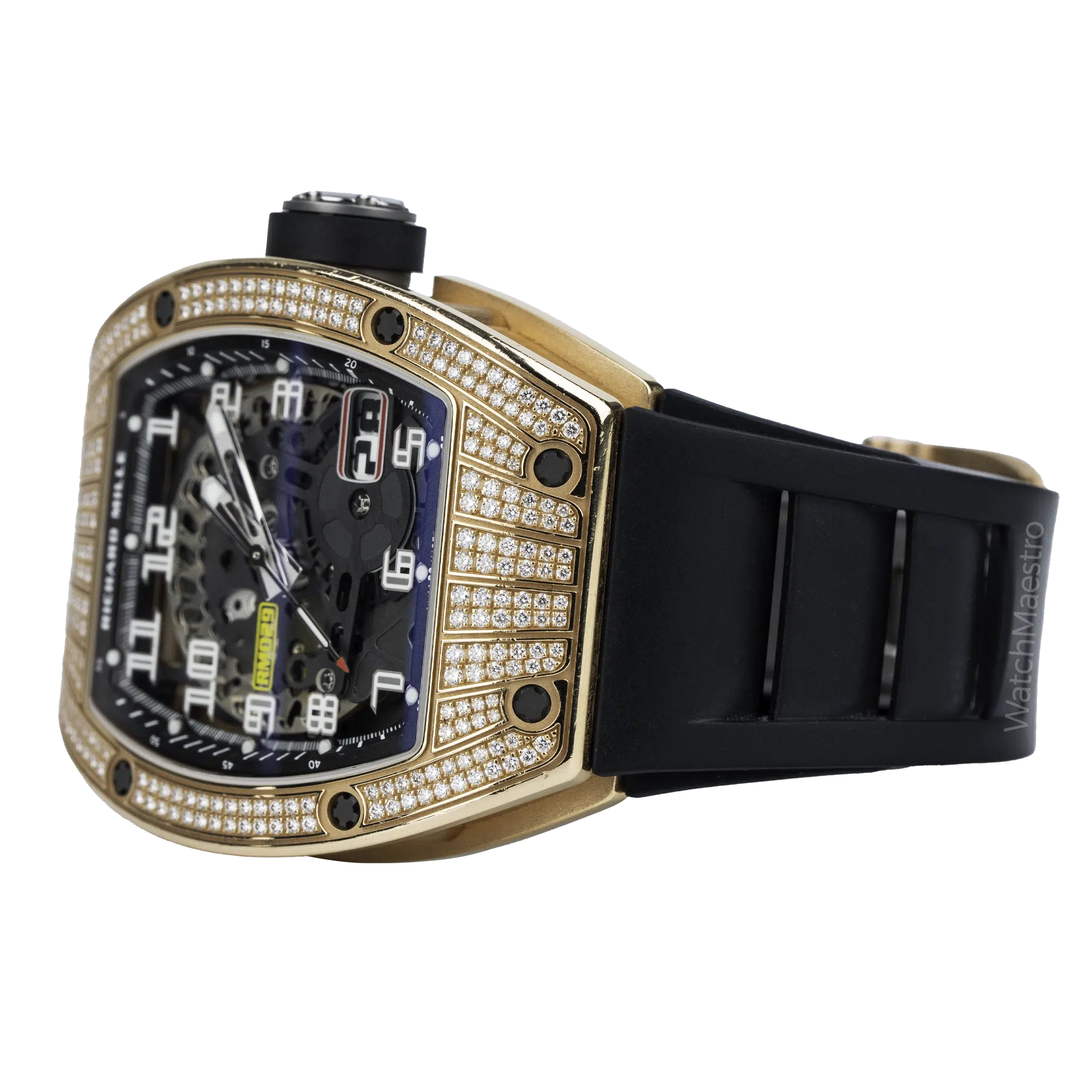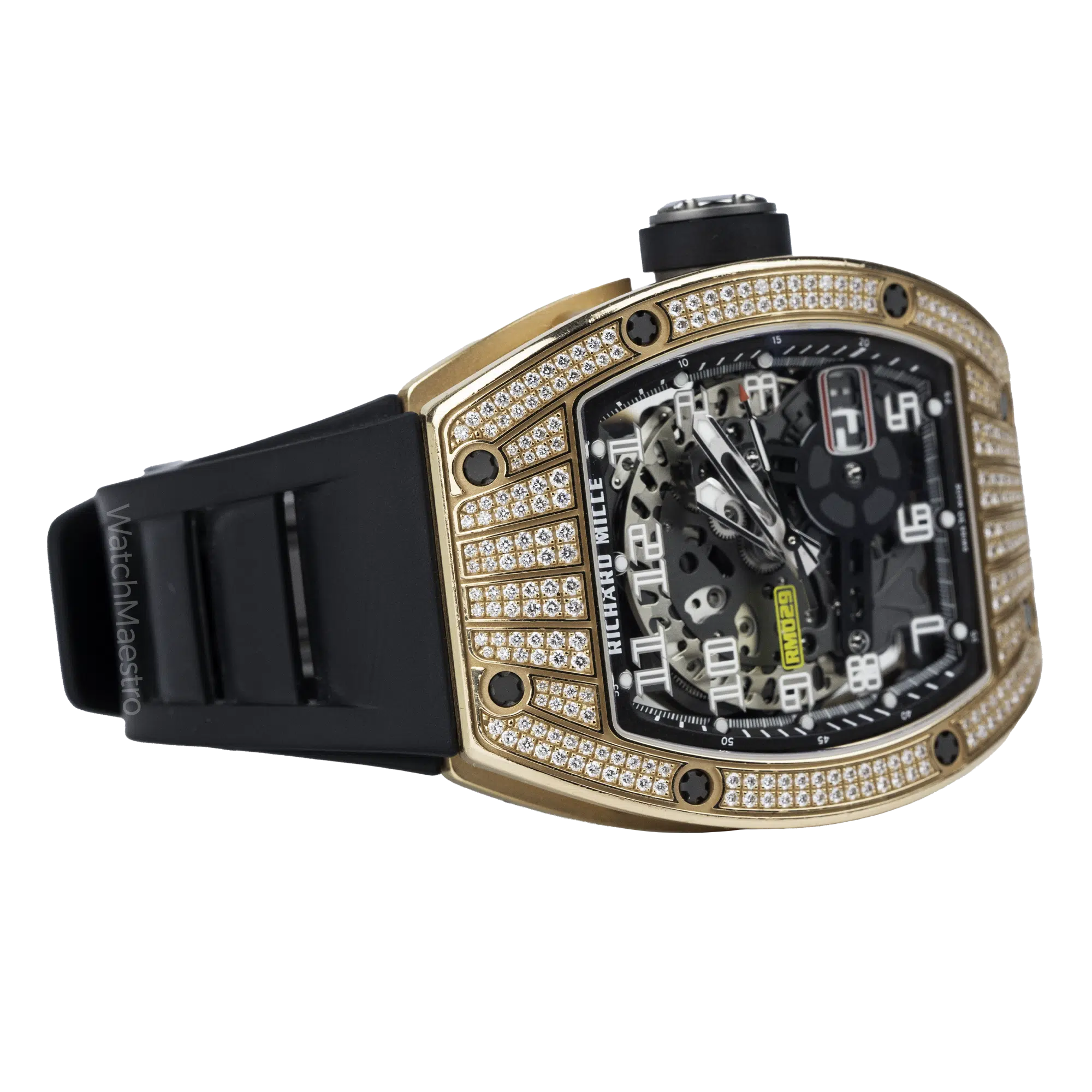 Invest in best of what the world of luxury watches has to offer – the Richard Mille RM 029. It is a timepiece that seamlessly combines sophistication with cutting-edge . Currently available at WatchMaestro, this particular watch features a Rose Gold case with Factory-set Diamonds on it. Purchased in 2021, the watch comes complete with box and papers. Even though the watch has been used, it is still in a great condition. Designed for both comfort and style, the watch comes with a Black Rubber Strap that complements the Rose Gold case flawlessly. The Titanium Buckle not only ensures a secure fit but also adds a feather-light touch, enhancing the overall wearability of this timepiece.