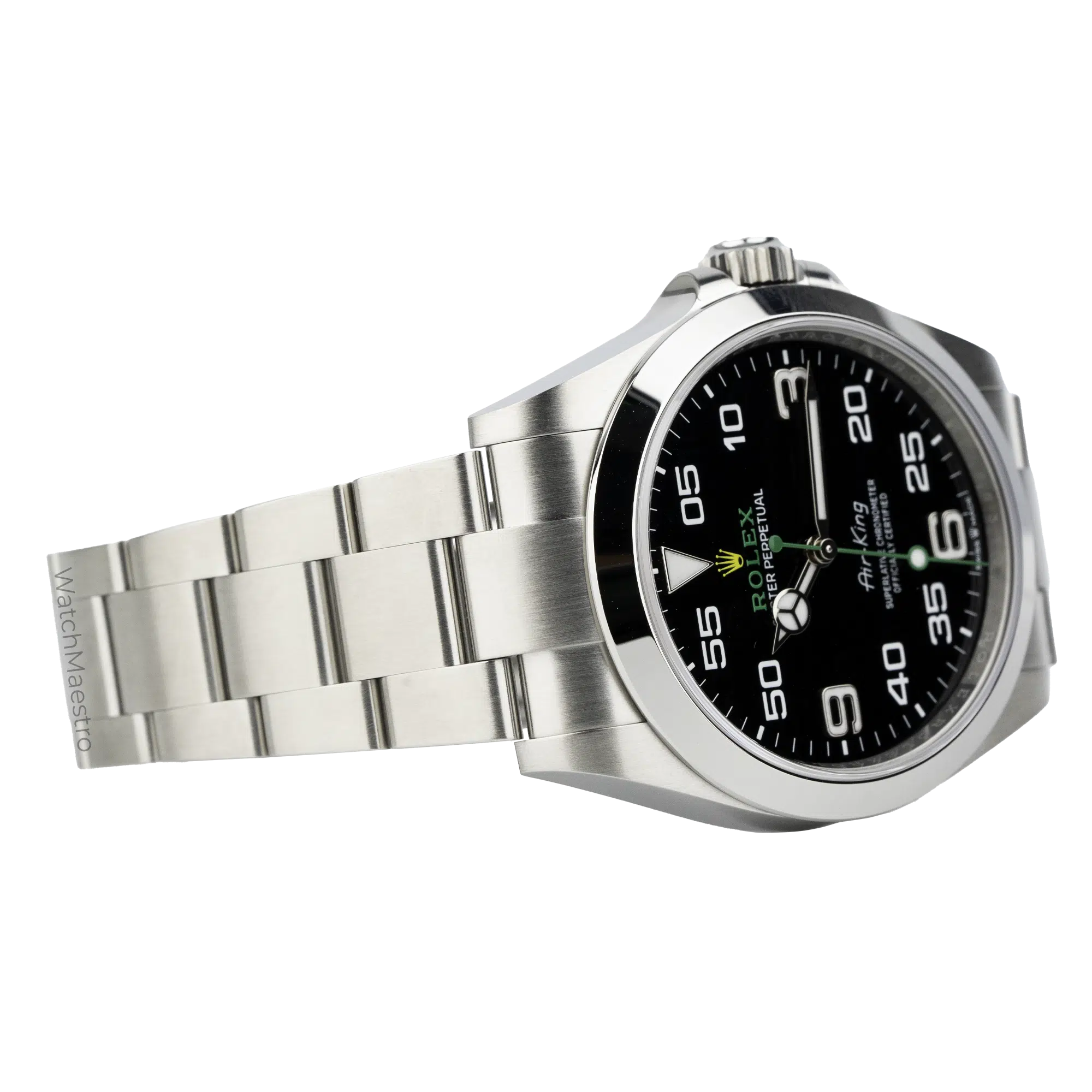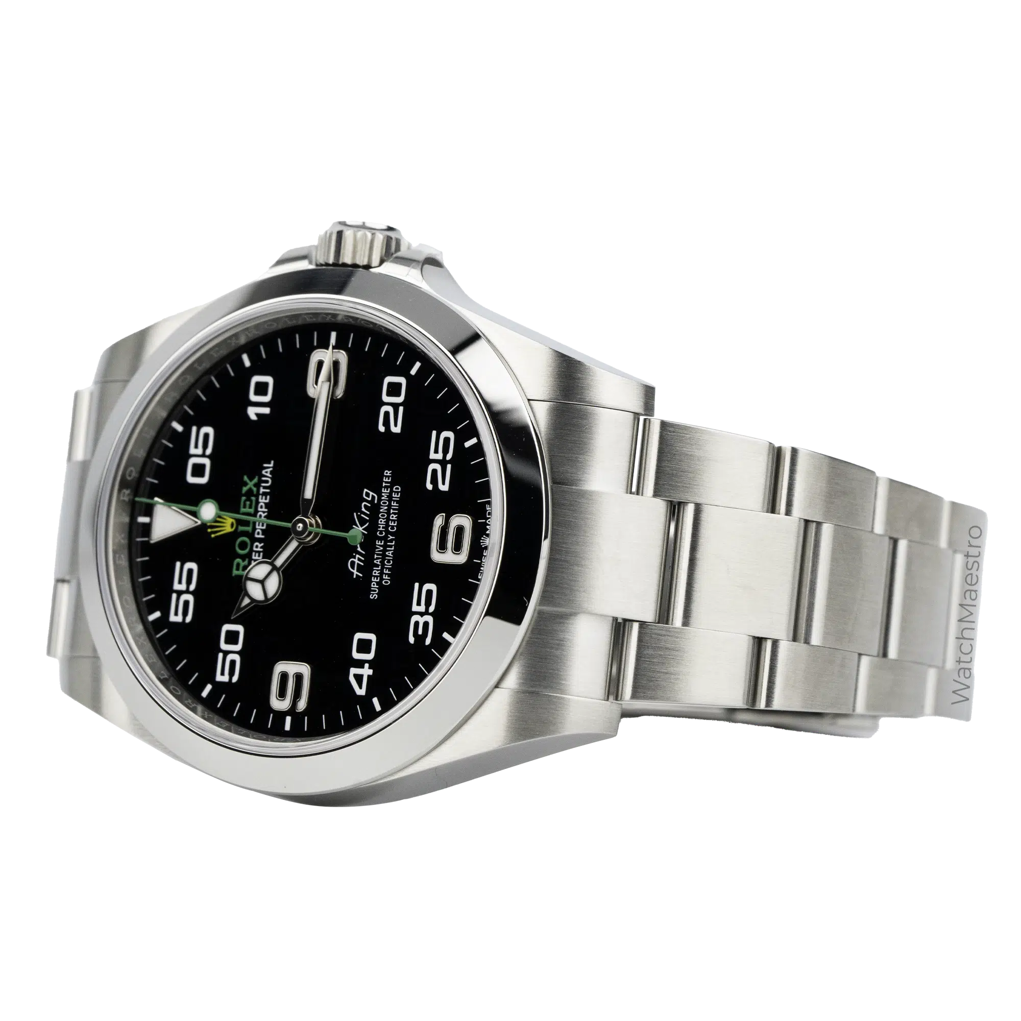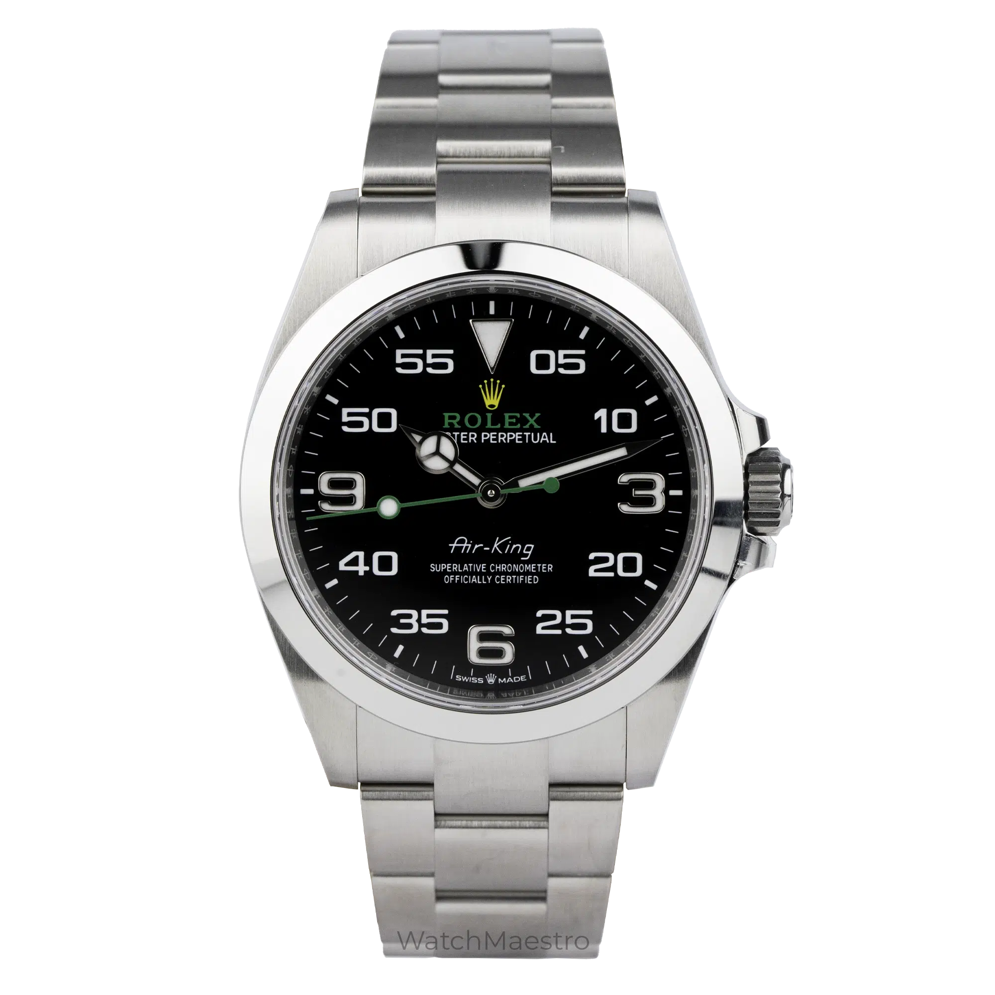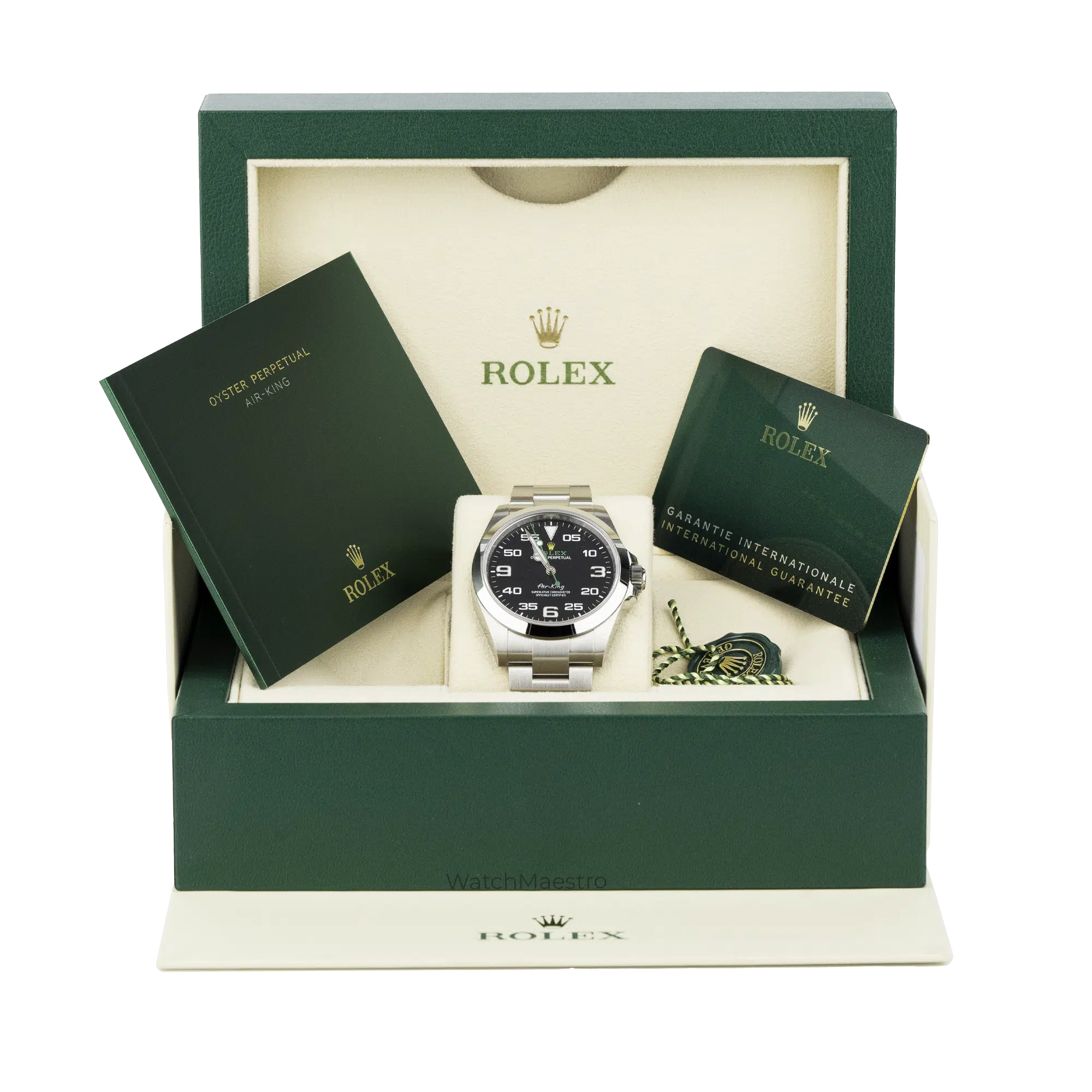 Introducing the brand-new Rolex Air King featuring a 40mm Black Dial. Freshly purchased in 2024, the watch comes complete with its original box and the green Rolex warranty card, with full 5-year Rolex warranty. This is the newer reference 126900, and it comes with crown guards making the watch more durable than before. On top of that, Rolex has changed the number ‘5’ to ’05’ just to make way for better symmetry. This is the perfect entry-level watch for someone who is starting their watch collection.