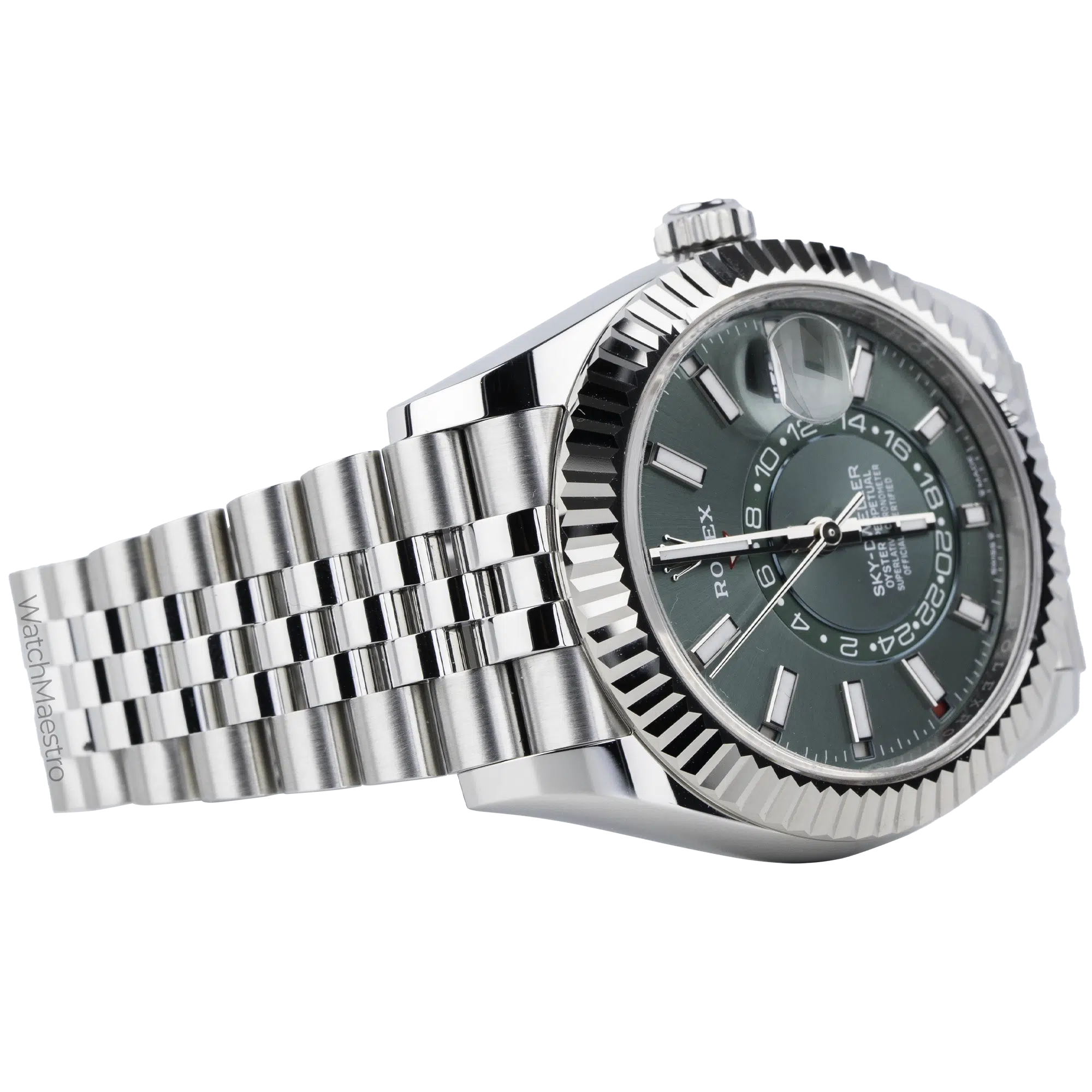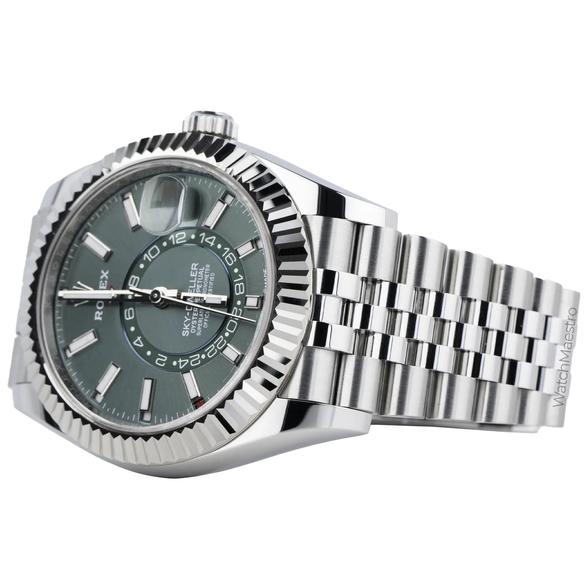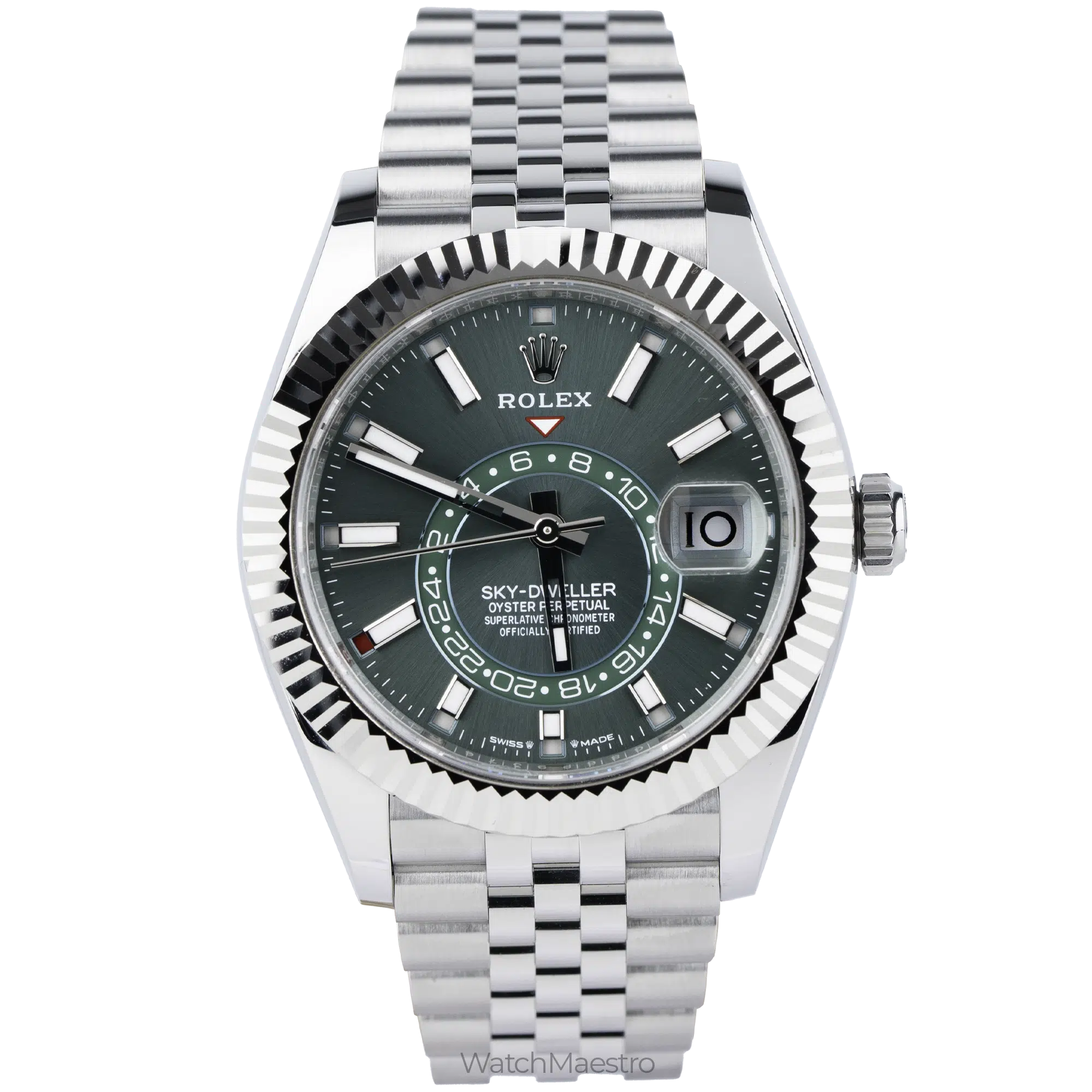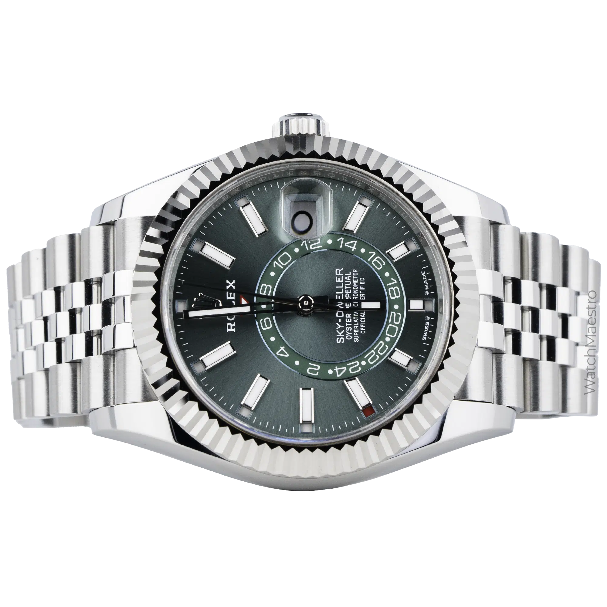This Rolex Sky-Dweller with Green Dial and Jubilee bracelet is extremely difficult to find. It is a relatively newer addition to the Sky-Dweller lineup, which means this is your chance to stand out. It features a commanding 42mm Green Dial, which is a visual delight and a functional powerhouse, displaying dual time zones and an annual calendar. The watch flaunts a Stainless Steel Case with a White Gold Fluted Bezel that offers a distinctive aesthetic appeal. The Jubilee Bracelet, known for its comfort and style, adds a touch of versatility to this remarkable timepiece. Acquired in 2023, this watch is brand-new and comes complete with its original box and papers.