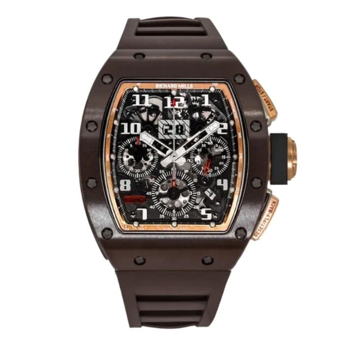 This is a pre-owned Richard Mille RM 011 Asia Brown edition in like-new condition. The timepiece looks a class apart with the whole brown ceramic case and the brown rubber strap. Purchased in 2016, the watch has been rarely used. It is a limited edition timepiece and only 50 of these were ever made.
