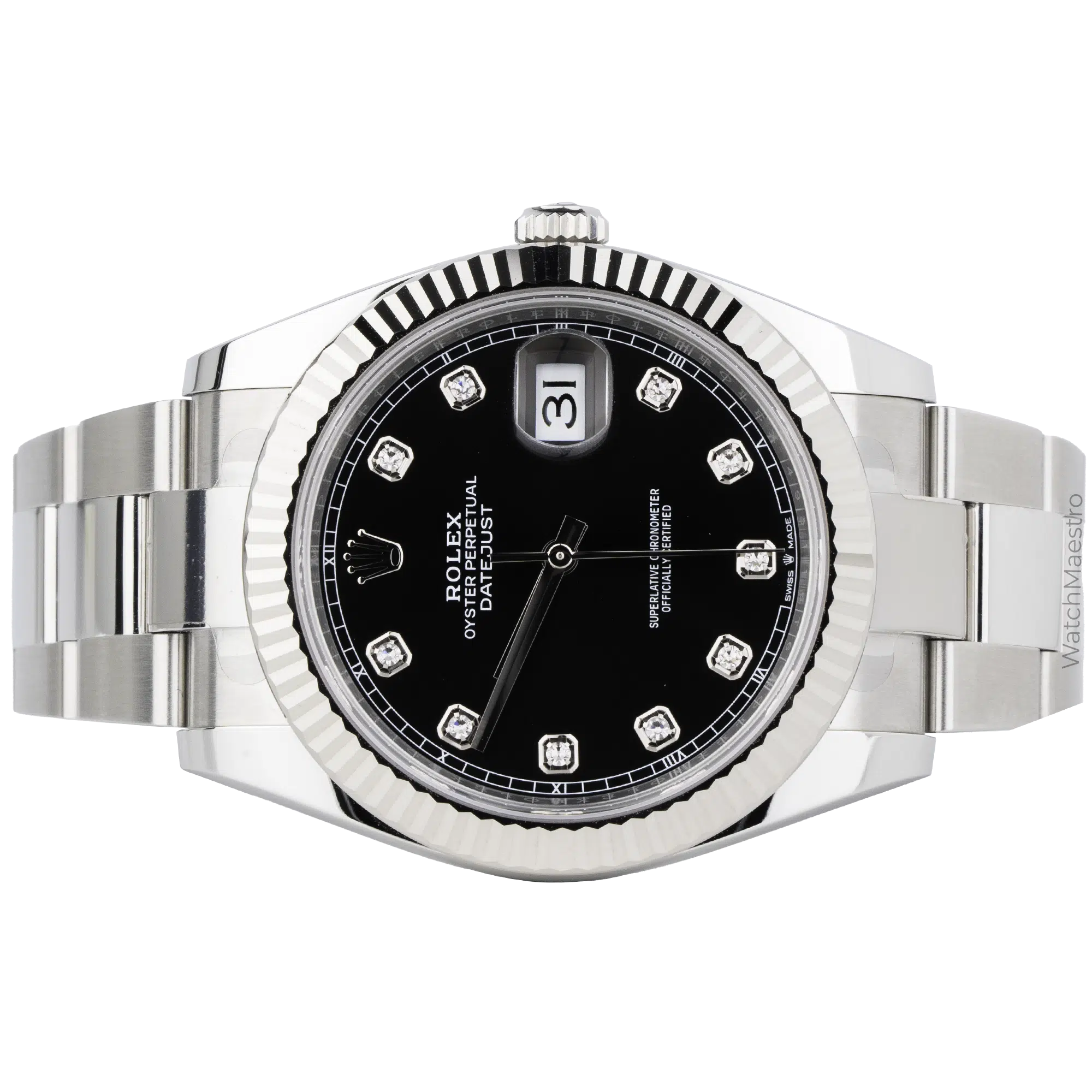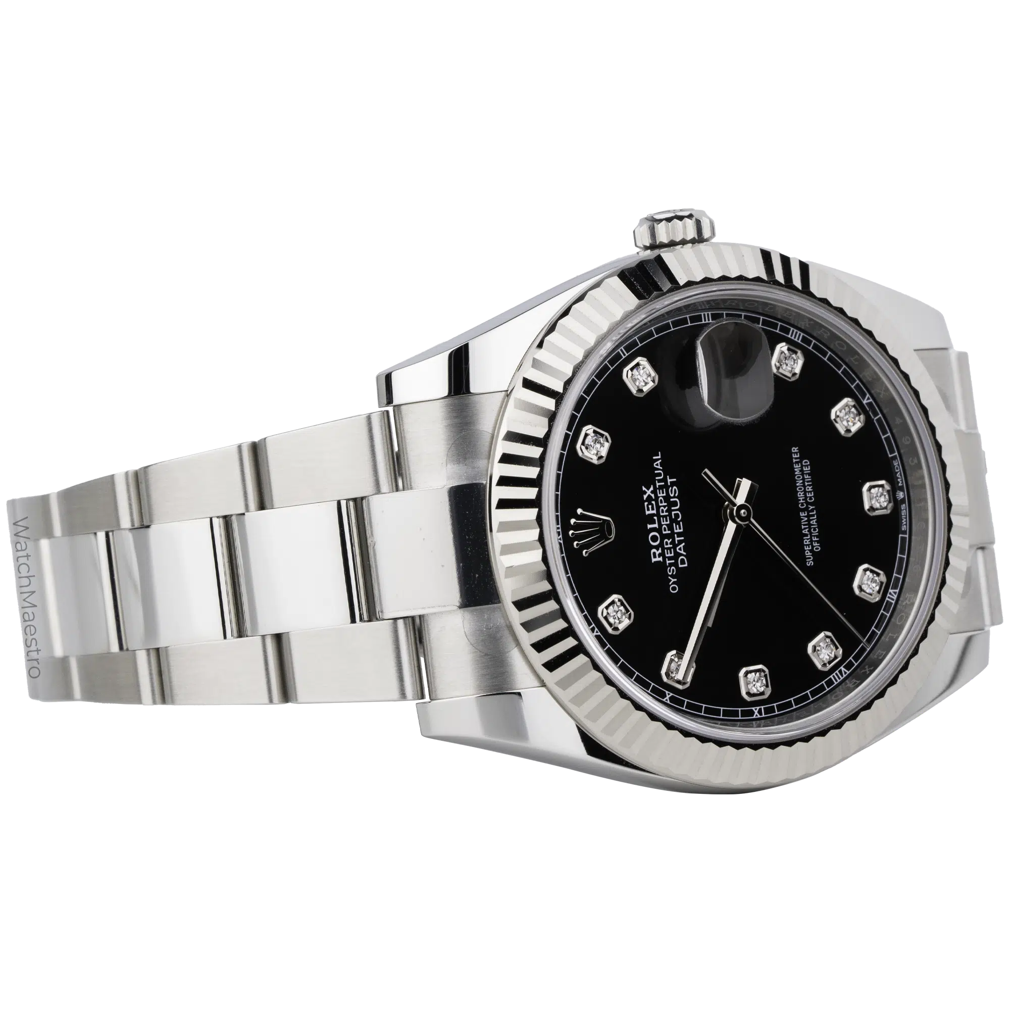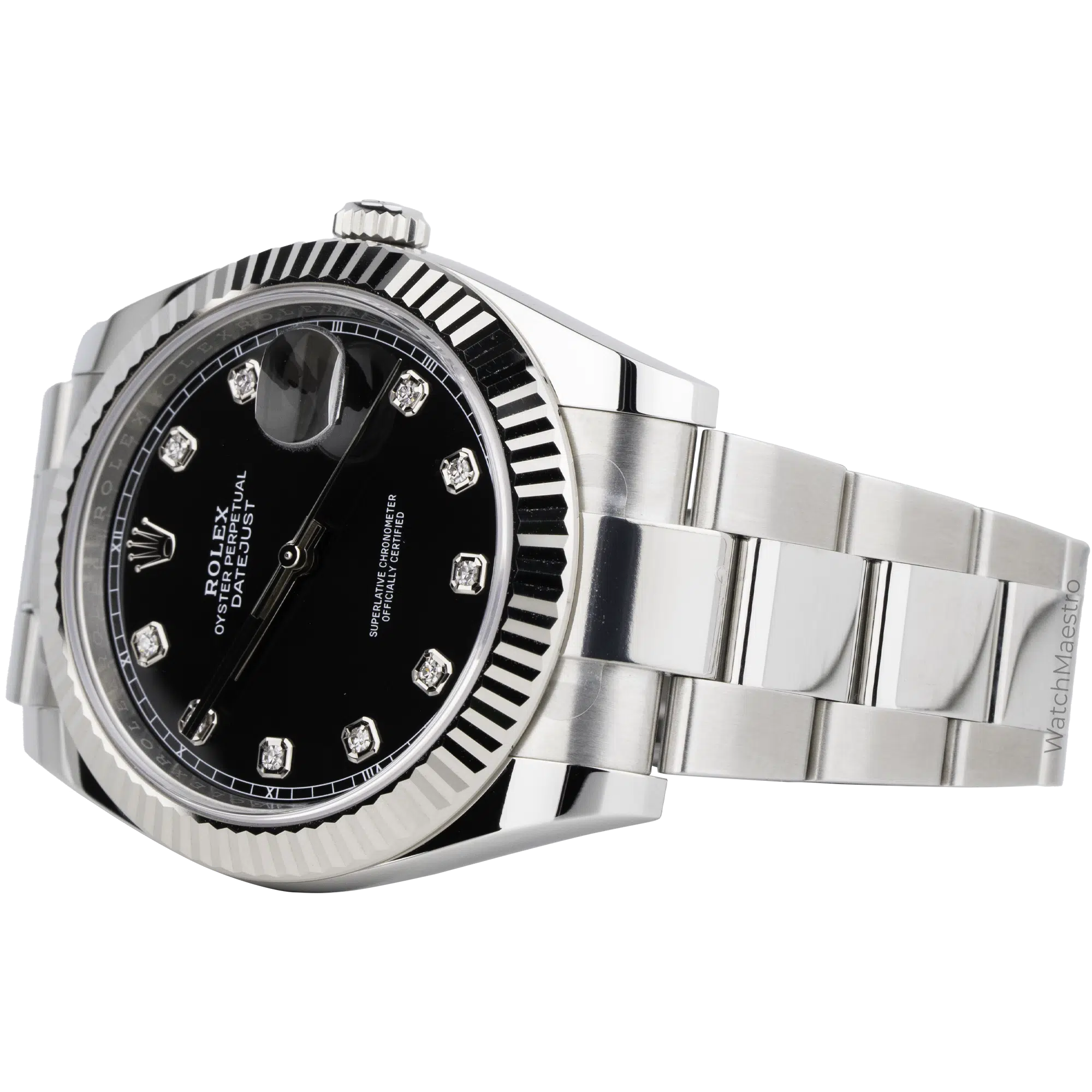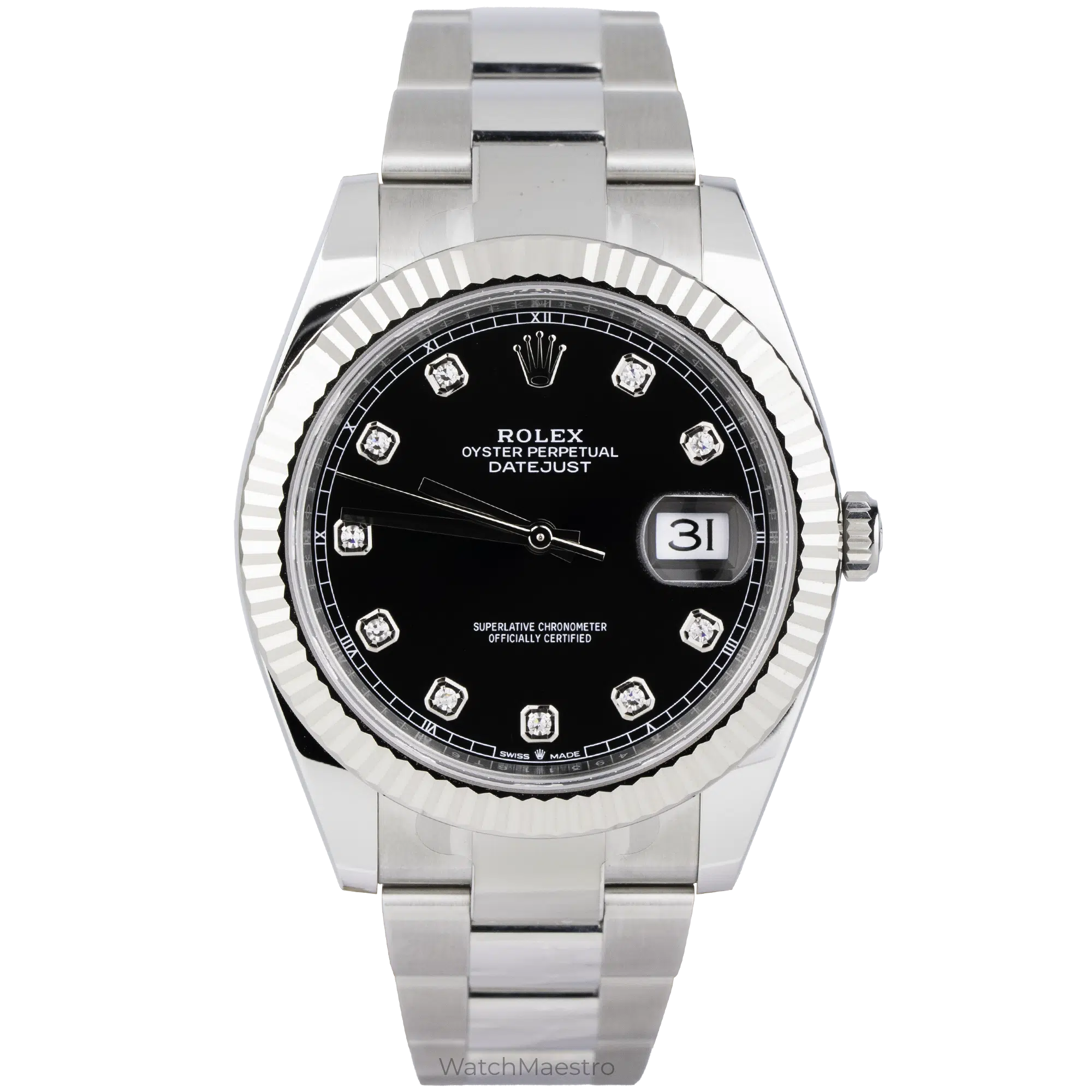 Unveil timeless sophistication with this unworn Rolex Datejust 41 featuring a Black Dial with Diamond-set hour marker. Bought in 2023, this exquisite timepiece comes complete with box and papers. The 41mm stainless steel case features a white gold fluted bezel, adding a touch of richness. This iconic watch is secured by a comfortable Oyster bracelet, ensuring all-day wearability. Not only is this timepiece unworn, but it also boasts the full Rolex warranty, providing peace of mind for years to come.