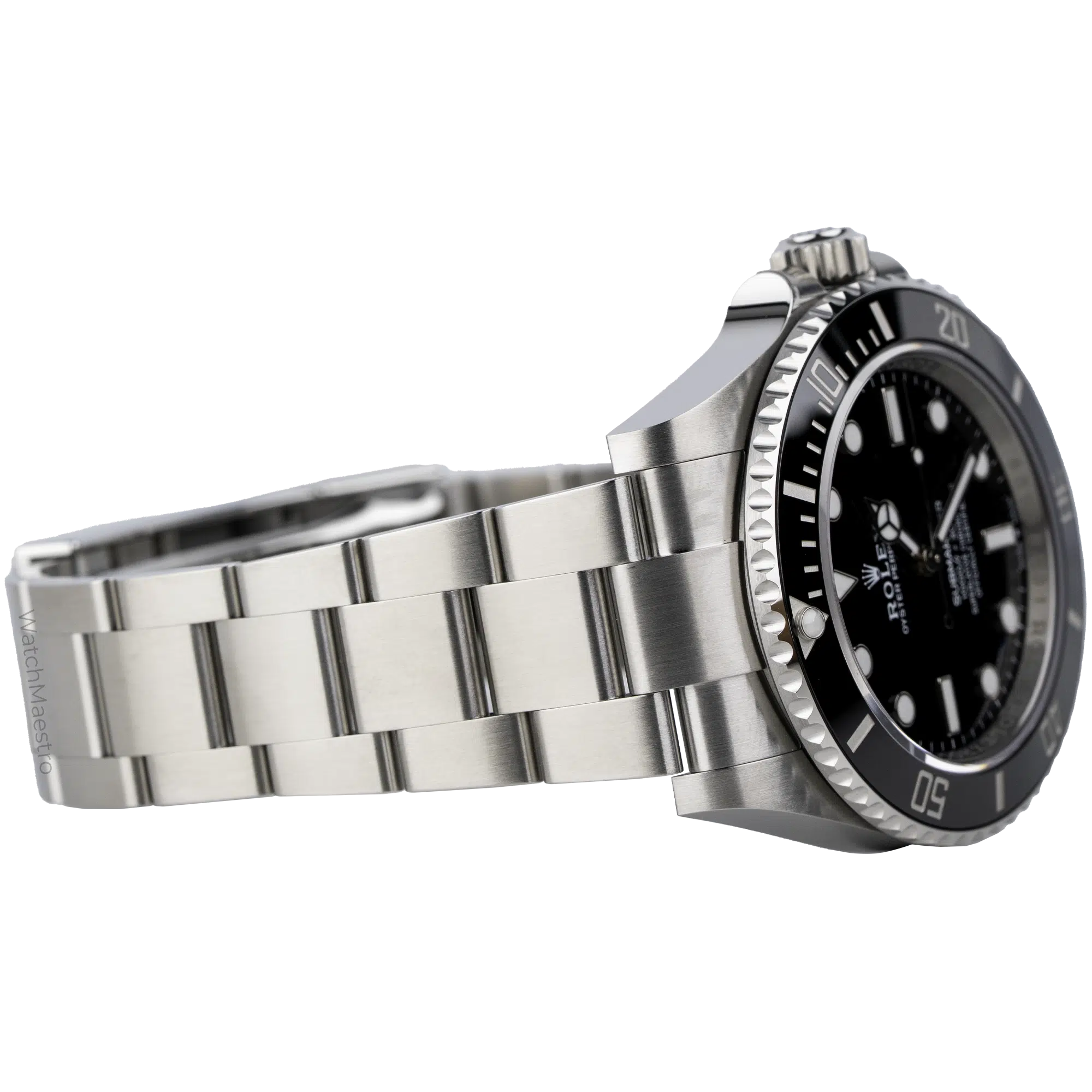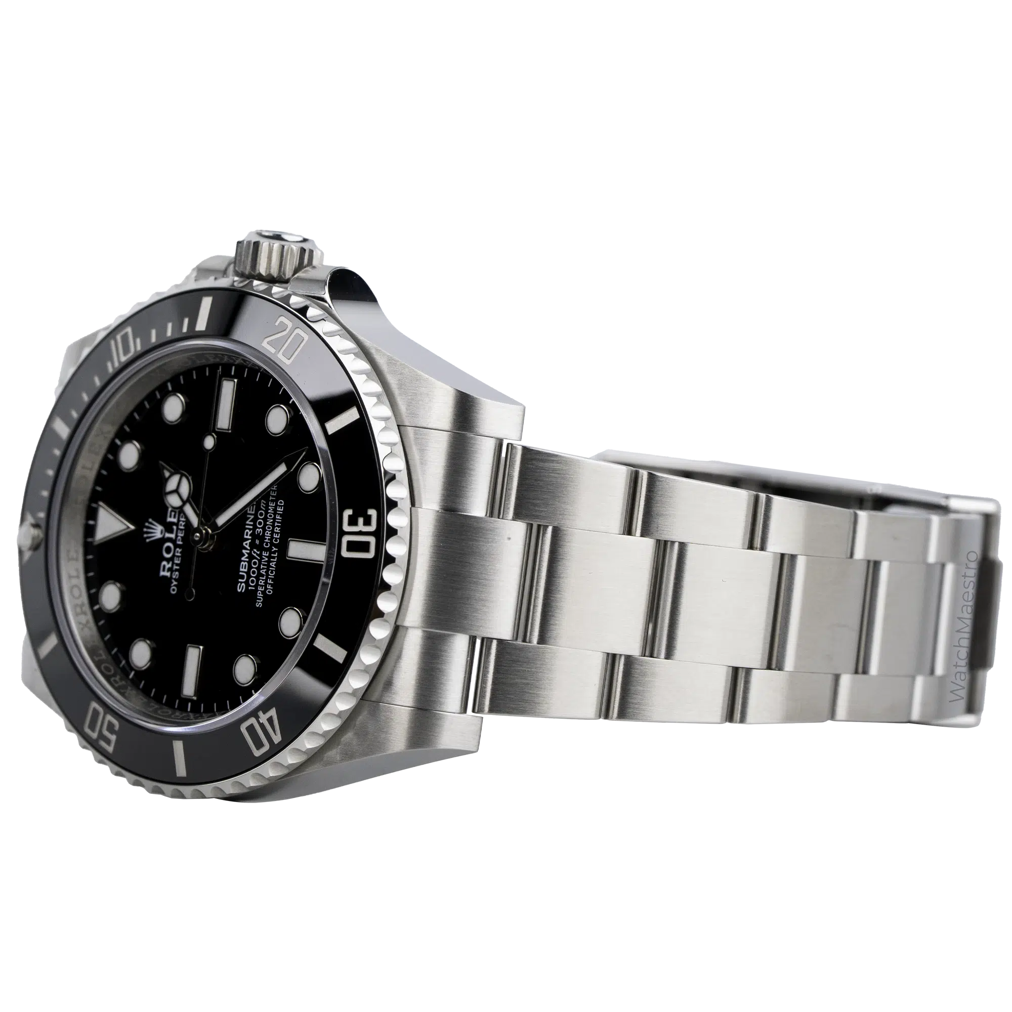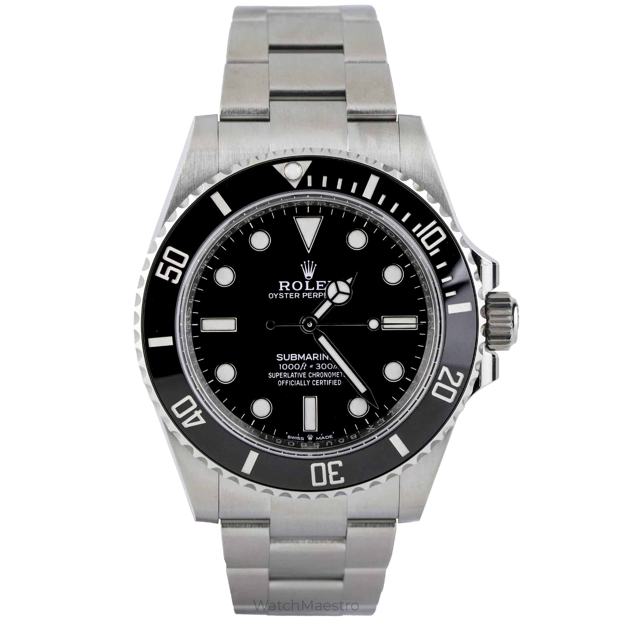 Rolex Submariner No Date reference 124060 is powered by the Calibre 3230 movement, offering a power reserve of up to approximately 70 hours. The watch is rated to be waterproof for up to 300 meters. It features a unidirectional rotatable bezel and a matte-finish stainless steel Oyster bracelet.