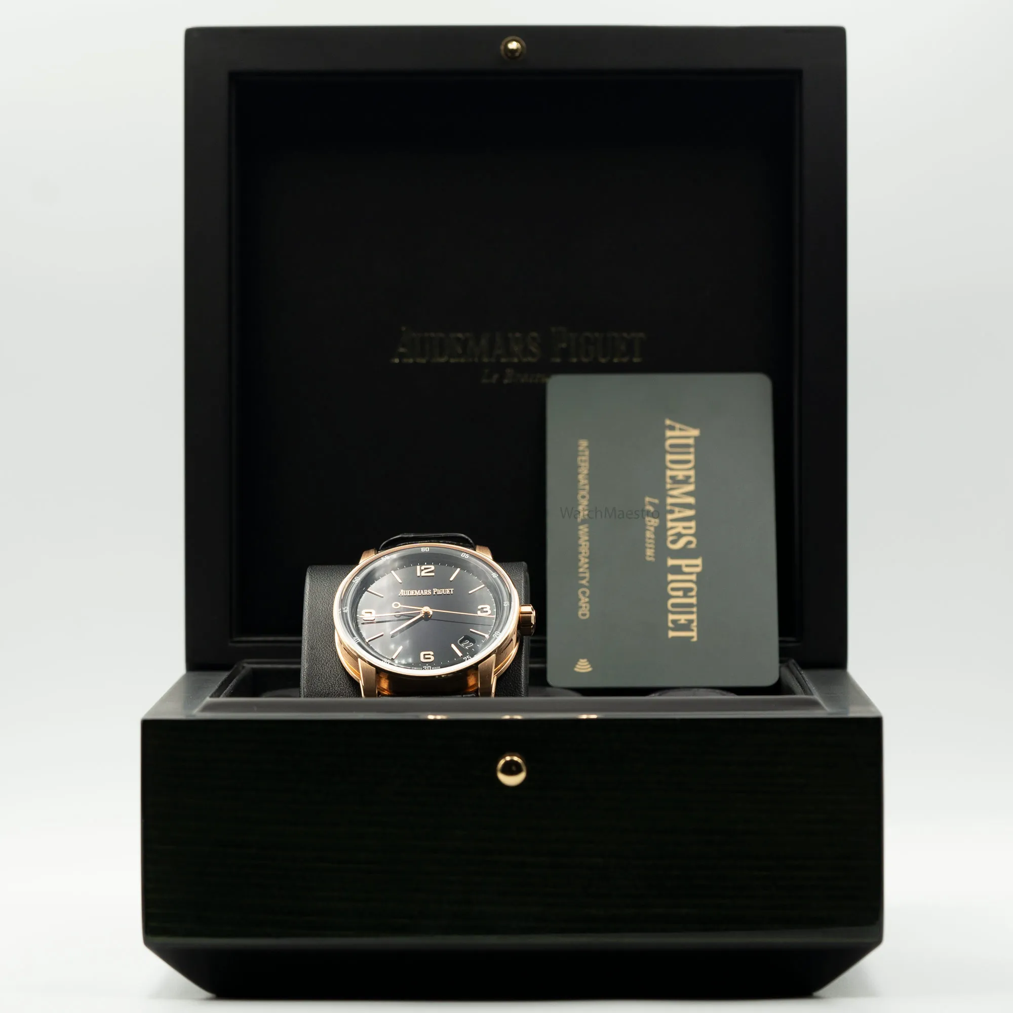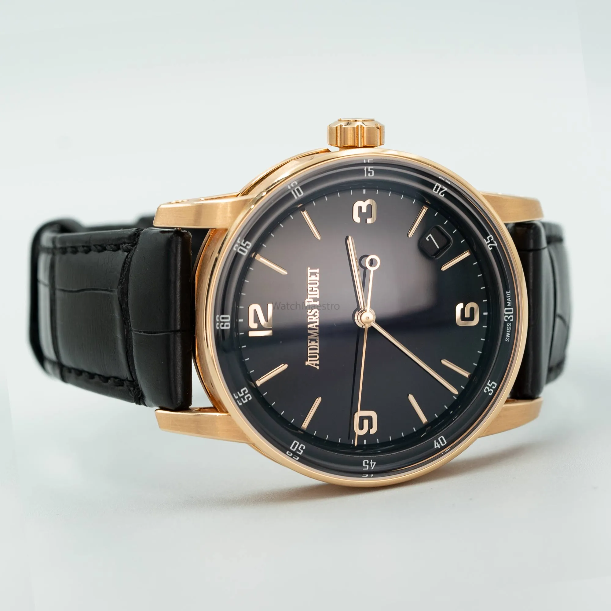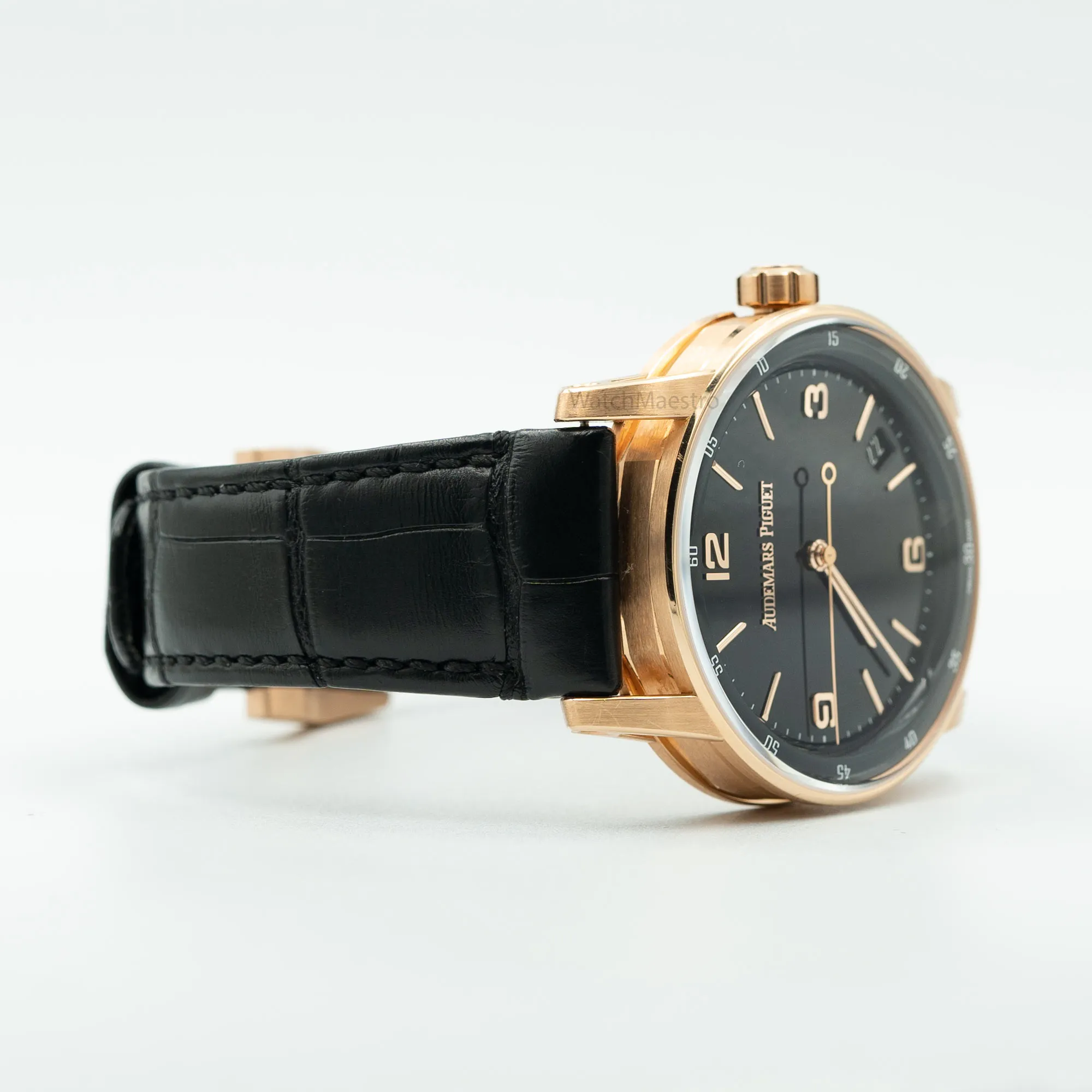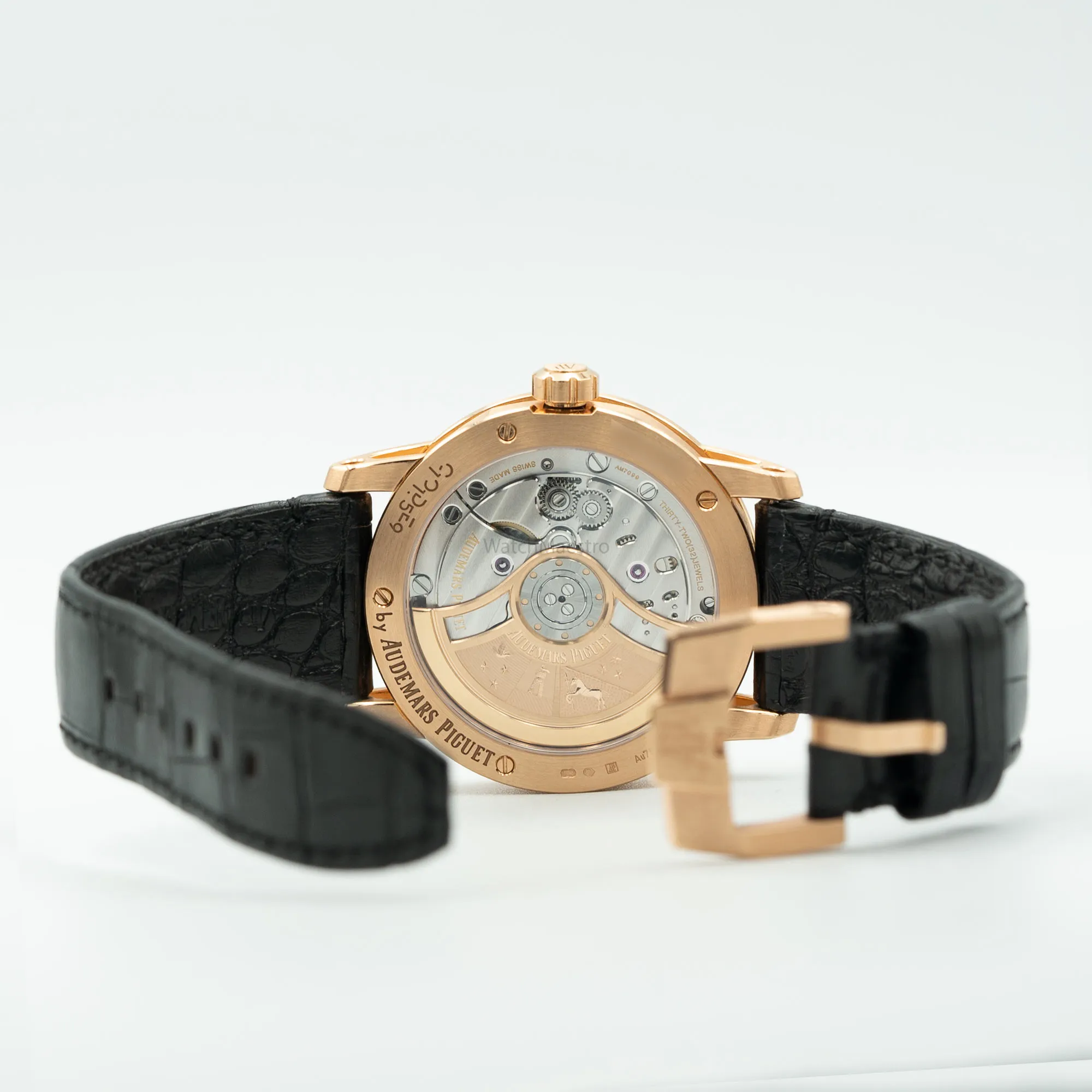 This is a pre-owned Audemars Piguet Code 11.59 in mint condition. Purchased in 2020, the watch comes complete with its original box and all the paperwork. Crafted out of 18ct Rose Gold, the watch flaunts a 41mm Purple dial. It is paired with a Purple Alligator strap and the watch also comes with an additional Black Alligator strap inside the box.