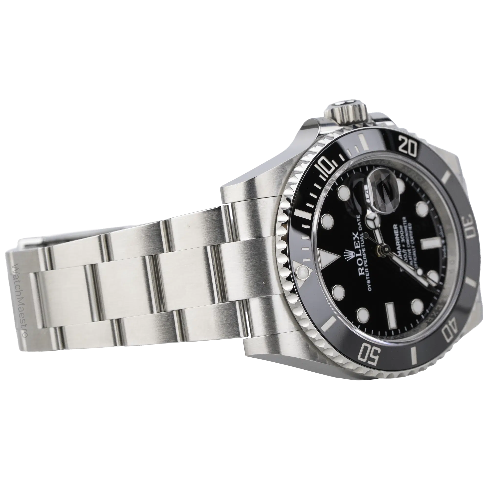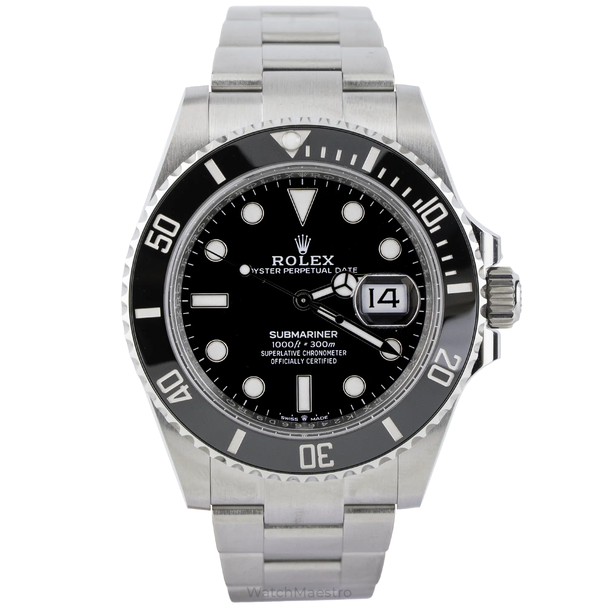 Rolex Submariner reference 126610LN is powered by the Calibre 3235 movement, offering a power reserve of up to approximately 70 hours. The watch is rated to be waterproof for up to 300 meters. It features a unidirectional rotatable bezel and a matte-finish stainless steel Oyster bracelet.