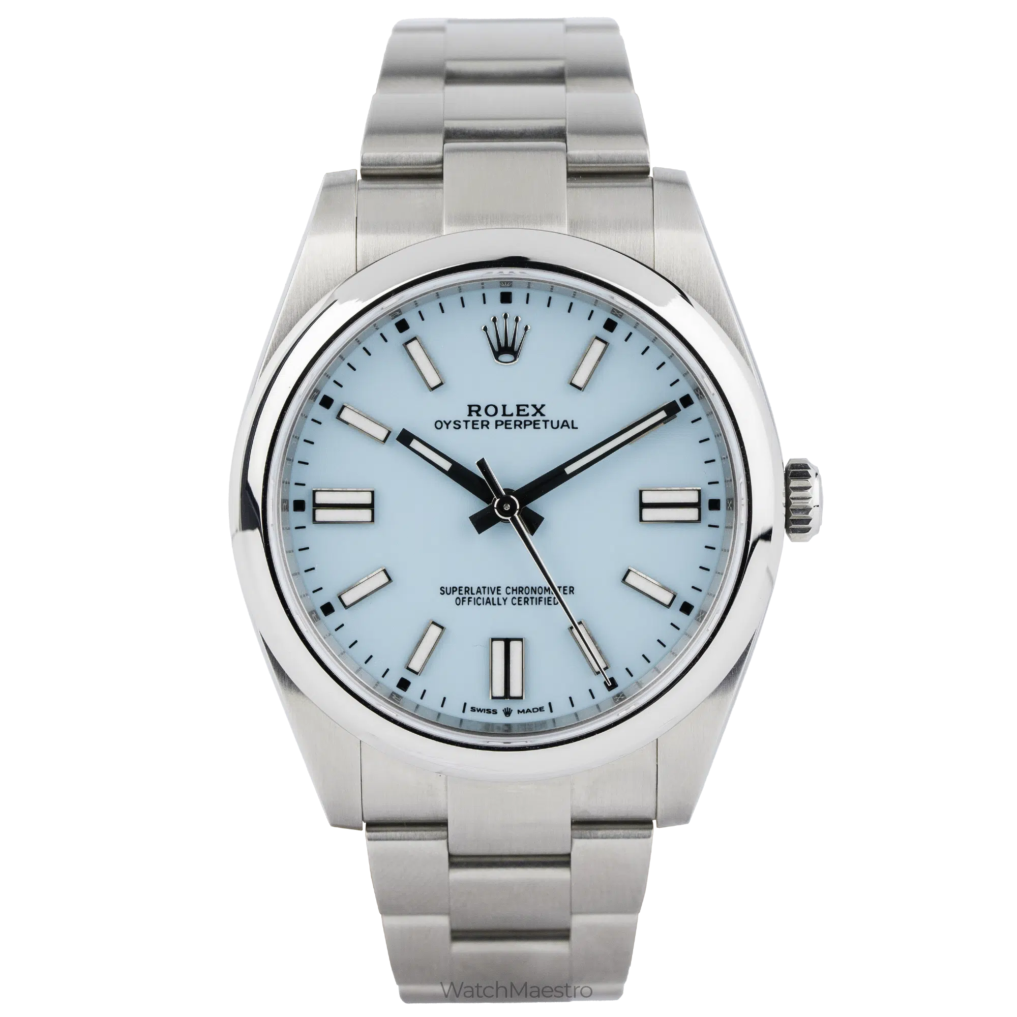 The most popular Rolex Oyster Perpetual 41 you can buy today. Featuring the Turquoise Blue dial, this 41mm Rolex Tiffany was discontinued back in 2022 and since then it has been a desirable watch among collectors and enthusiasts alike. This one in particular was originally purchased in 2022 and still remains unworn. It comes complete with box and papers. If you have been looking for a watch that simple and clean yet manages to stand out, this is the perfect timepiece for you. Visit the WatchMaestro Showroom to check out the watch in person today!
