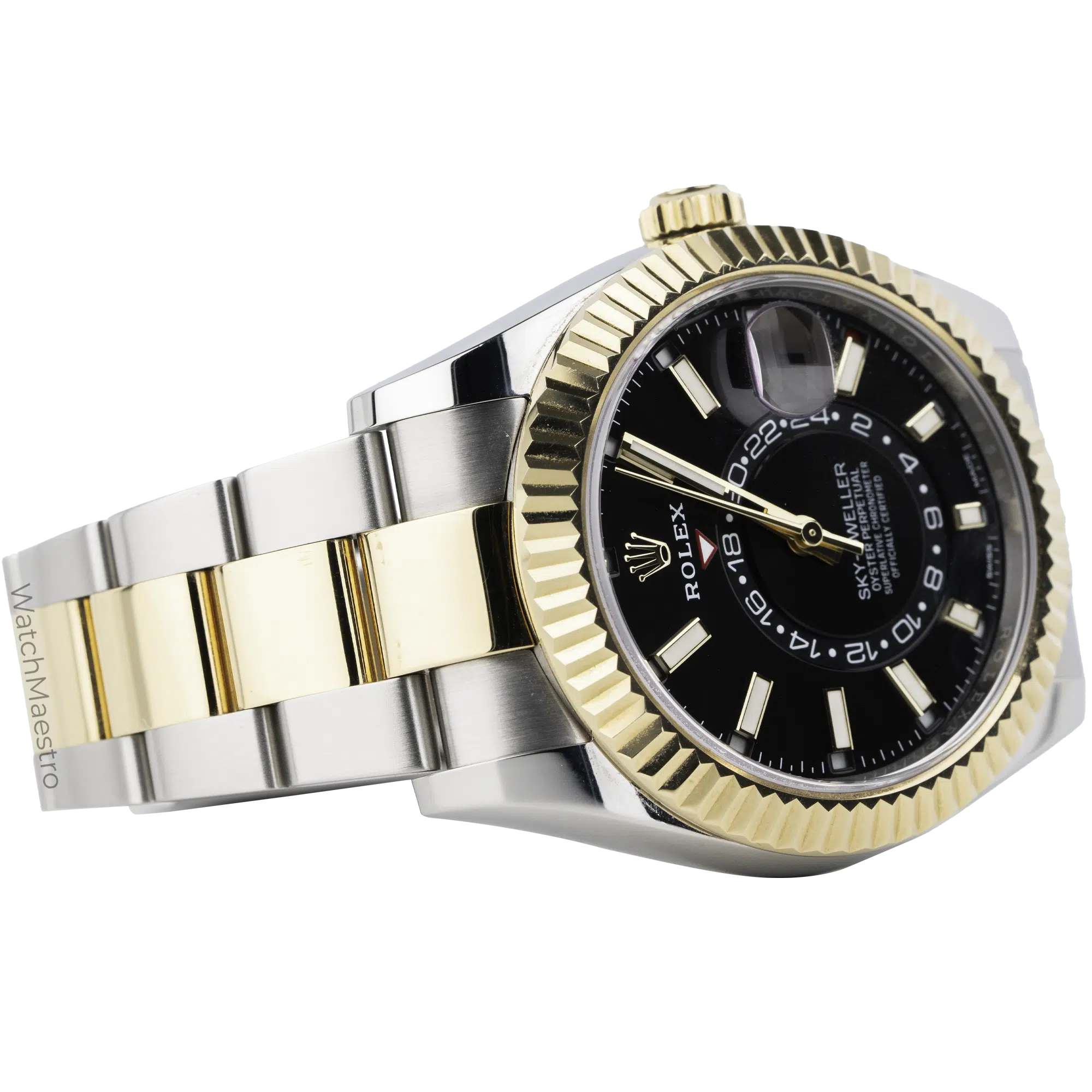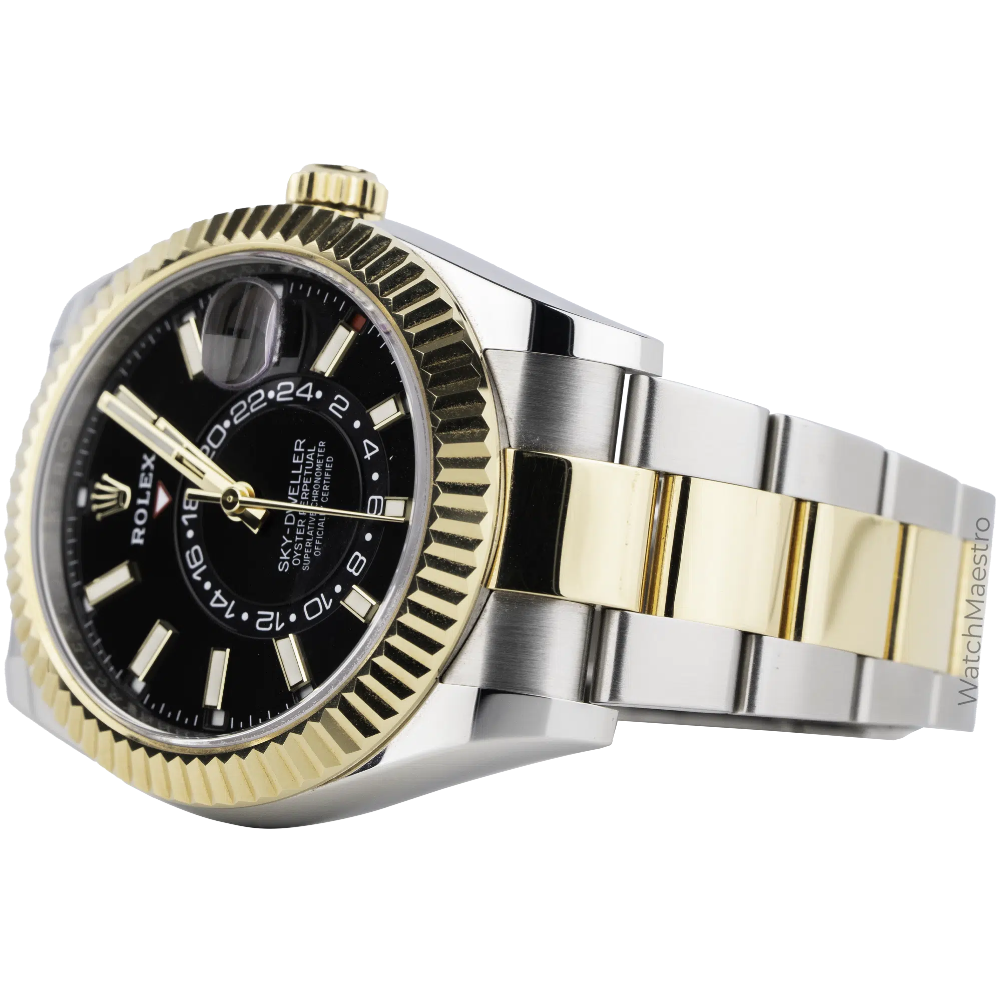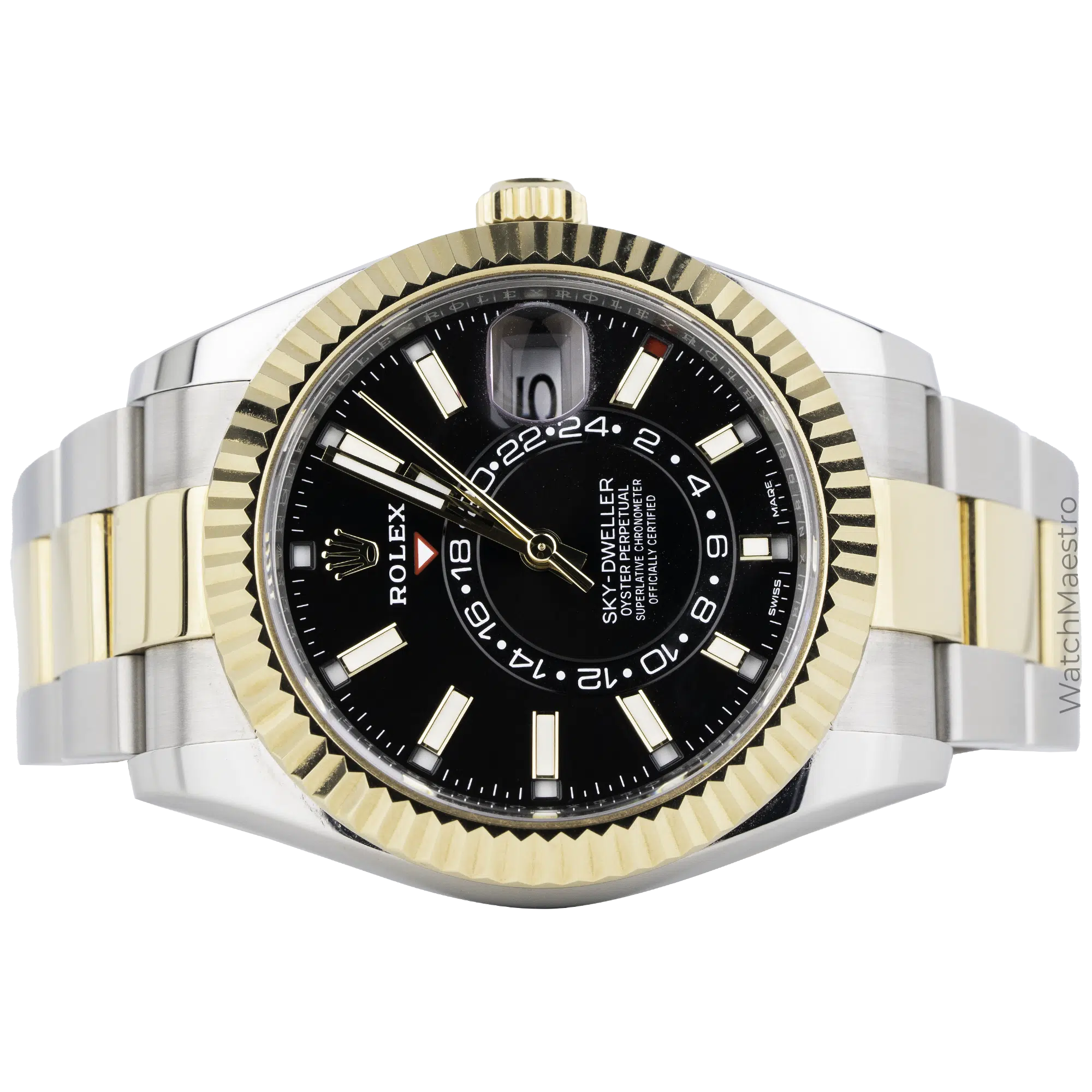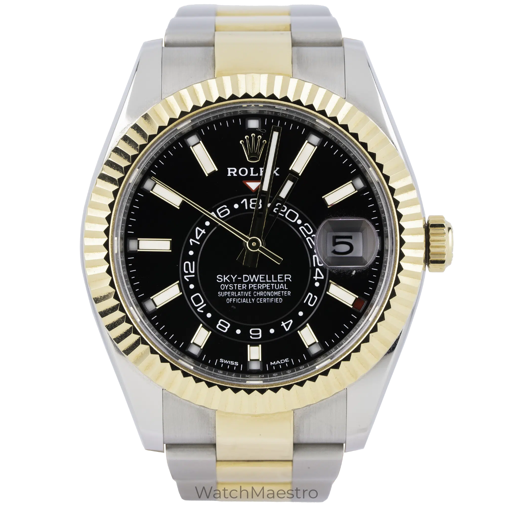 Introducing the Rolex Sky-Dweller 326933, a piece that brings both style and practicality together. Crafted in a blend of Yellow Gold and Steel, this timepiece sits on the Oyster Bracelet, which offers a sporty look. The captivating Black Dial serves as a timeless backdrop for the Sky-Dweller’s innovative complications. These complications include the dual time zone and annual calendar functions. Purchased in 2024, this pre-owned timepiece is still in good condition and it arrives complete with its original box and papers, ensuring authenticity. Adding to the peace of mind, the watch is still covered under the Rolex warranty.