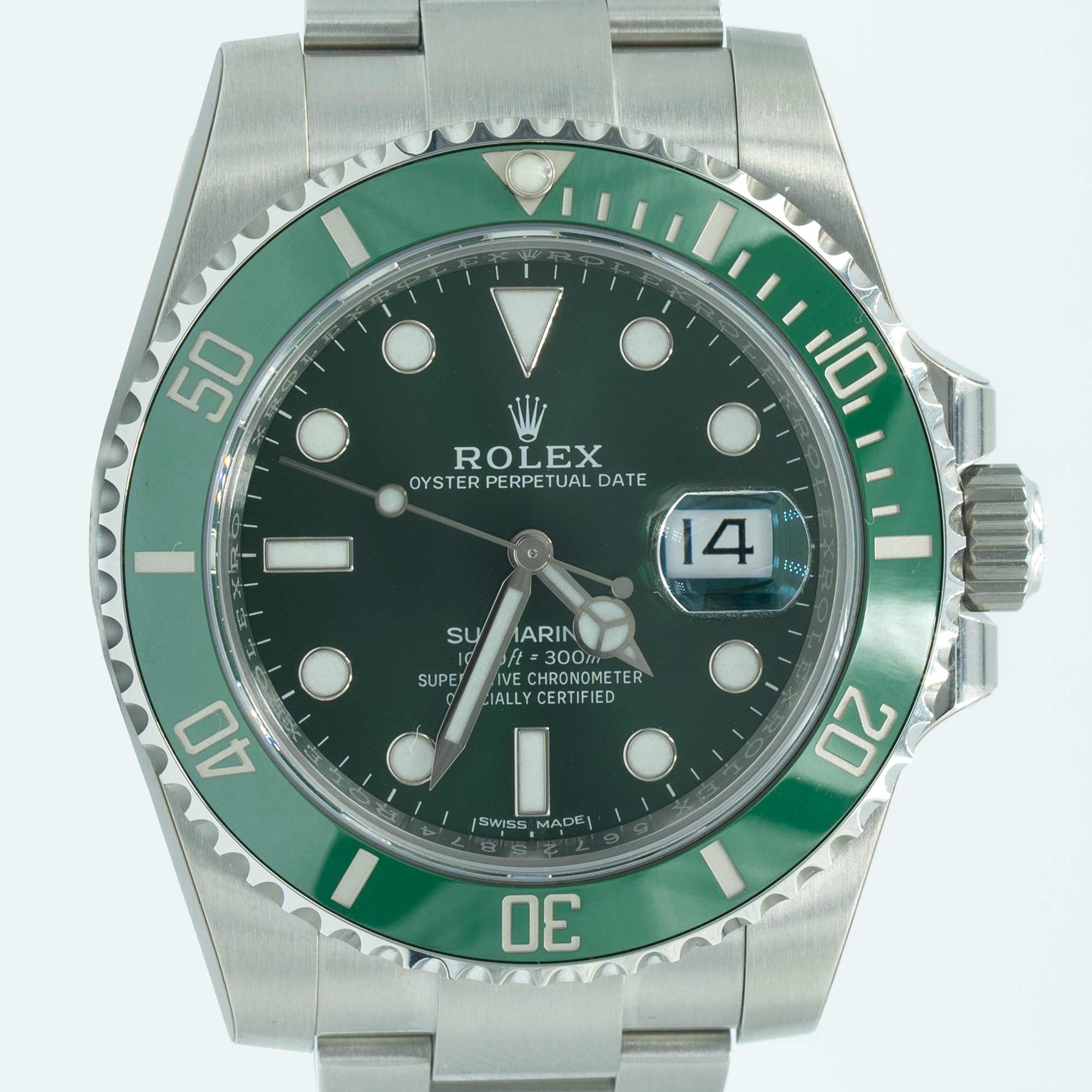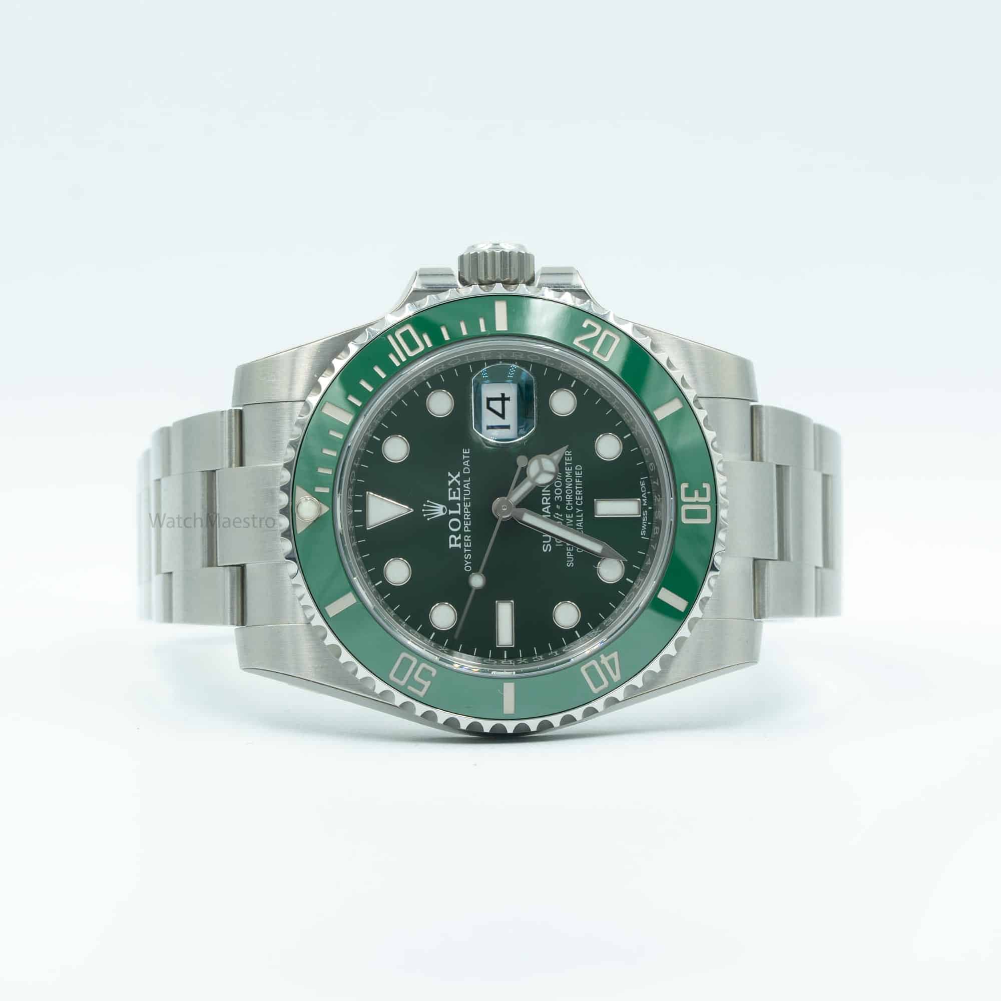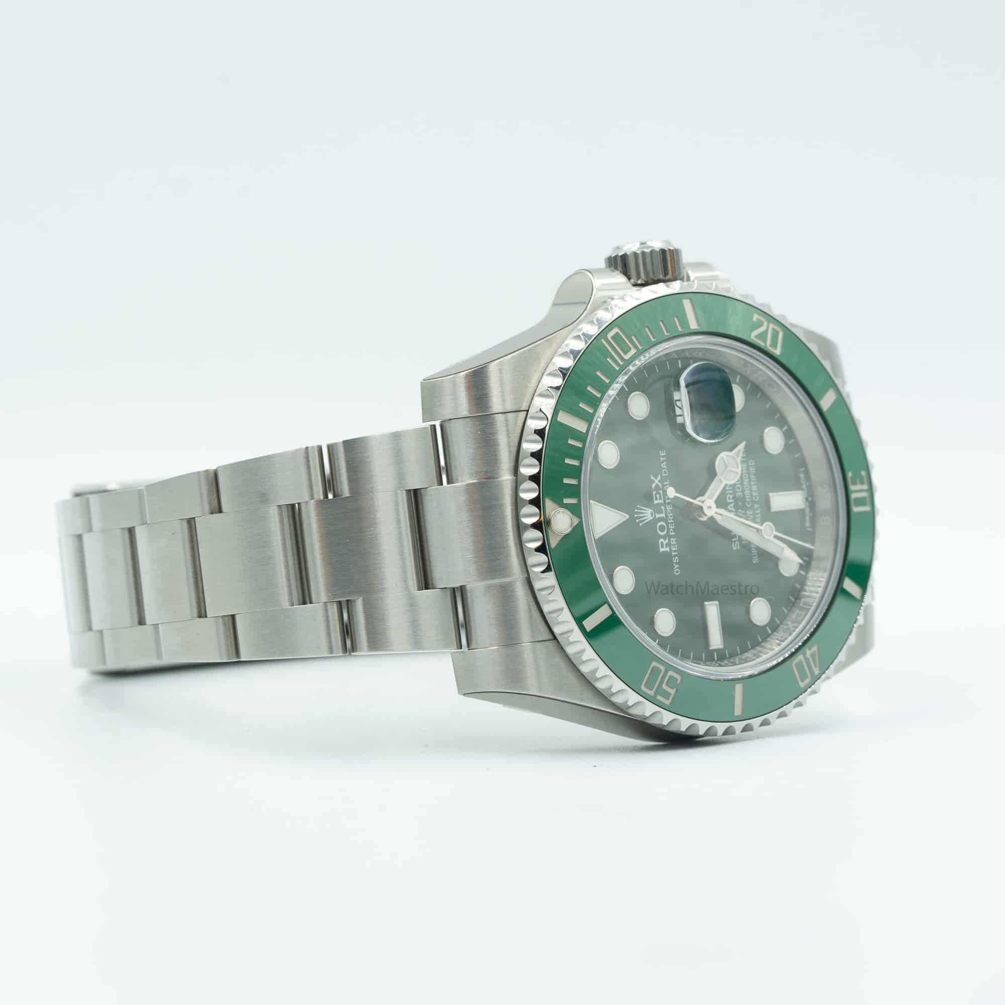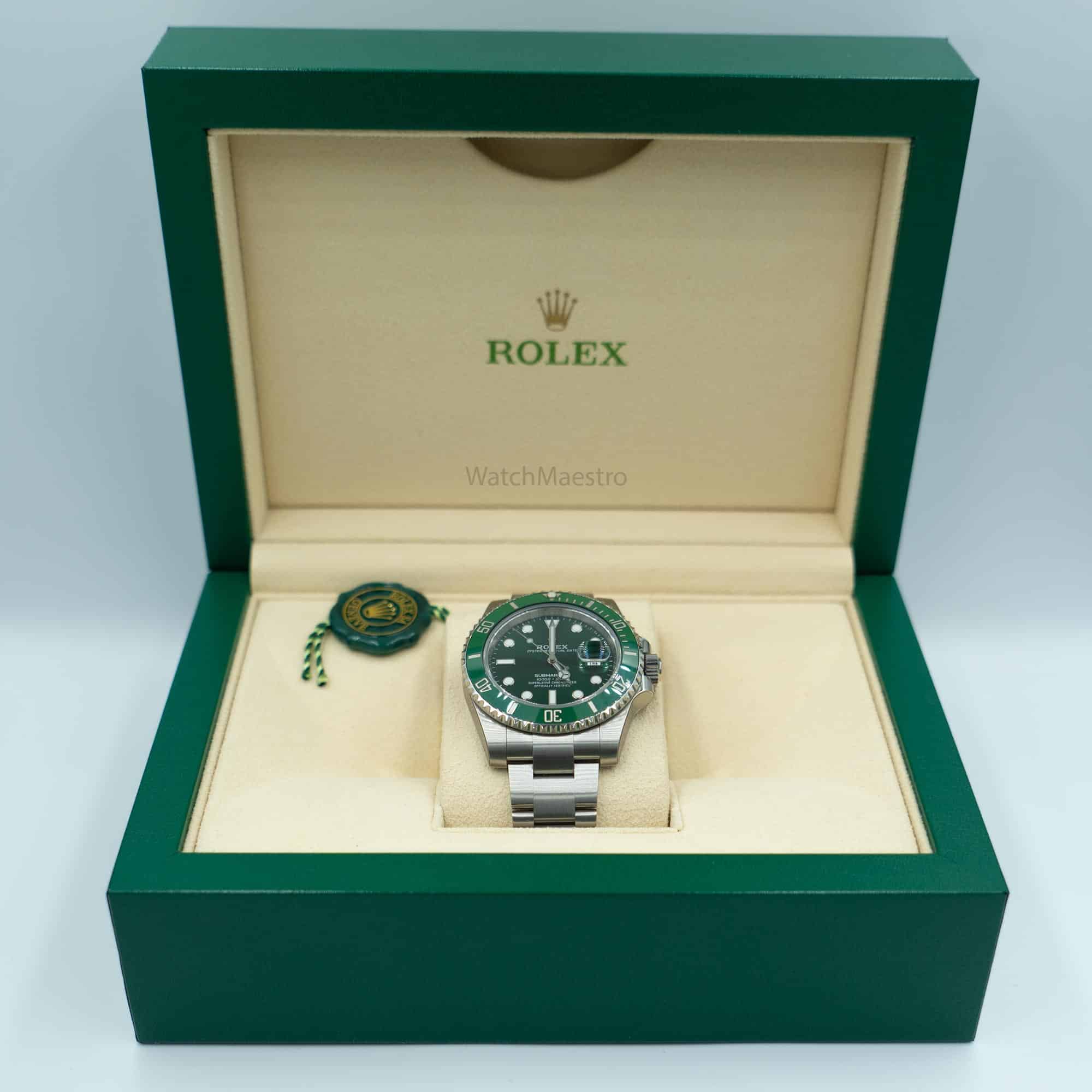 This is a brand-new Rolex Submariner Hulk 116610LV, with stickers still on it. Popularly known as the Hulk, the brand has now discontinued it, making it even more desirable by watch collectors. Purchased in 2017, this one comes in a full set with its original box as well as all the paperwork.