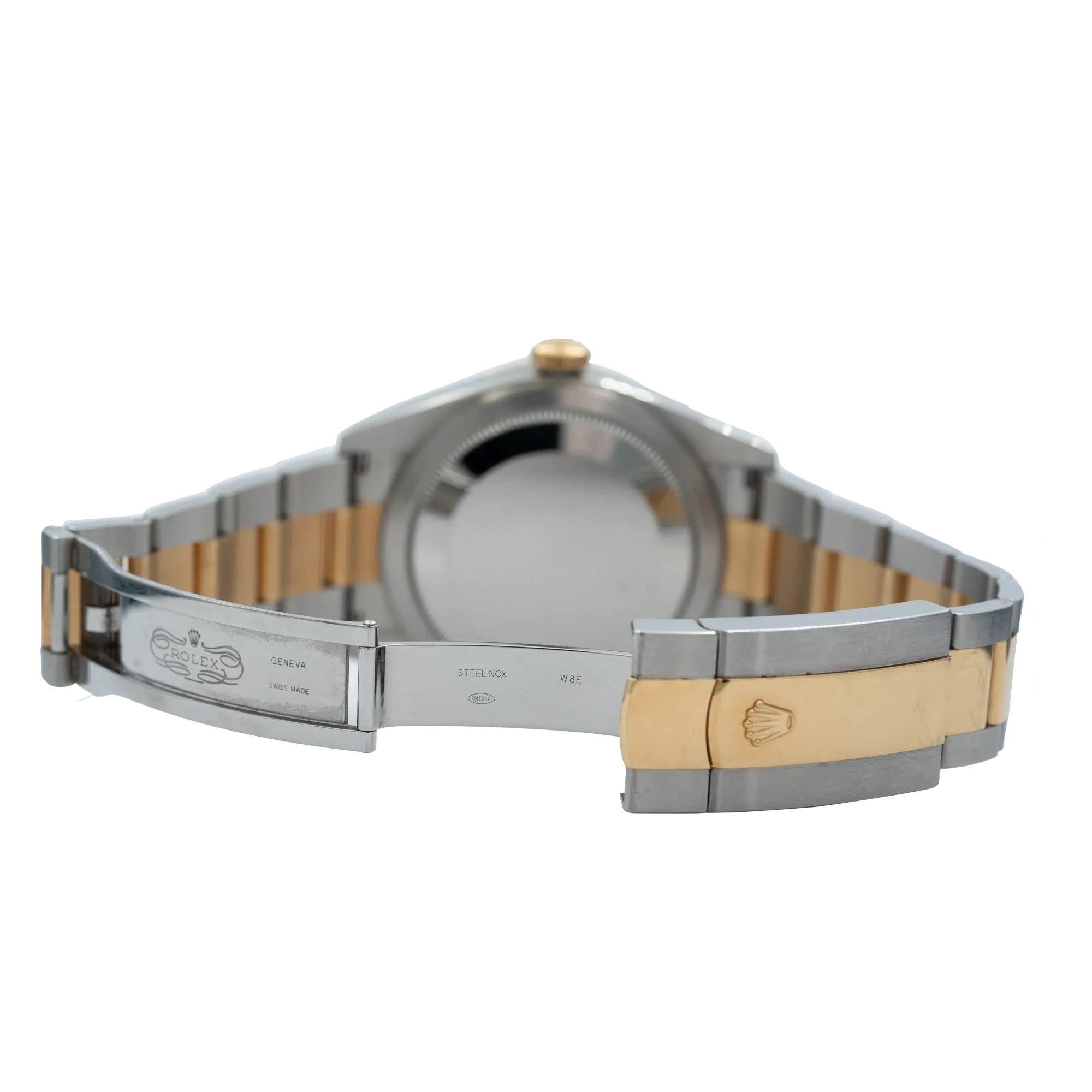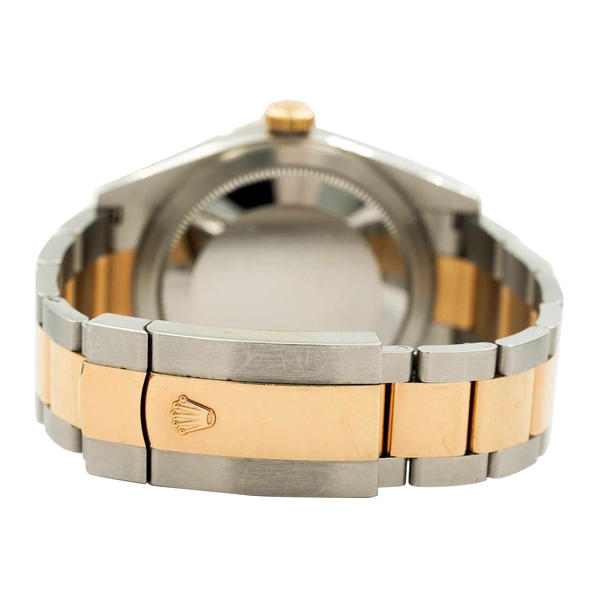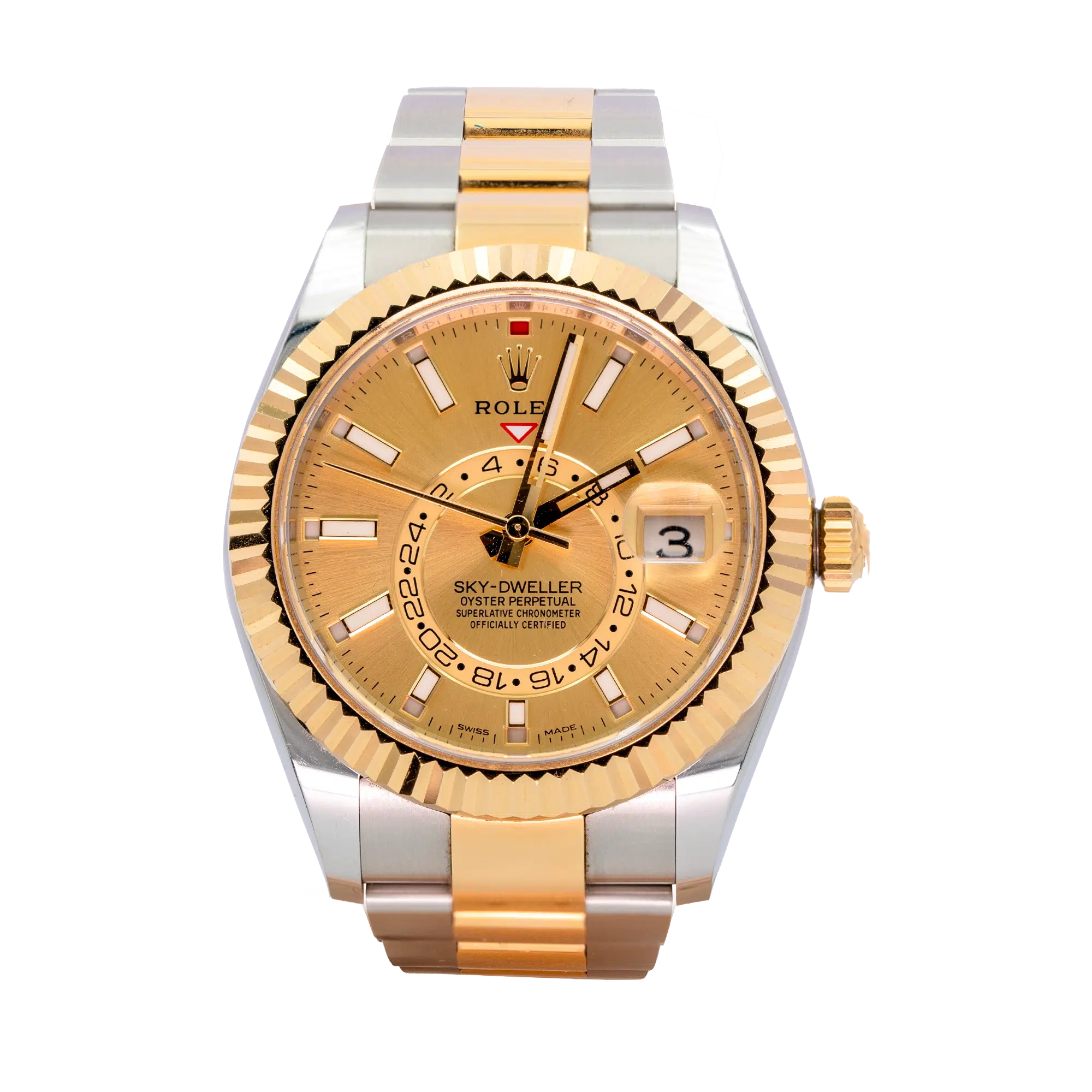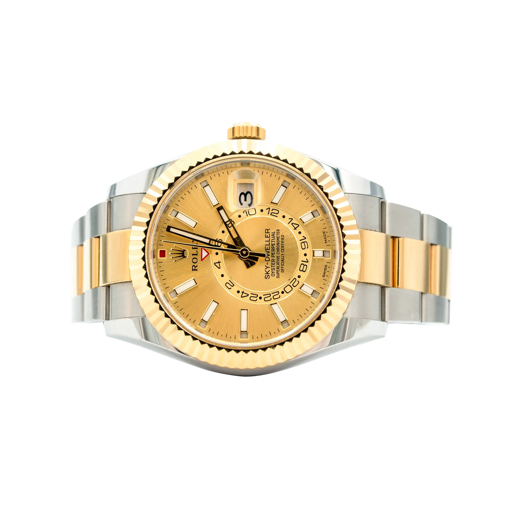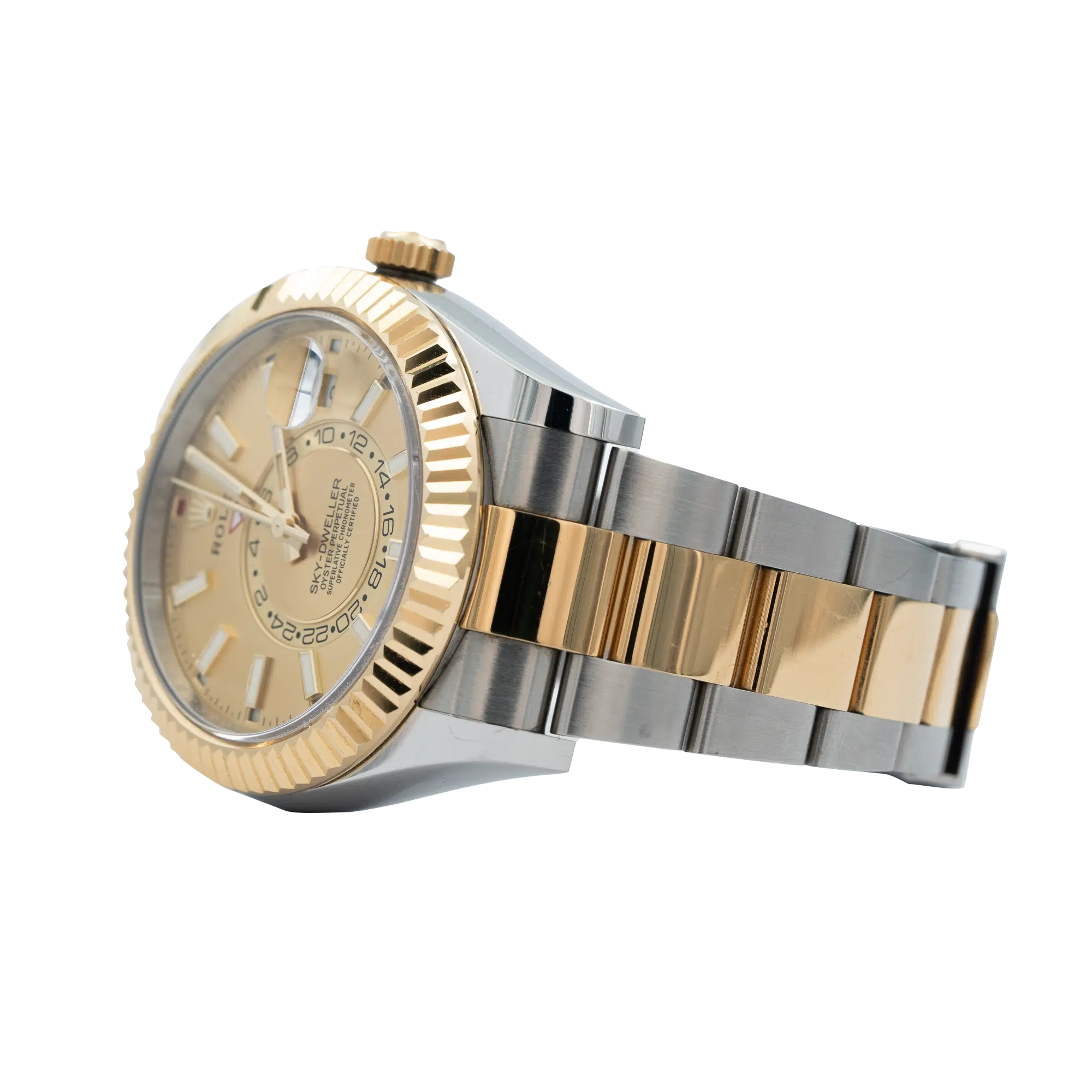 This is a pre-owned Rolex Sky-Dweller featuring a 42mm Champagne dial. Purchased in 2022, the watch comes complete with box and papers. The timepiece features a two-tone Oyster bracelet and an 18ct Yellow Gold Fluted bezel giving it a rich look.