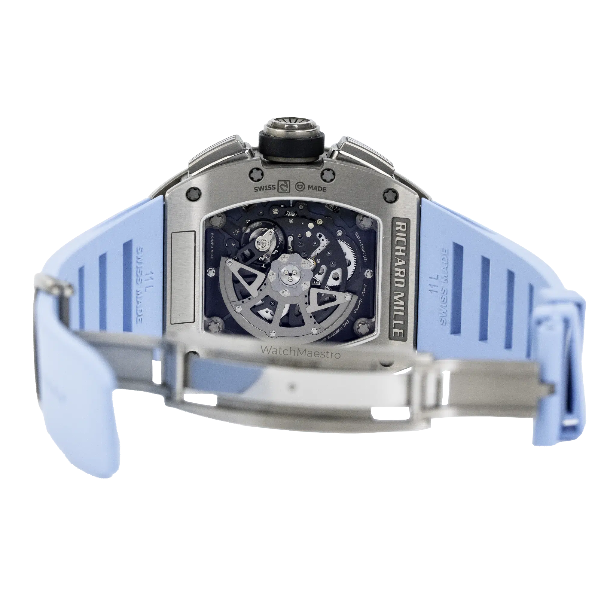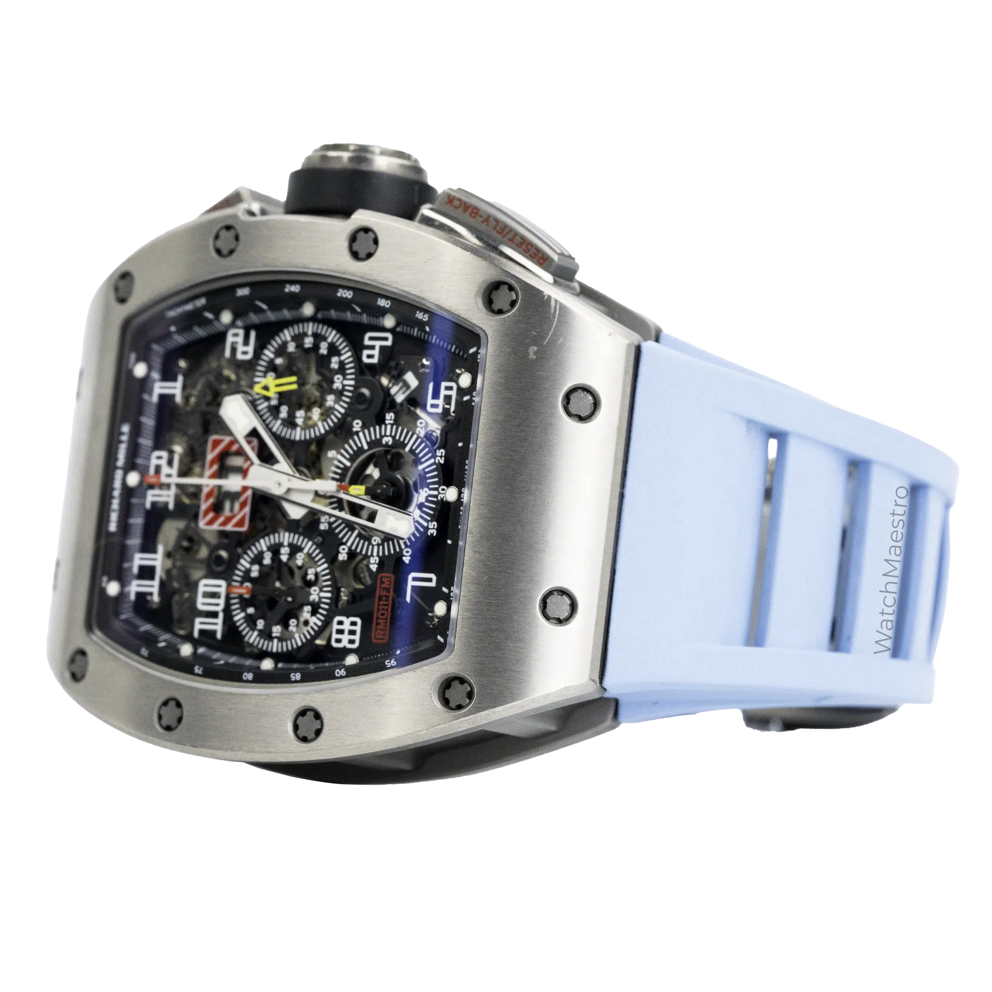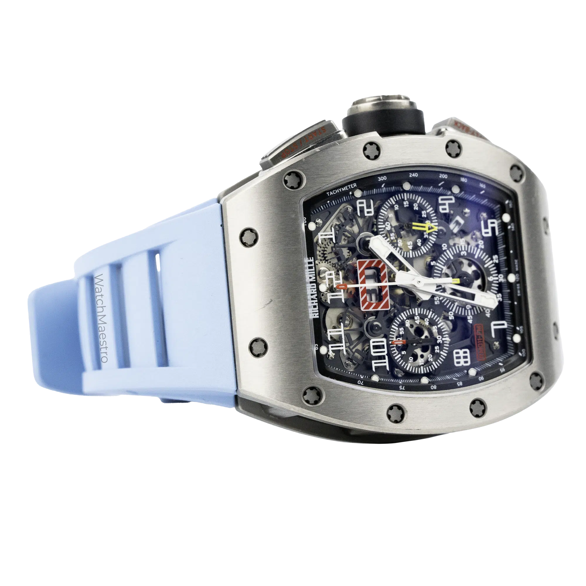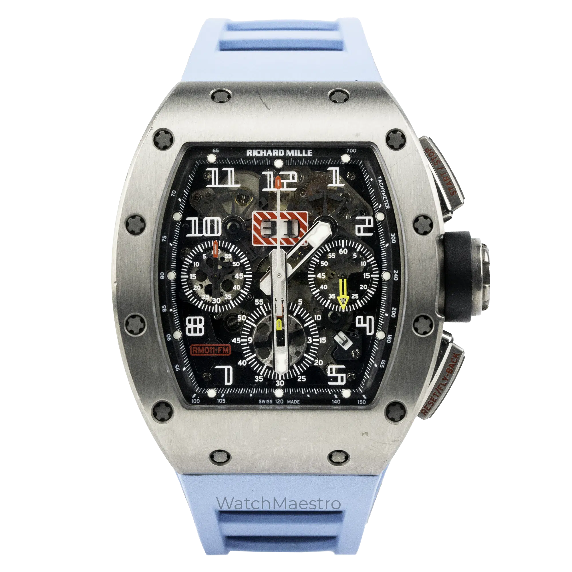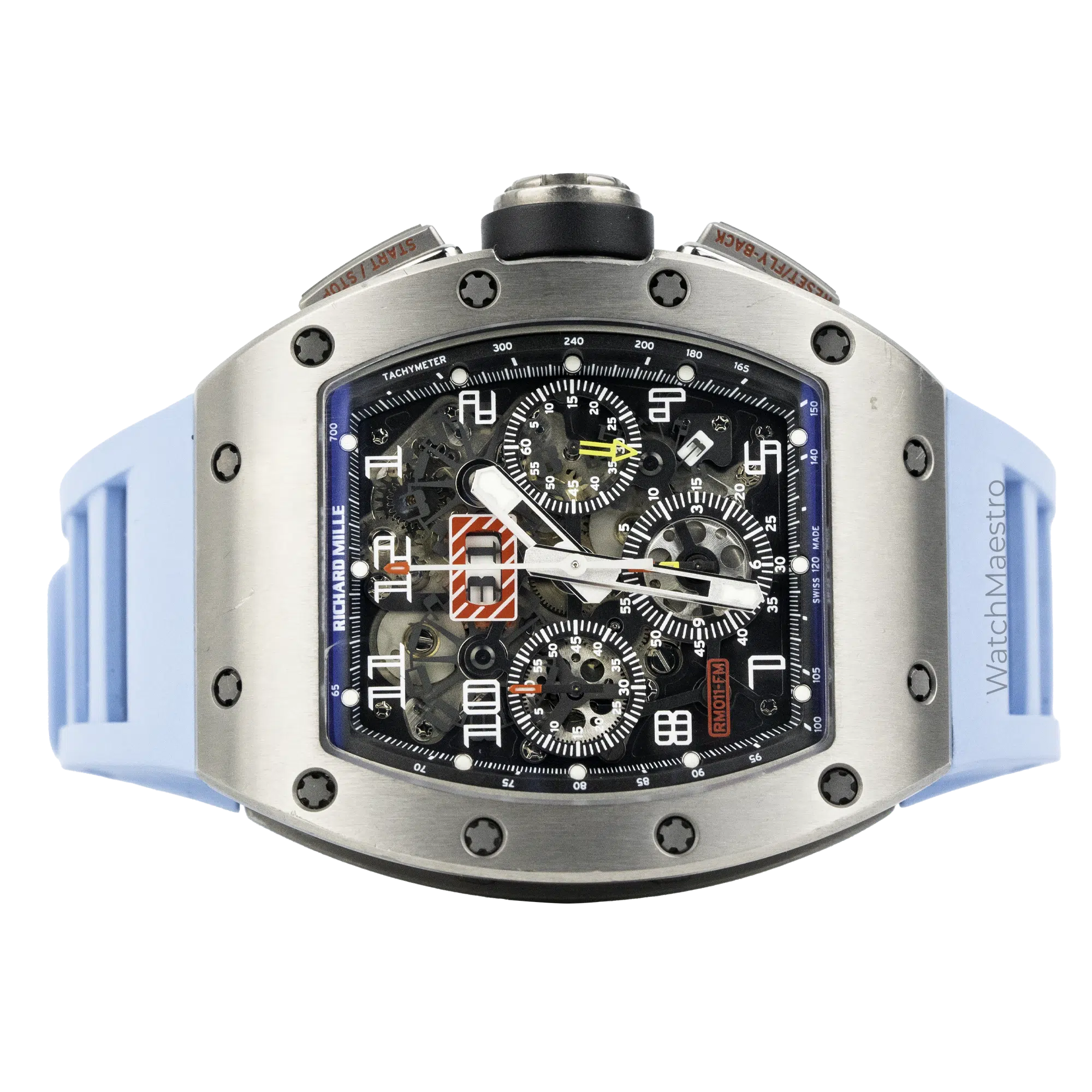 Introducing the Richard Mille RM011 Felipe Massa. This watch features a Flyback Chronograph and it is housed inside a Titanium case. Paired with a Blue Rubber Strap, this watch just stands out. It has a skeleton dial allowing you to look at the intricate movement and the inner workings of the watch. In order to make the time visible, the watch gets bold numerals. It even gets a Date function making it a practical watch to wear everyday. Crafted in 2016, this pre-owned timepiece comes complete with its original box and papers, offering authenticity and provenance. This is definitely the statement piece that should be in your collection.
