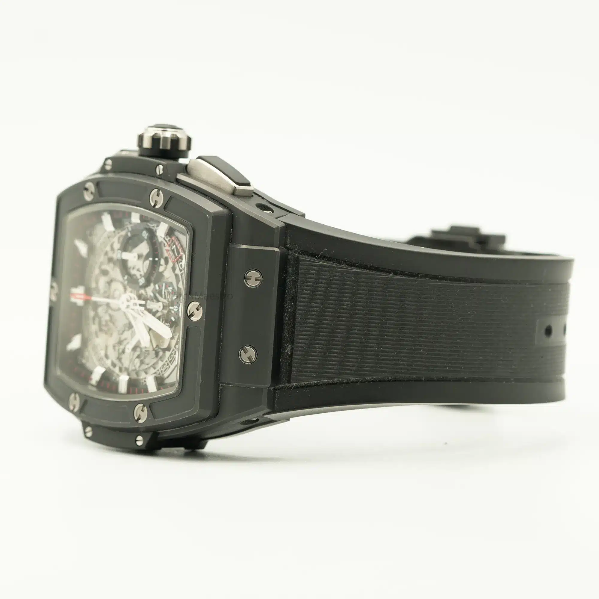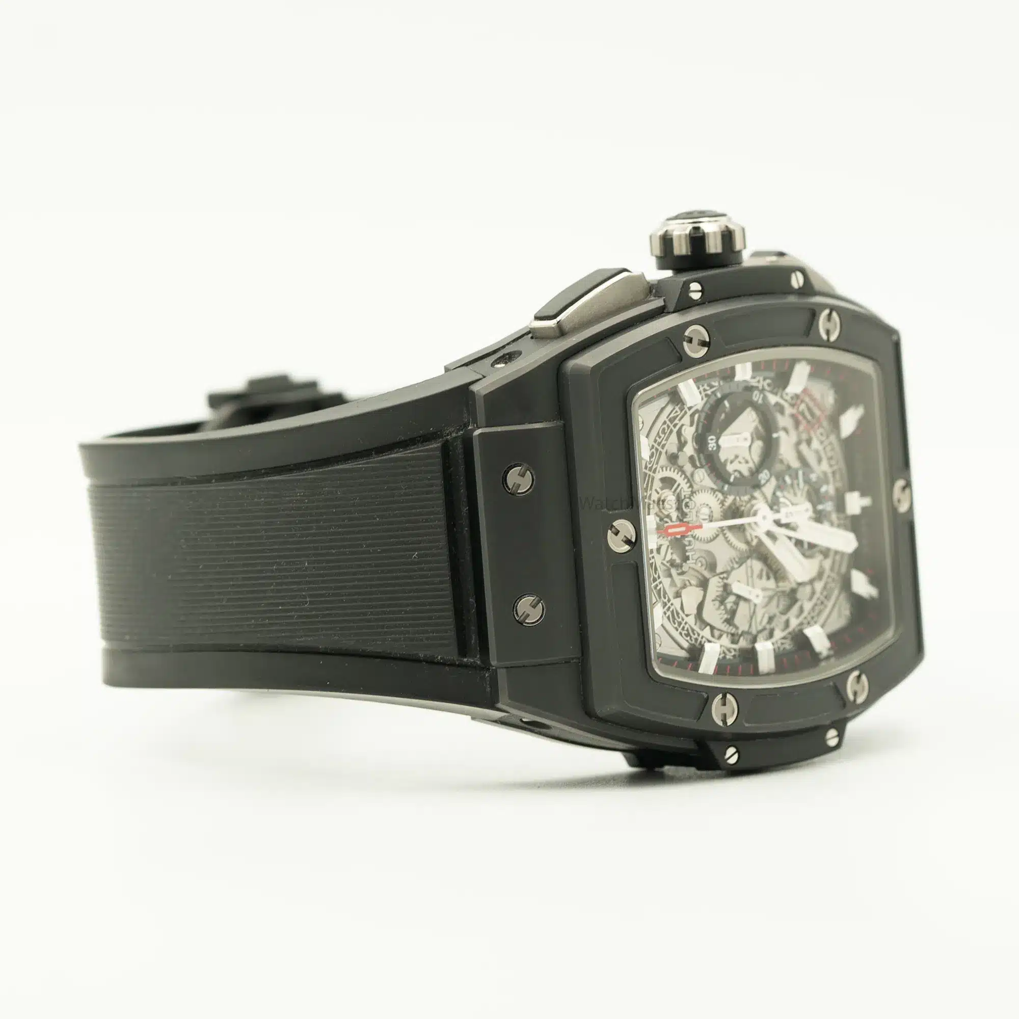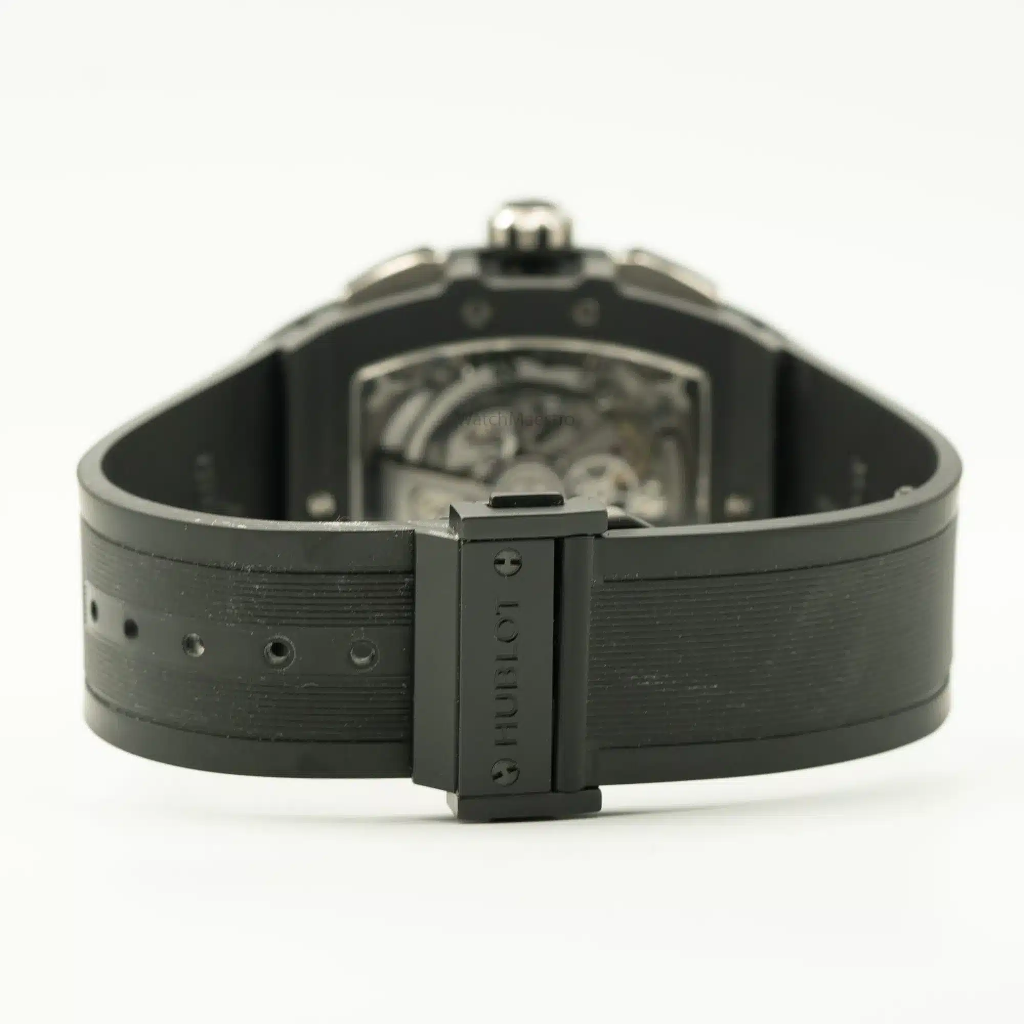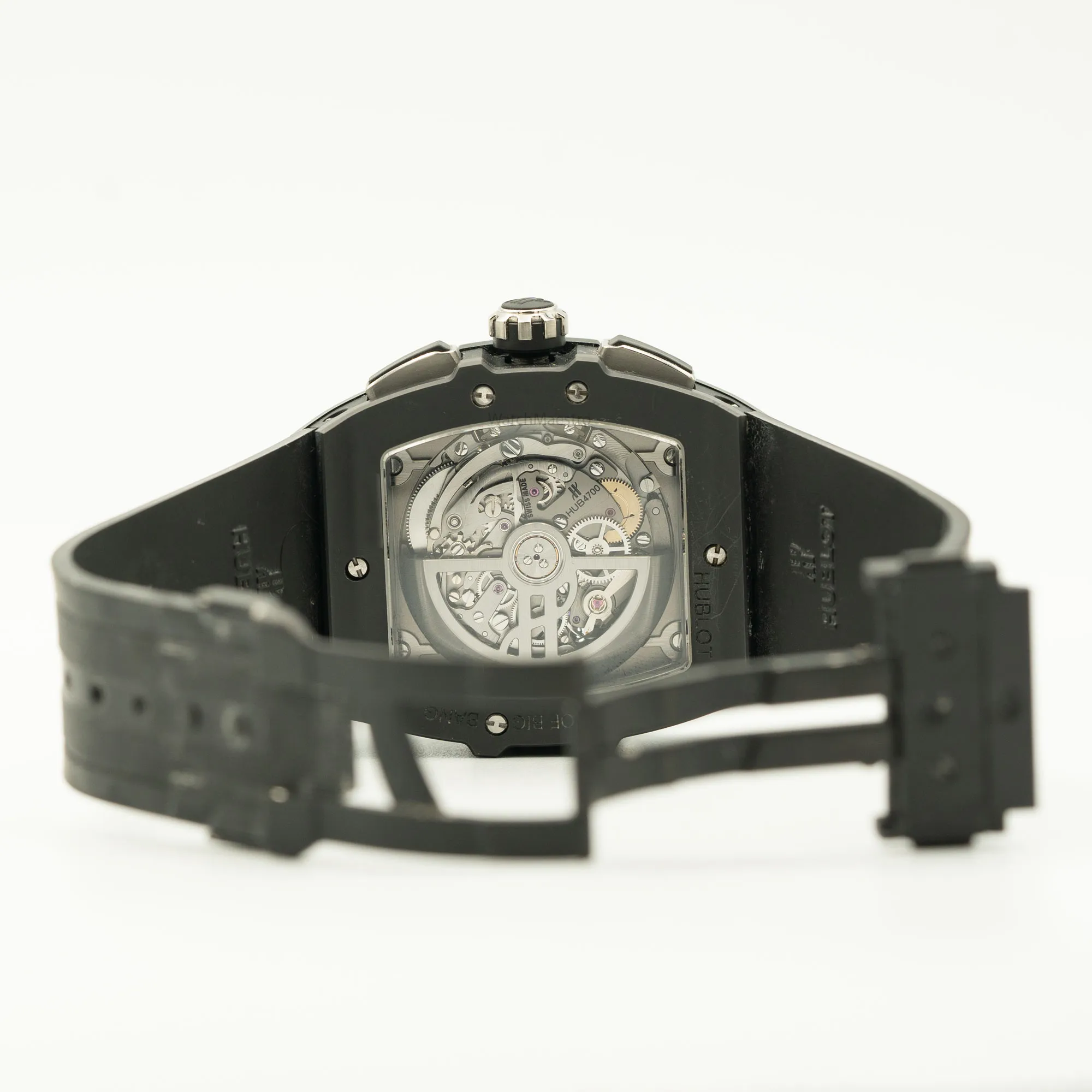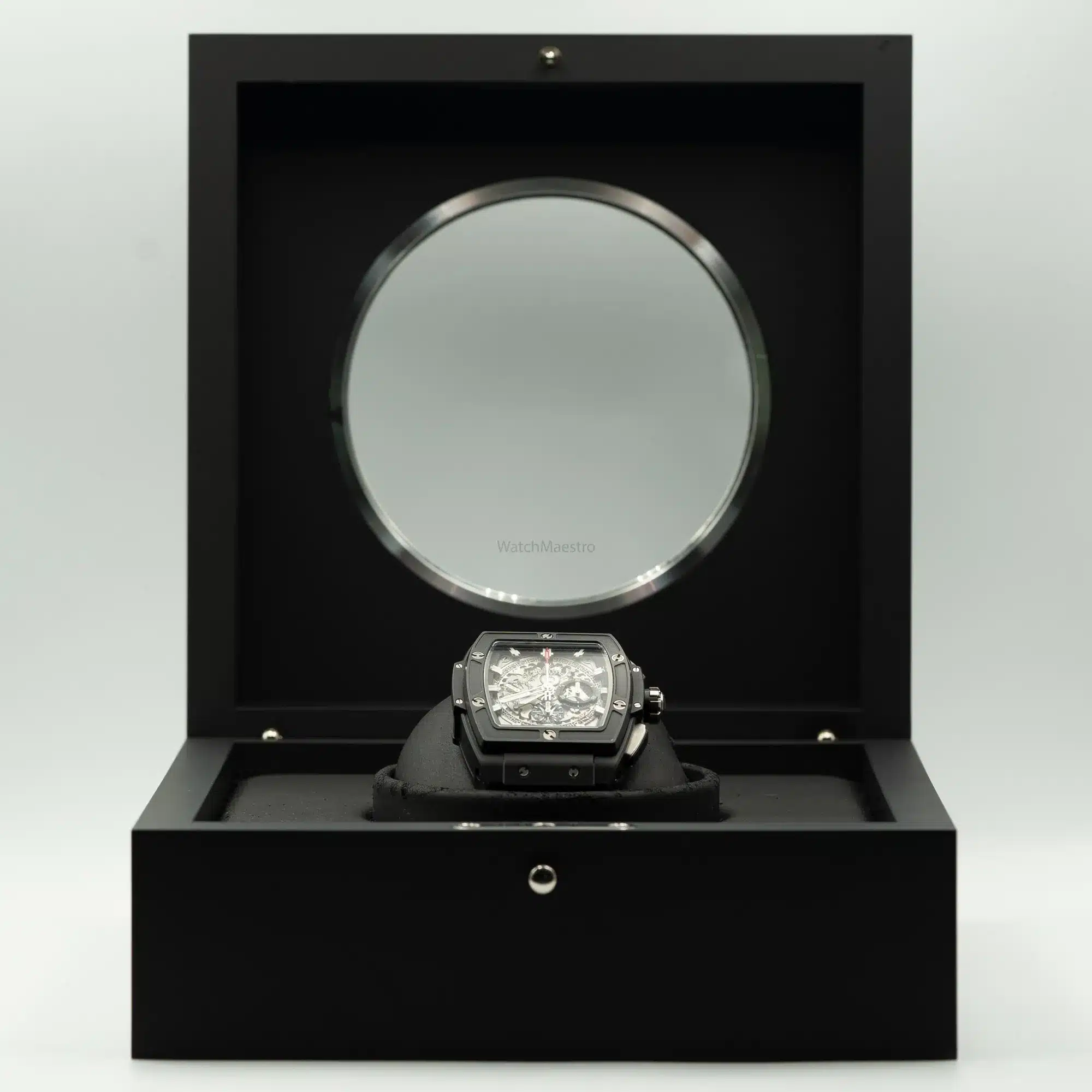 This is a pre-owned Hublot Spirit of Big Bang Black Magic. Purchased in 2019, the watch comes complete with box and papers, and it is still in excellent condition. The timepiece features a 42mm skeleton dial, which is much appreciated by watch enthusiasts. Featuring a Black Ceramic case, sapphire crystal and ceramic bezel, the watch manages to stand out.