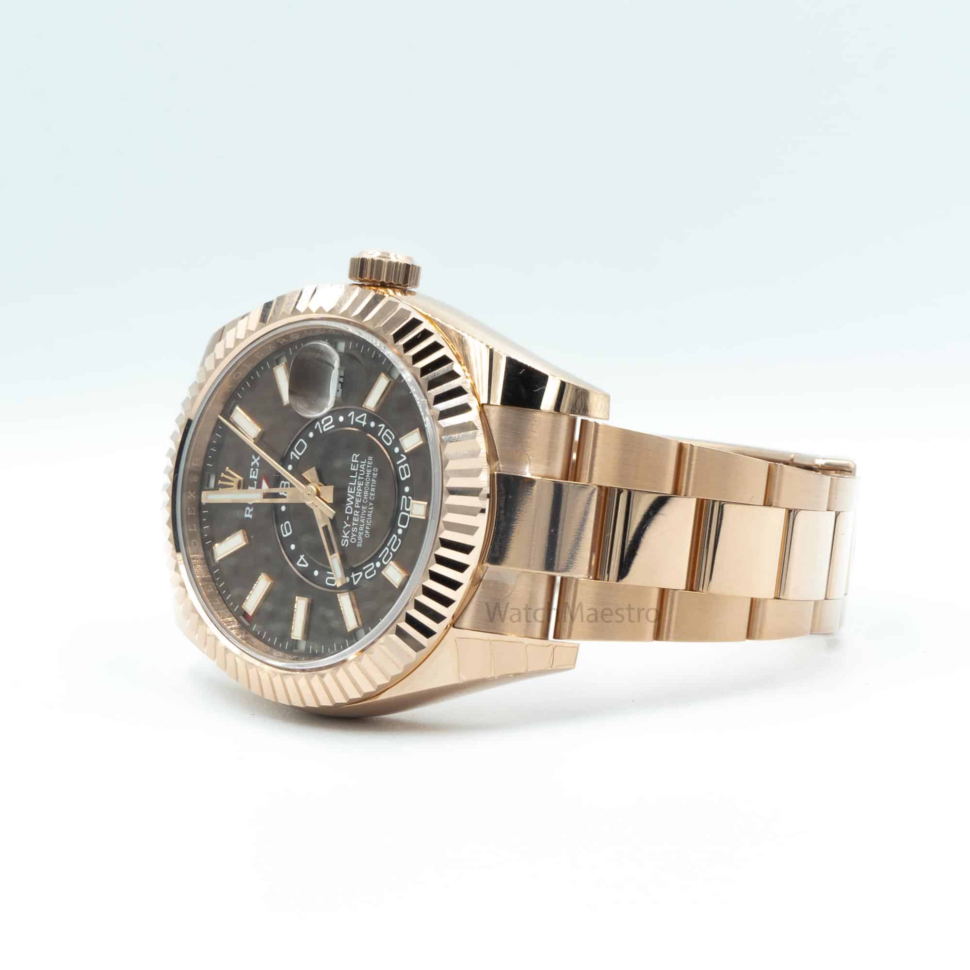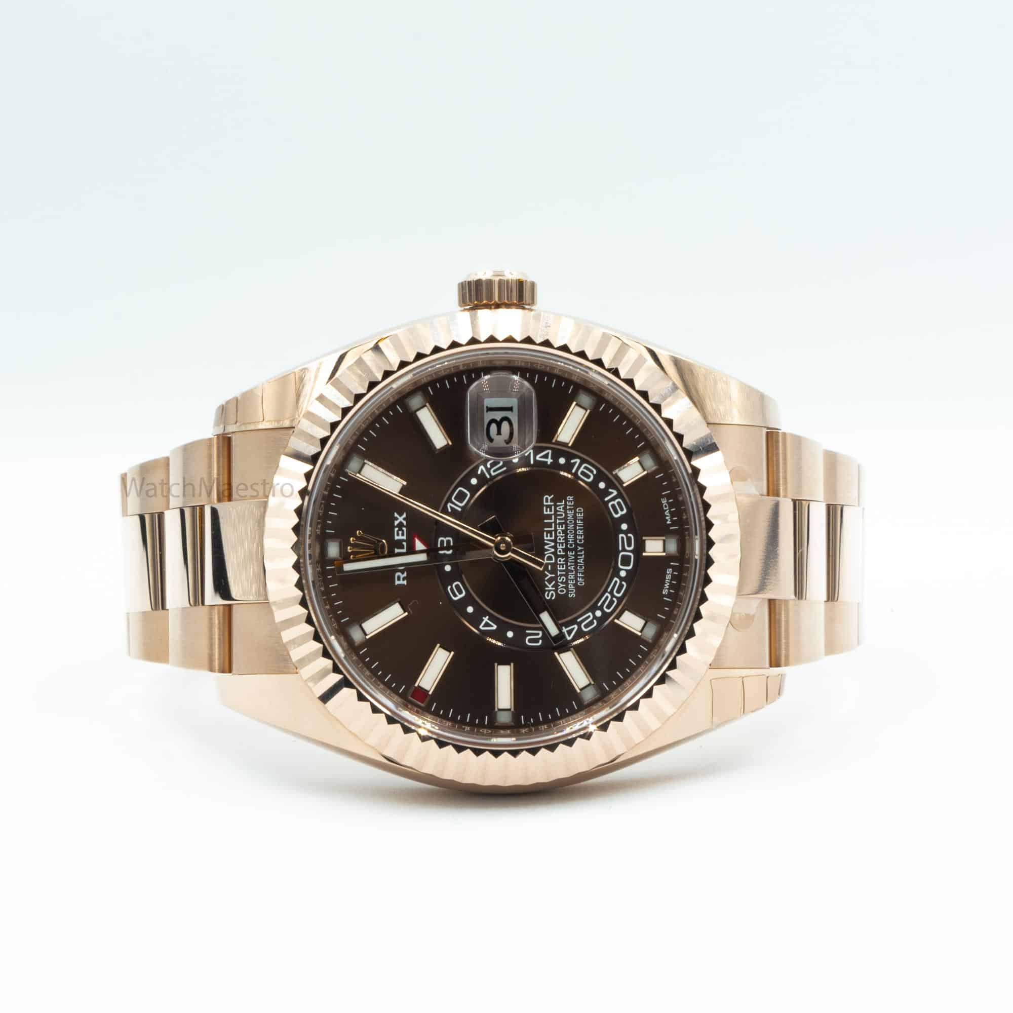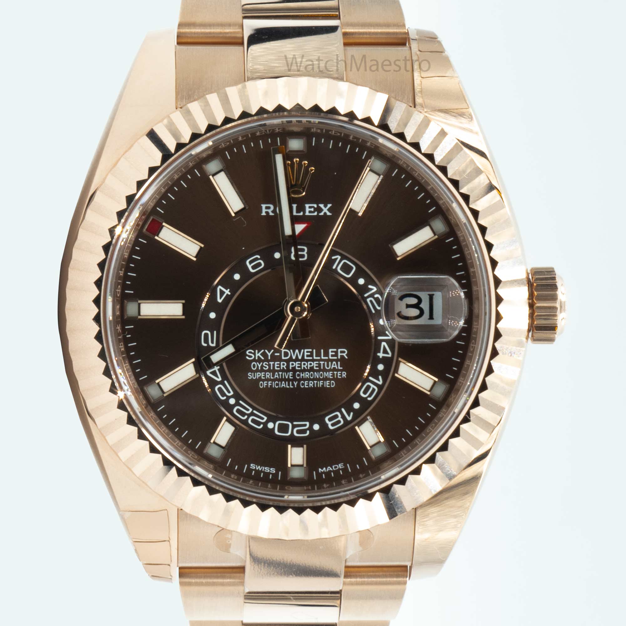 This is a brand-new Rolex Sky-Dweller with a 42mm Chocolate dial, the most popular Sky-Dweller dial to get. The Everose gold watch comes with the classic Oyster bracelet. Purchased in July 2022, this watch also features the iconic fluted bezel. It is an exemplary timepiece and has been in huge demand among watch collectors and enthusiasts alike making it hard to get hold of one.
