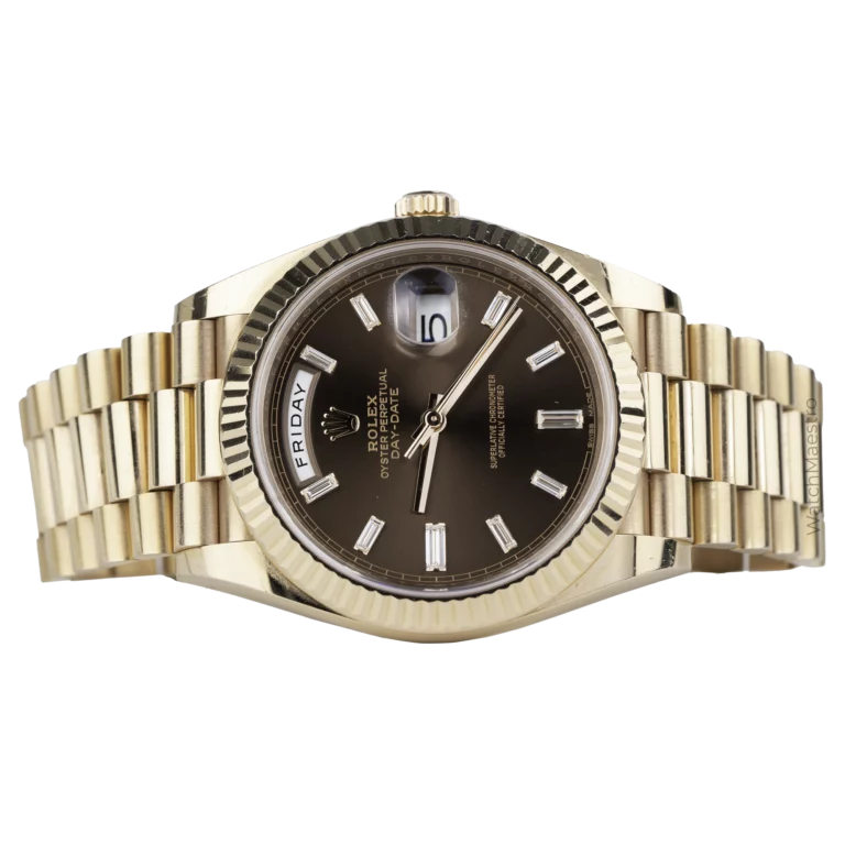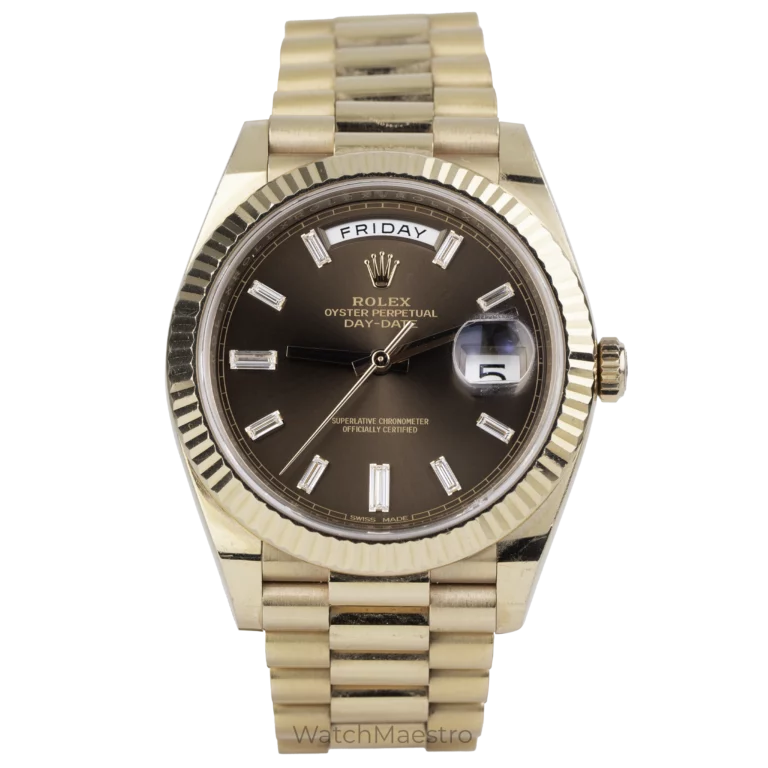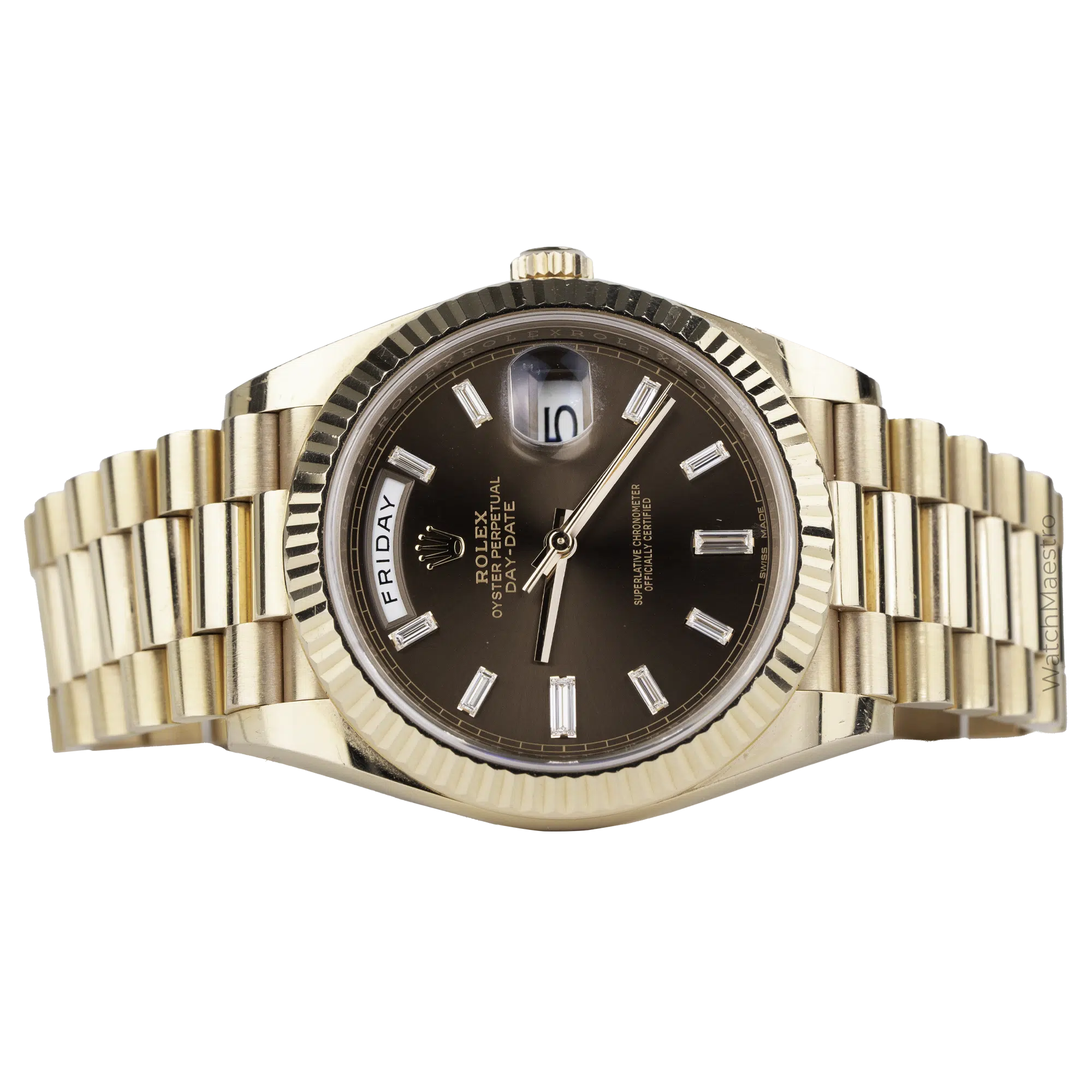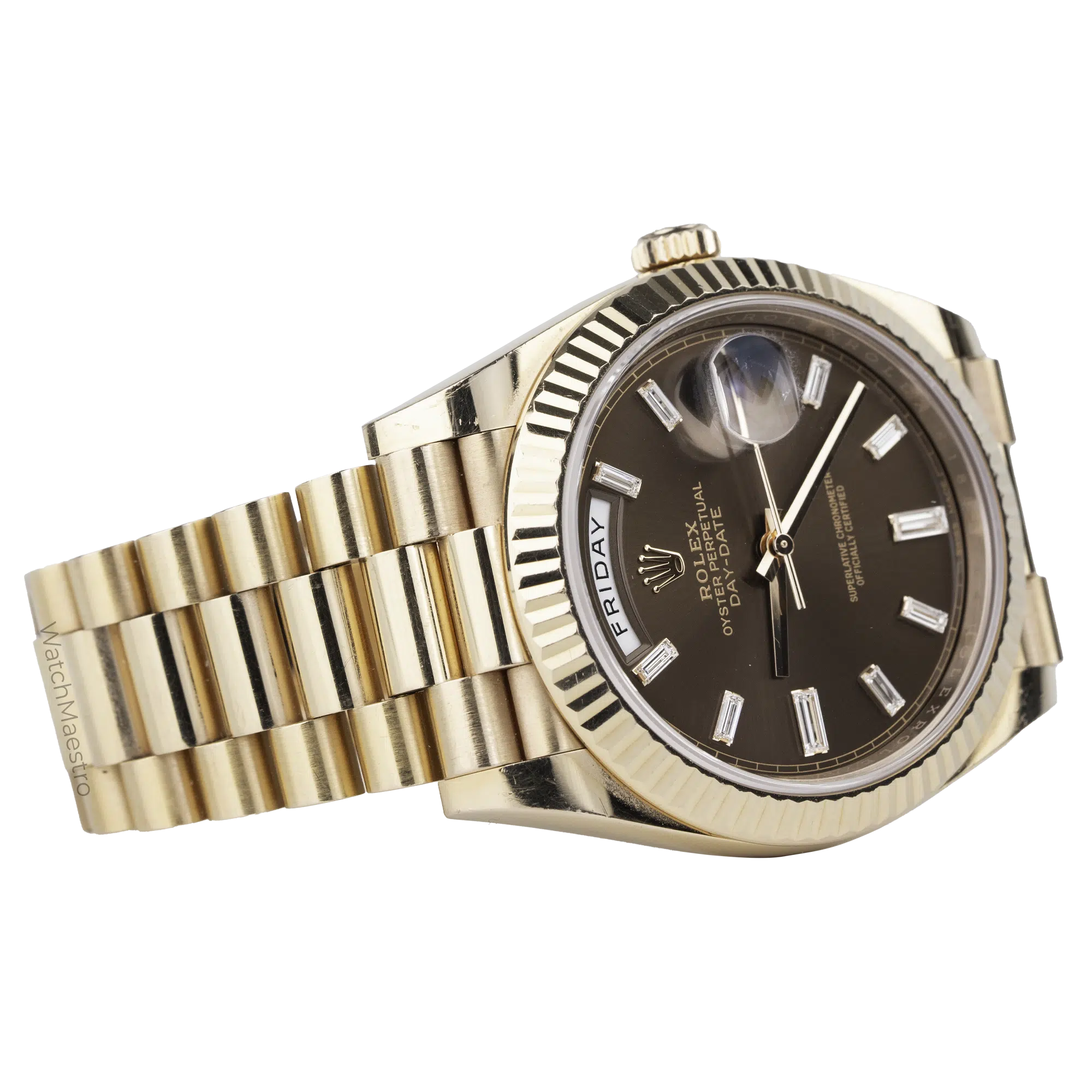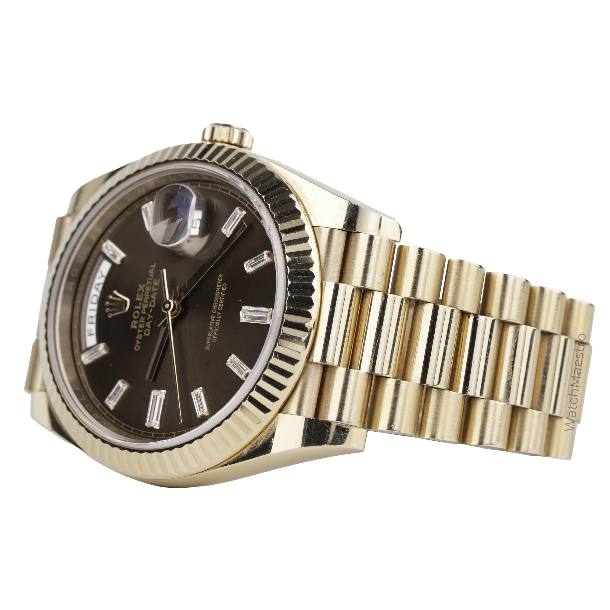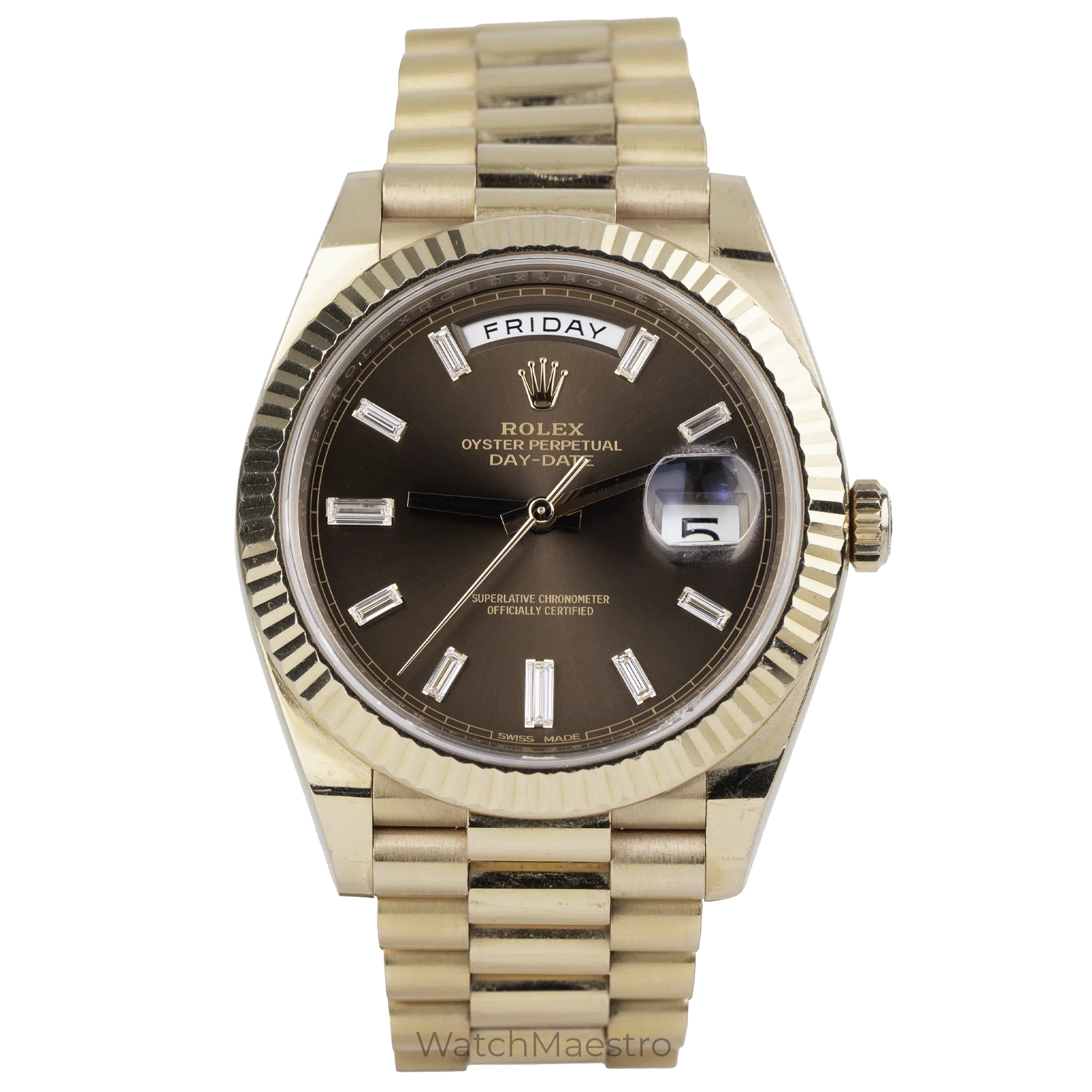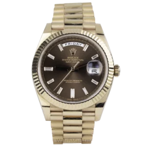 This is a pre-owned Rolex Day-Date 40mm that is still in amazing condition. Purchased in 2018, the timepiece comes complete with box and papers. The timepiece is made out of 18ct Rose Gold, and it comes with a Chocolate dial featuring baguette diamonds. As people call it, it is truly a Presidential watch.  This Rolex watch marks the true symbol of luxury and sophistication.