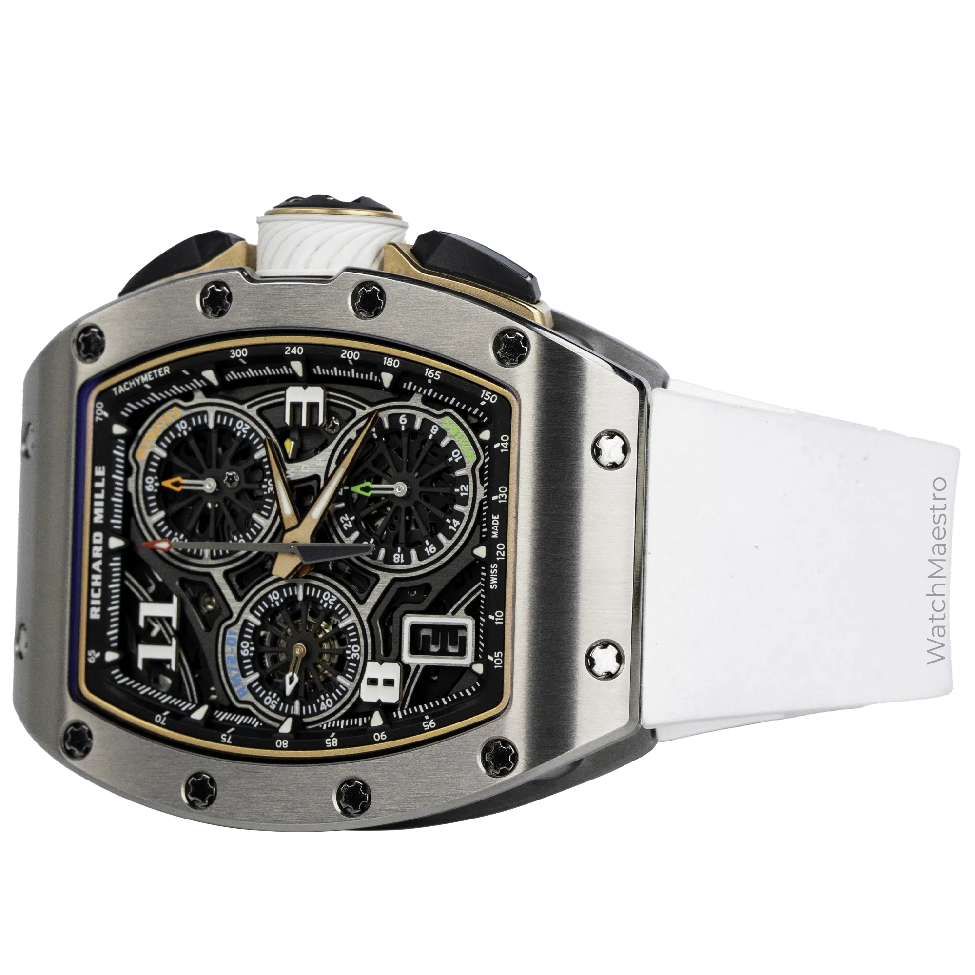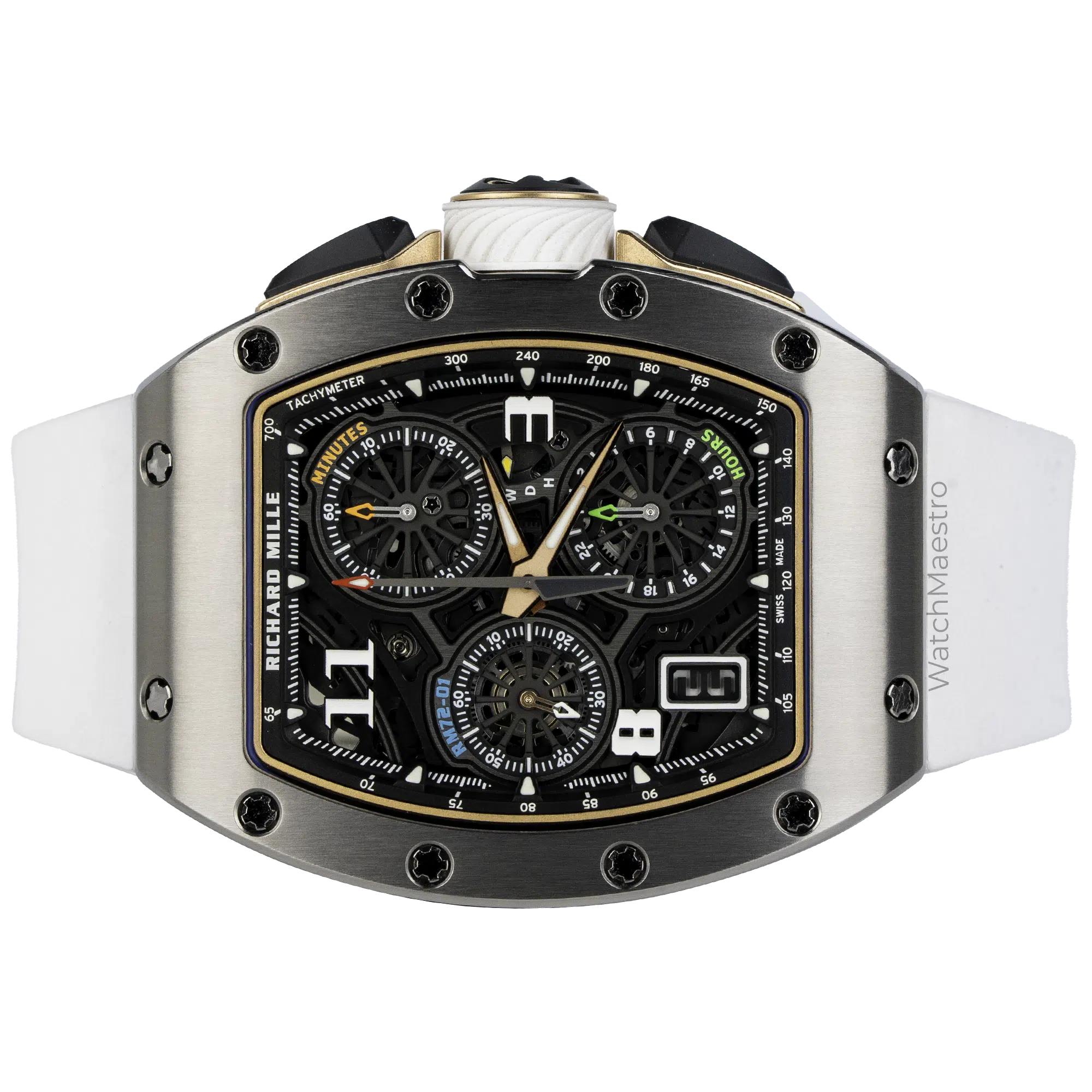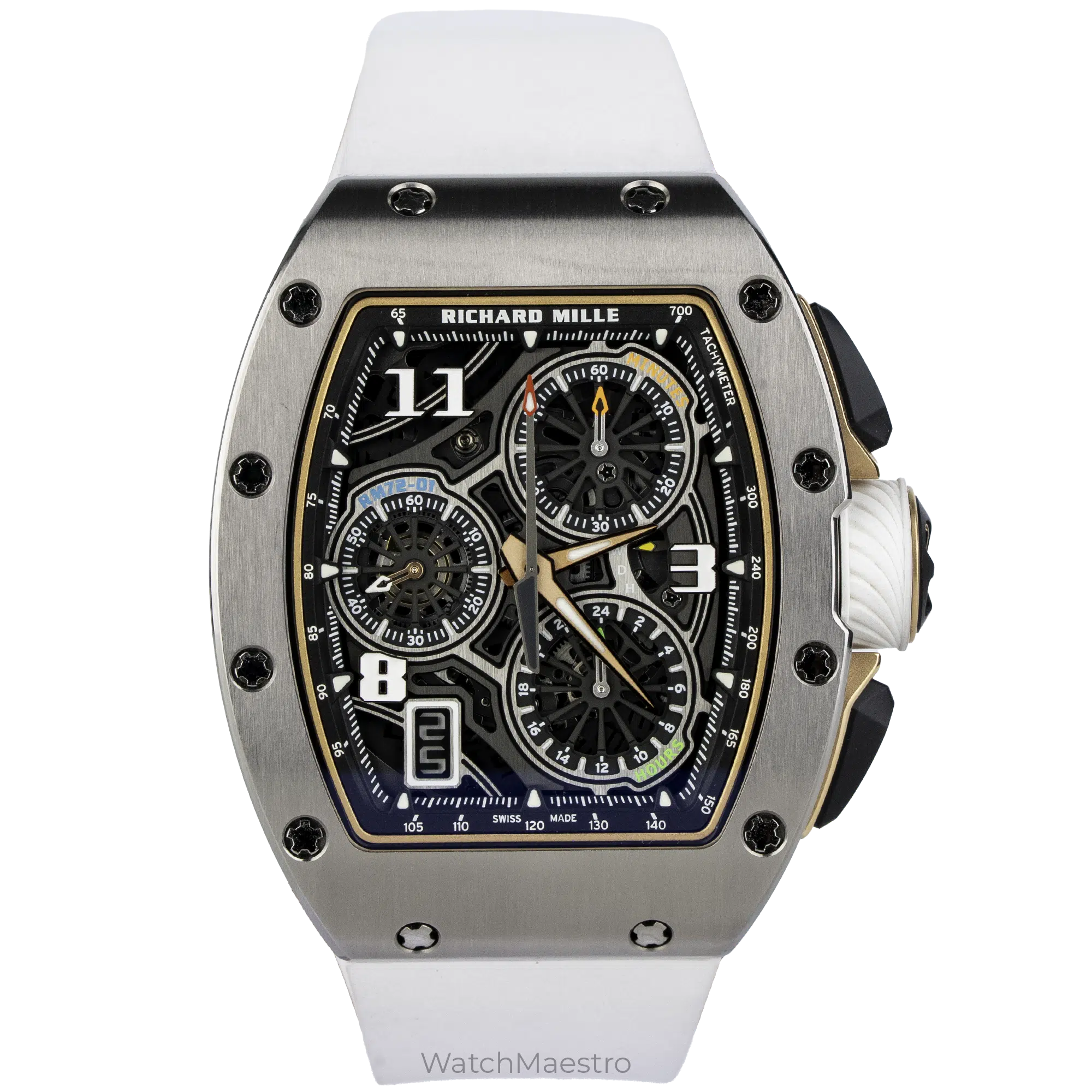 Want an RM that stands out even in a room full of Richard Mille watches? This one is for you! The Richard Mille RM72-01 is definitely a stand out piece offering a flyback chronograph with oscillating pinions. The titanium case ensures a lightweight yet durable construction, making it a perfect fit for those who want a relatively bigger watch but still want it to still feel lighter on the wrist. The white rubber strap adds a sporty touch, while offering superior comfort and flexibility. Purchased in 2022, this RM72-01 is pre-owned, but remains in excellent condition. It comes complete with its original box and papers, ensuring authenticity and traceability.