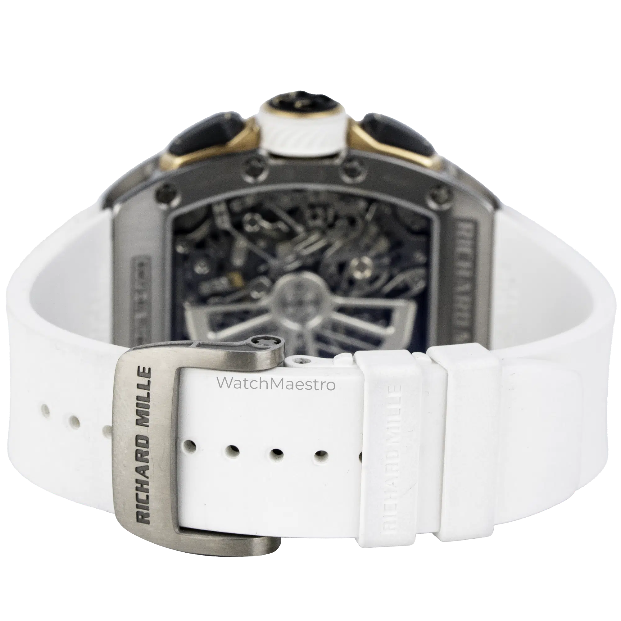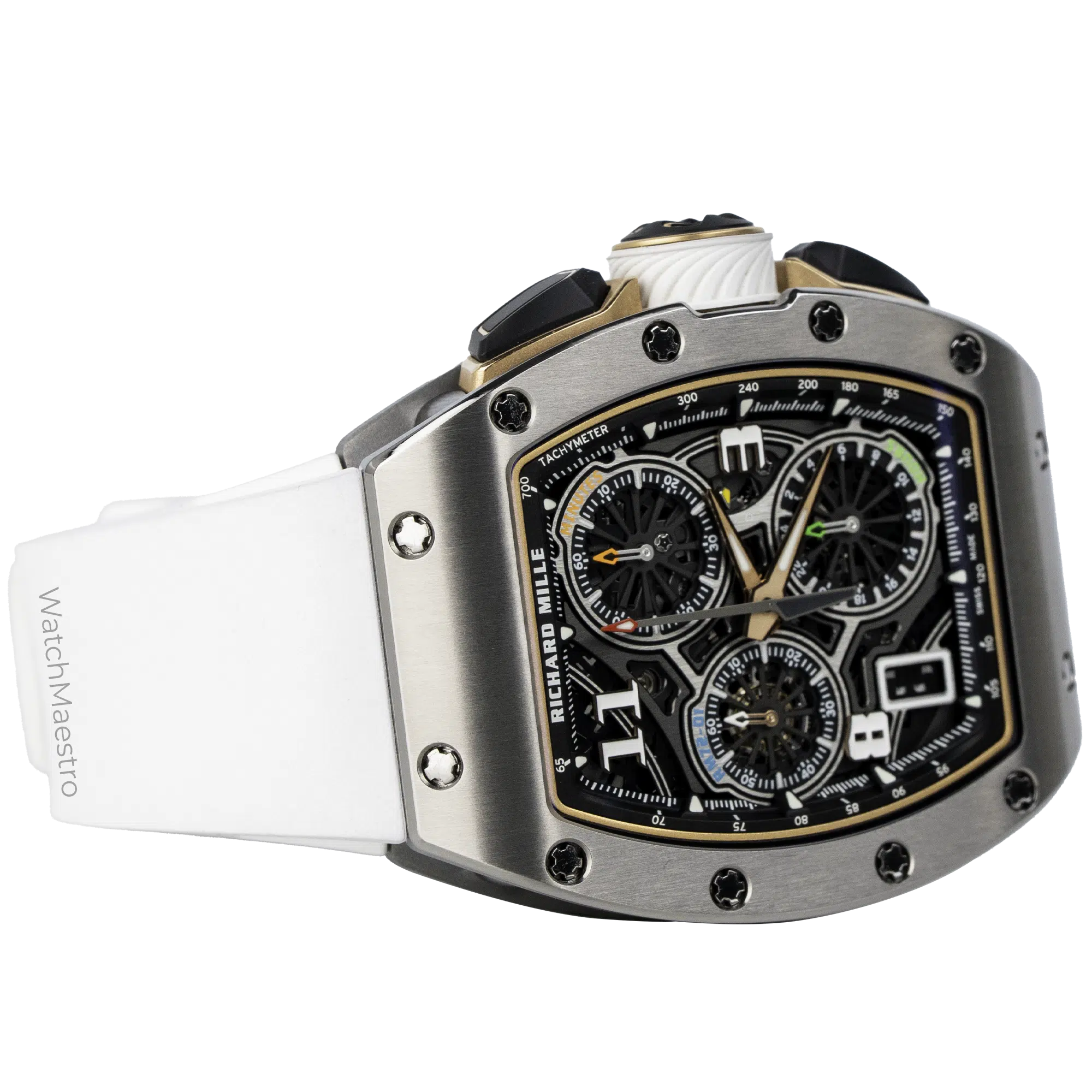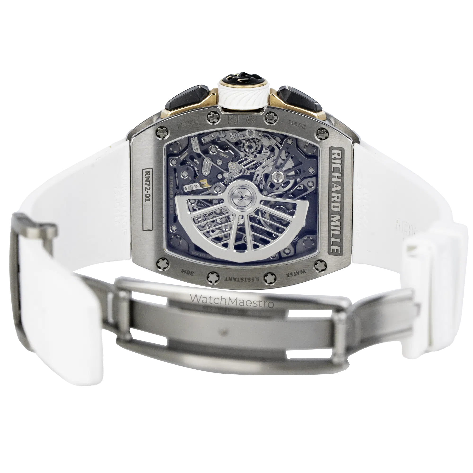 Want an RM that stands out even in a room full of Richard Mille watches? This one is for you! The Richard Mille RM72-01 is definitely a stand out piece offering a flyback chronograph with oscillating pinions. The titanium case ensures a lightweight yet durable construction, making it a perfect fit for those who want a relatively bigger watch but still want it to still feel lighter on the wrist. The white rubber strap adds a sporty touch, while offering superior comfort and flexibility. Purchased in 2022, this RM72-01 is pre-owned, but remains in excellent condition. It comes complete with its original box and papers, ensuring authenticity and traceability.