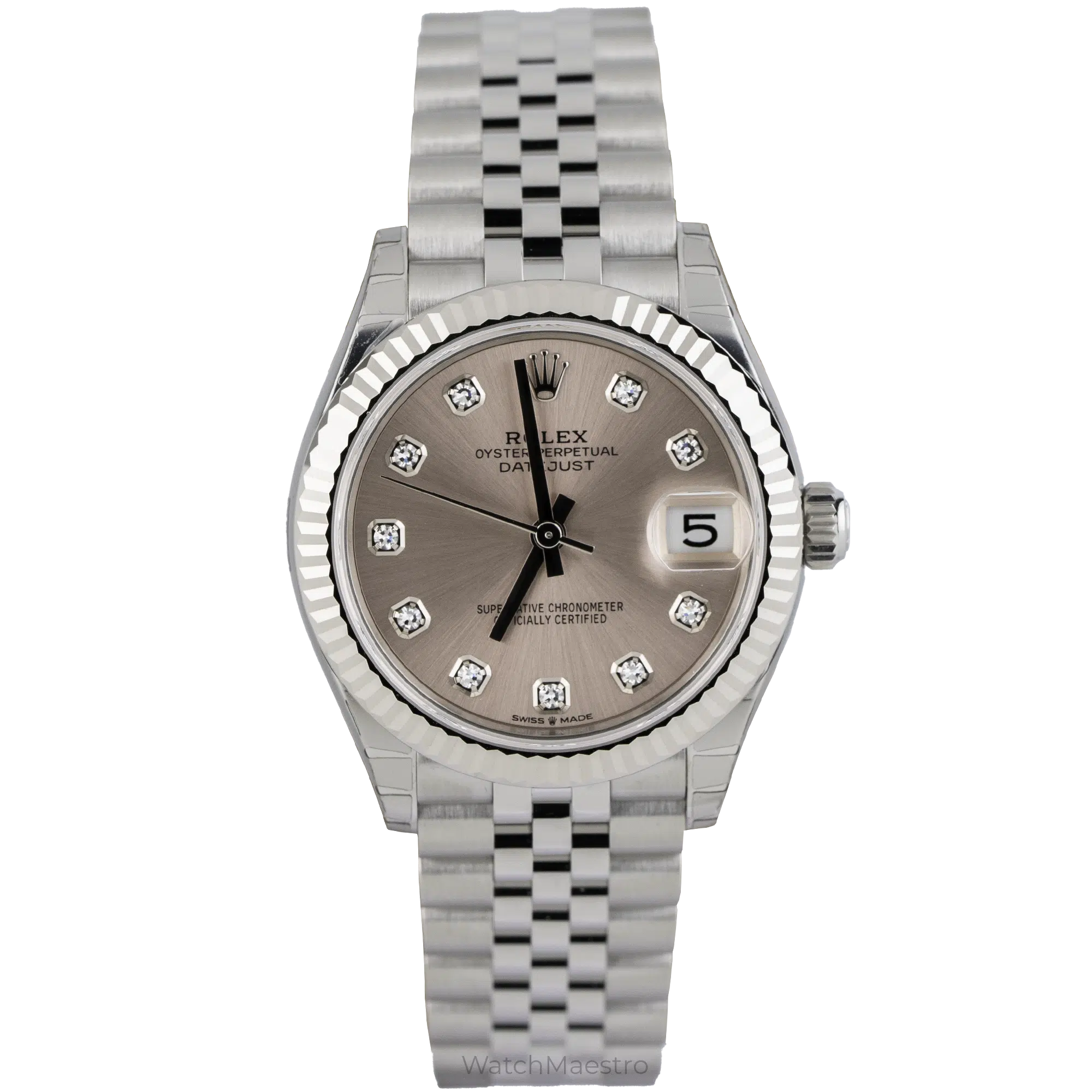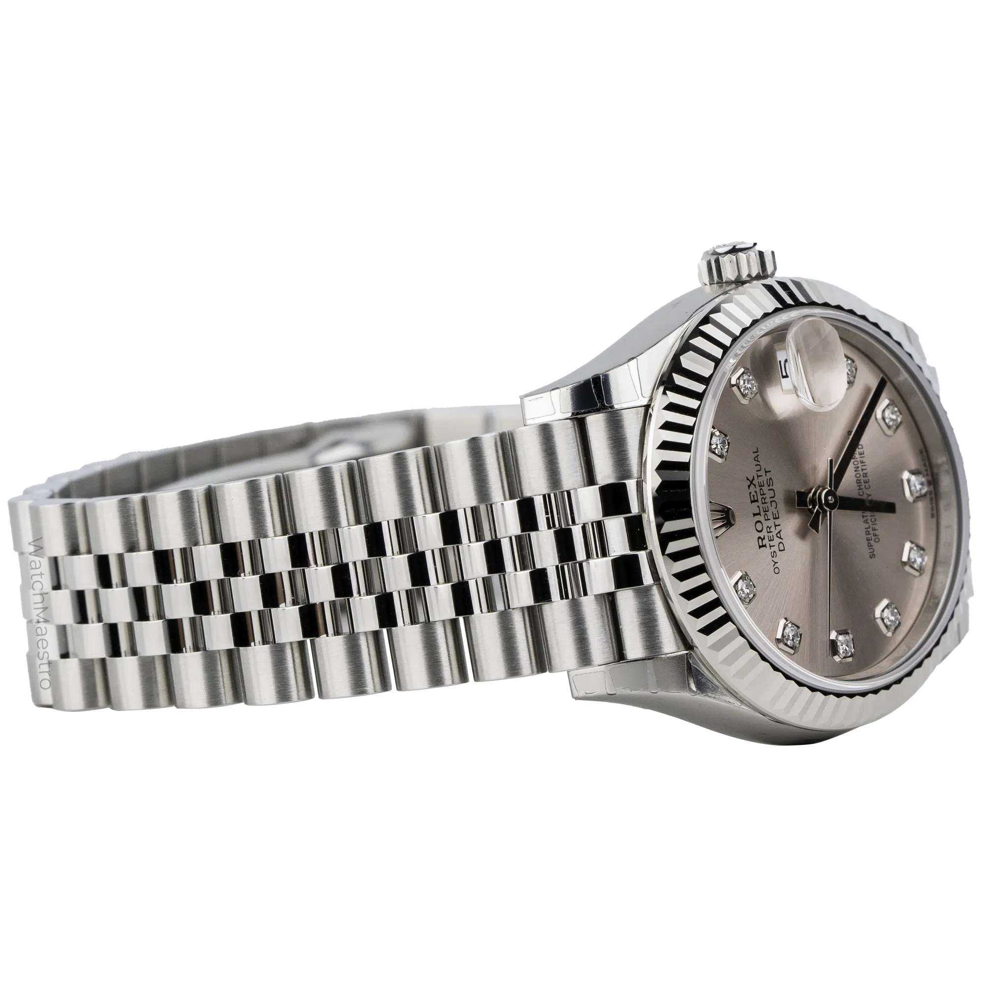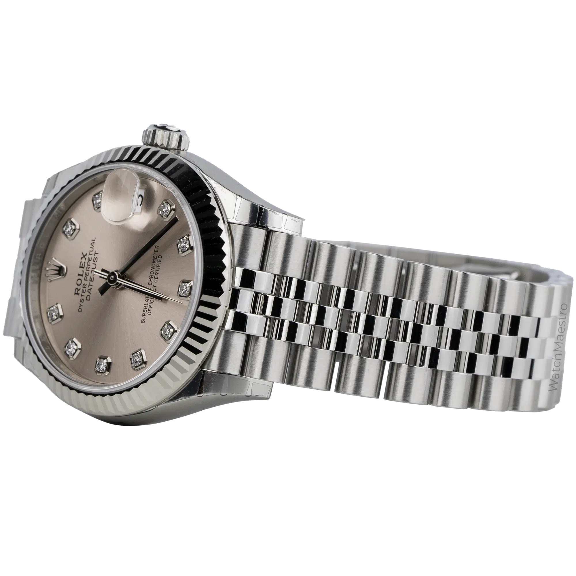 This is the Rolex Datejust 31mm in brand-new condition. The Pink Dial with Diamond-set hour markers adds a subtle charm and a touch of femininity to every glance at your wrist. The Stainless Steel case of the watch is paired with a White Gold Fluted Bezel. It sits on a Stainless Steel Jubilee Bracelet, which sits extremely comfortable on the wrist. The design strikes a perfect balance between elegance and durability, making it the perfect watch for every occasion. Originally purchased in 2025, the watch comes complete with box and papers and it still has its full 5-year Rolex warranty intact.