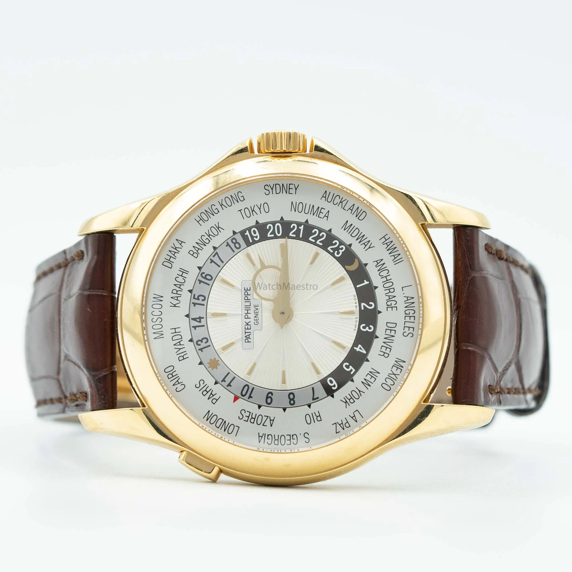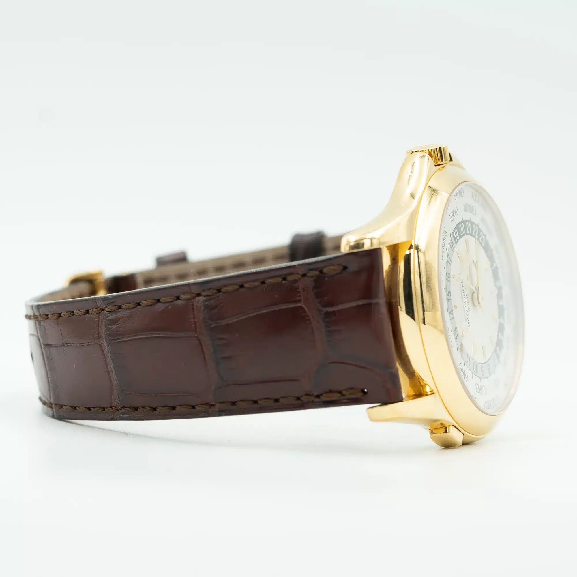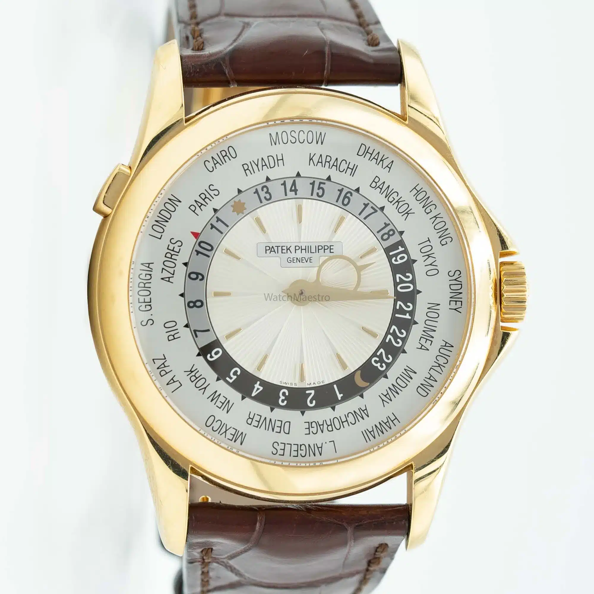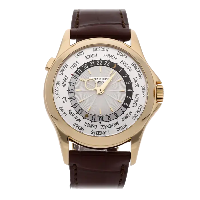 This is a pre-owned Patek Philippe Complications World Time. Designed to tell time for most countries around the globe, this watch is the best companion for frequent travelers. Featuring a 39mm dial, the watch itself is crafted out of yellow gold. It features an alligator leather strap making it comfortable to wear all day.