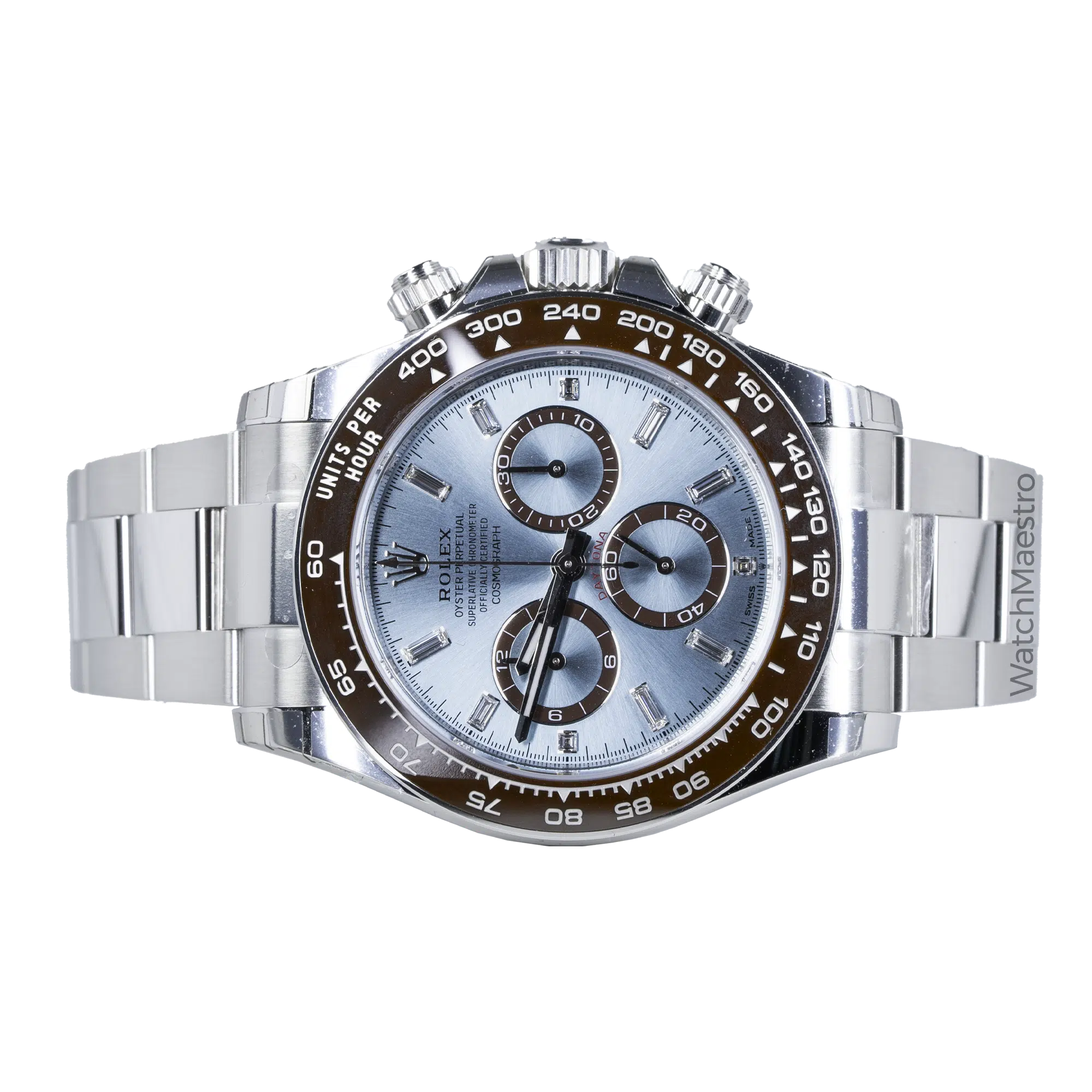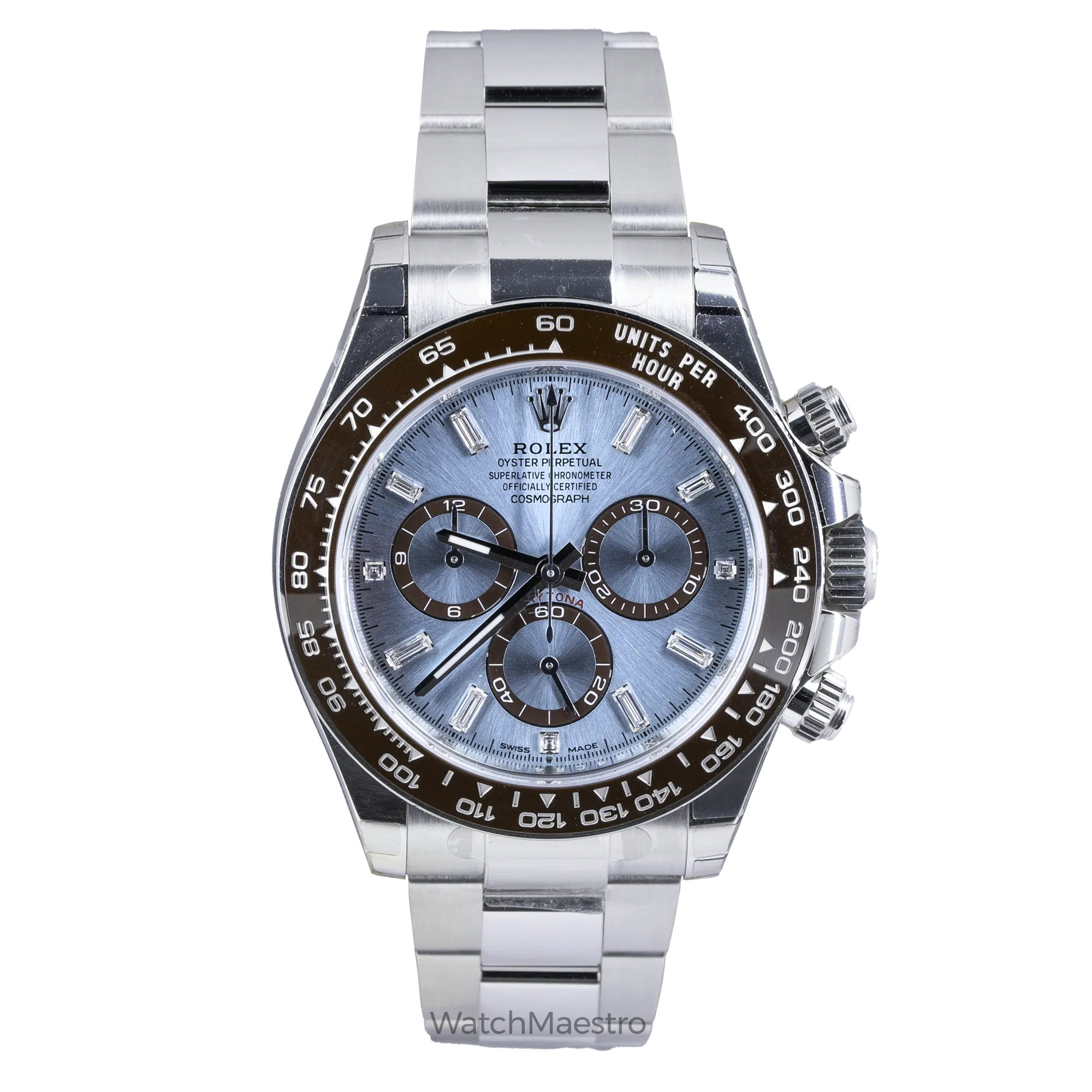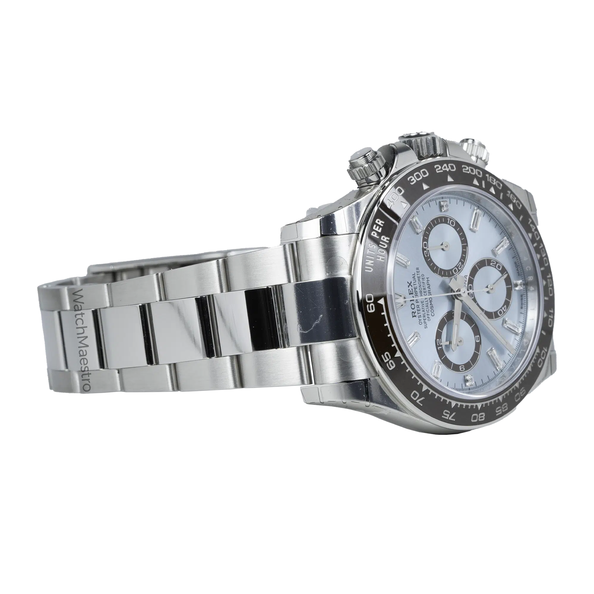 Embrace the epitome of luxury with the all-new Rolex Daytona Platinum reference 126506 featuring an Open Case Back. Crafted from the finest materials, the platinum construction of this watch adds the right amount of weight to your wrist. The iconic design of the Daytona collection, coupled with the platinum case and bracelet, exudes an understated look. It features a total of 11 Baguette Diamonds on the Ice Blue Dial making this one really stand out. Acquired in 2023, this brand-new unworn Rolex Daytona arrives with its original boxes and papers. Being released in 2023, there are only a few out there in the market right now. So, if you want to feel special, this is your chance to get ahead in the game of luxury watches.