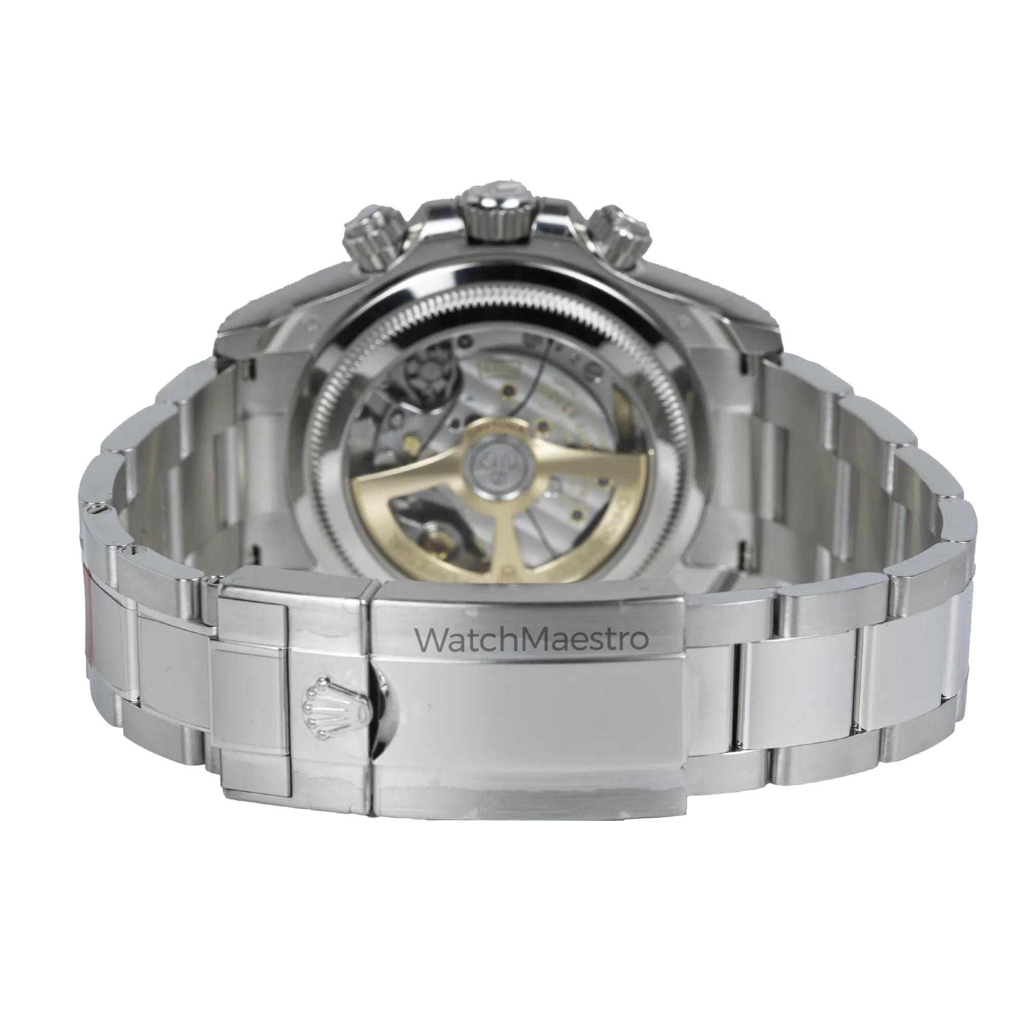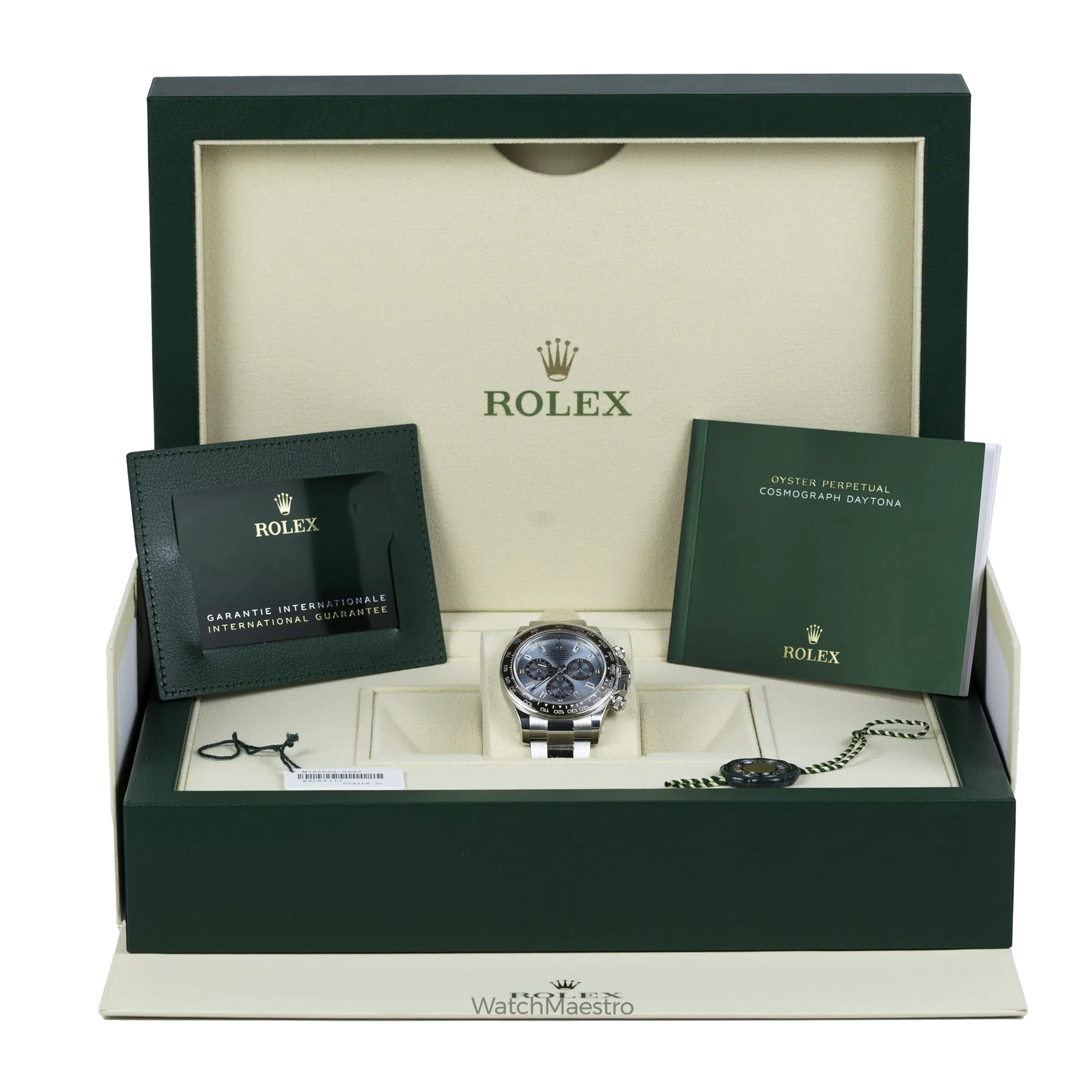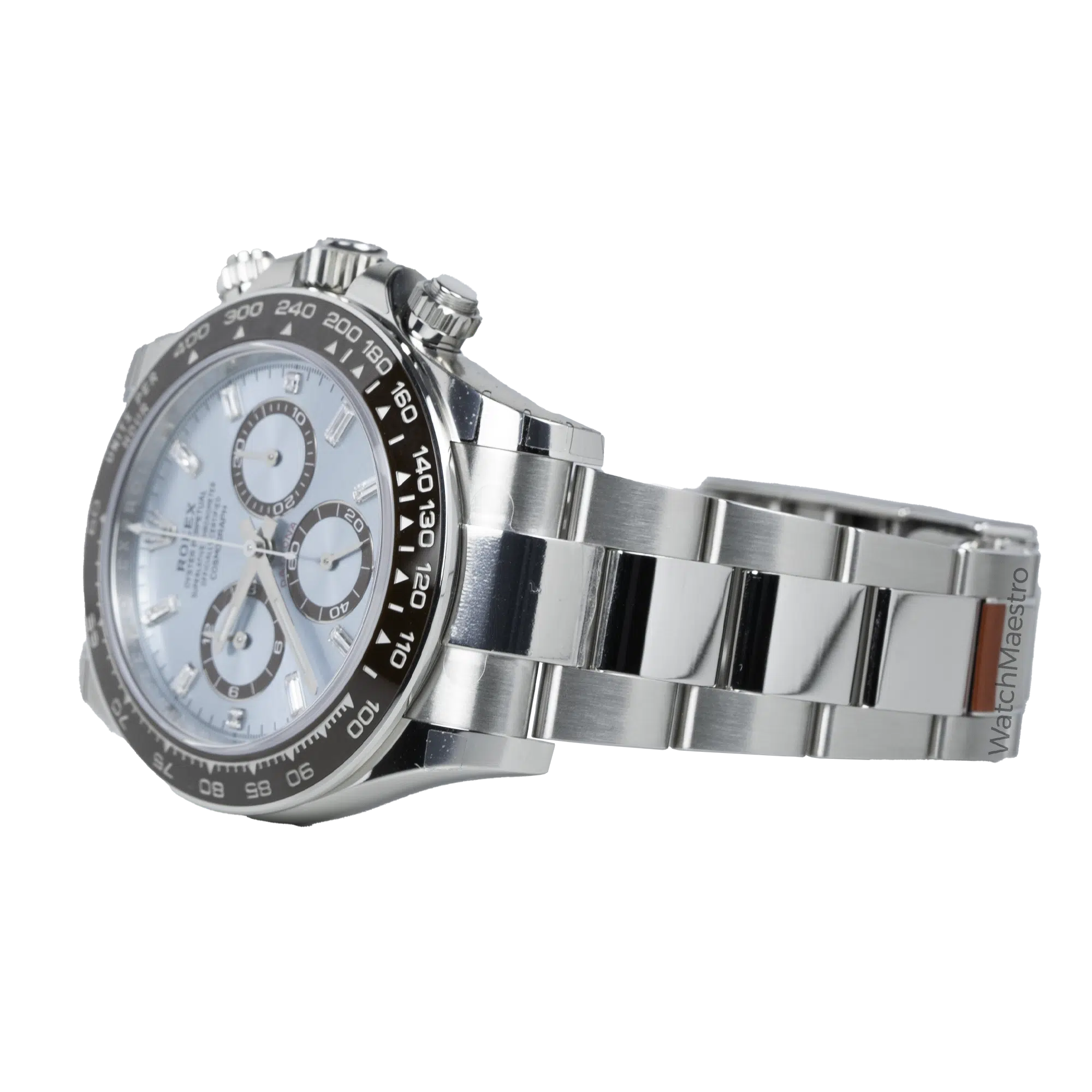 Embrace the epitome of luxury with the all-new Rolex Daytona Platinum reference 126506 featuring an Open Case Back. Crafted from the finest materials, the platinum construction of this watch adds the right amount of weight to your wrist. The iconic design of the Daytona collection, coupled with the platinum case and bracelet, exudes an understated look. It features a total of 11 Baguette Diamonds on the Ice Blue Dial making this one really stand out. Acquired in 2023, this brand-new unworn Rolex Daytona arrives with its original boxes and papers. Being released in 2023, there are only a few out there in the market right now. So, if you want to feel special, this is your chance to get ahead in the game of luxury watches.