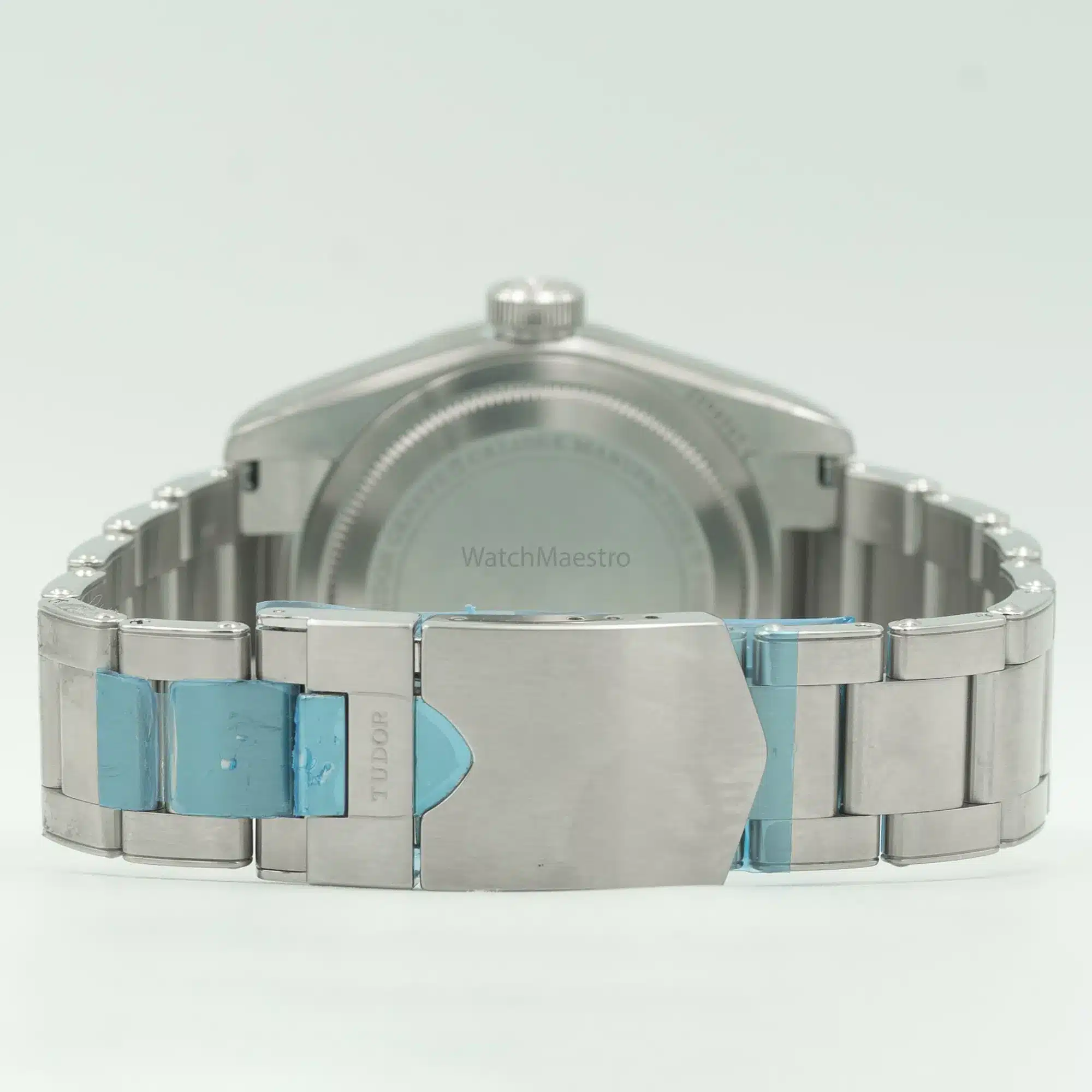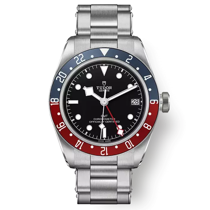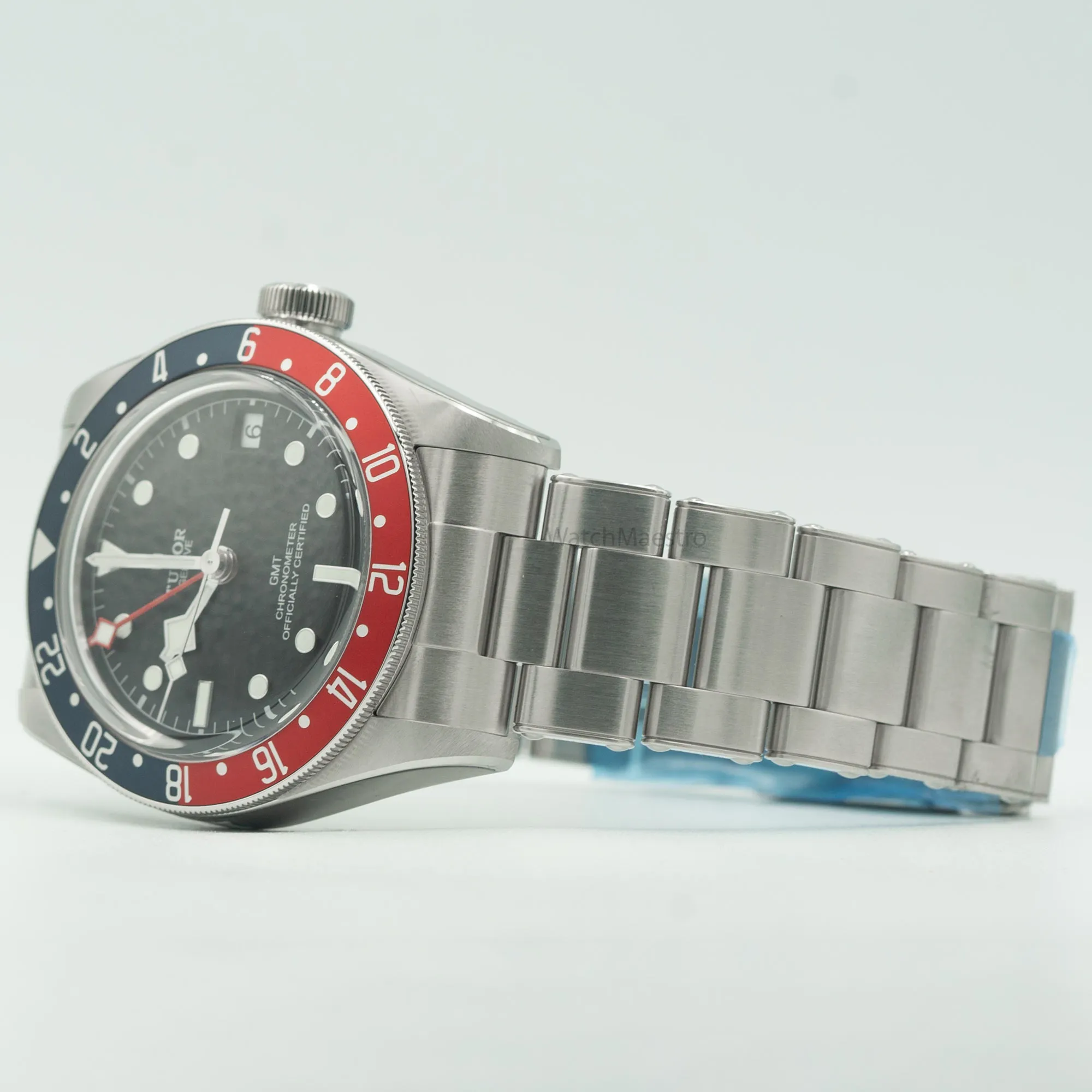 This is an unworn Tudor Black Bay GMT watch with the iconic Pepsi bezel. Purchased in 2021, the timepiece comes complete with box and papers. It features a 41mm black dial and a steel bracelet. The watch has never been worn and still has factory stickers on it.