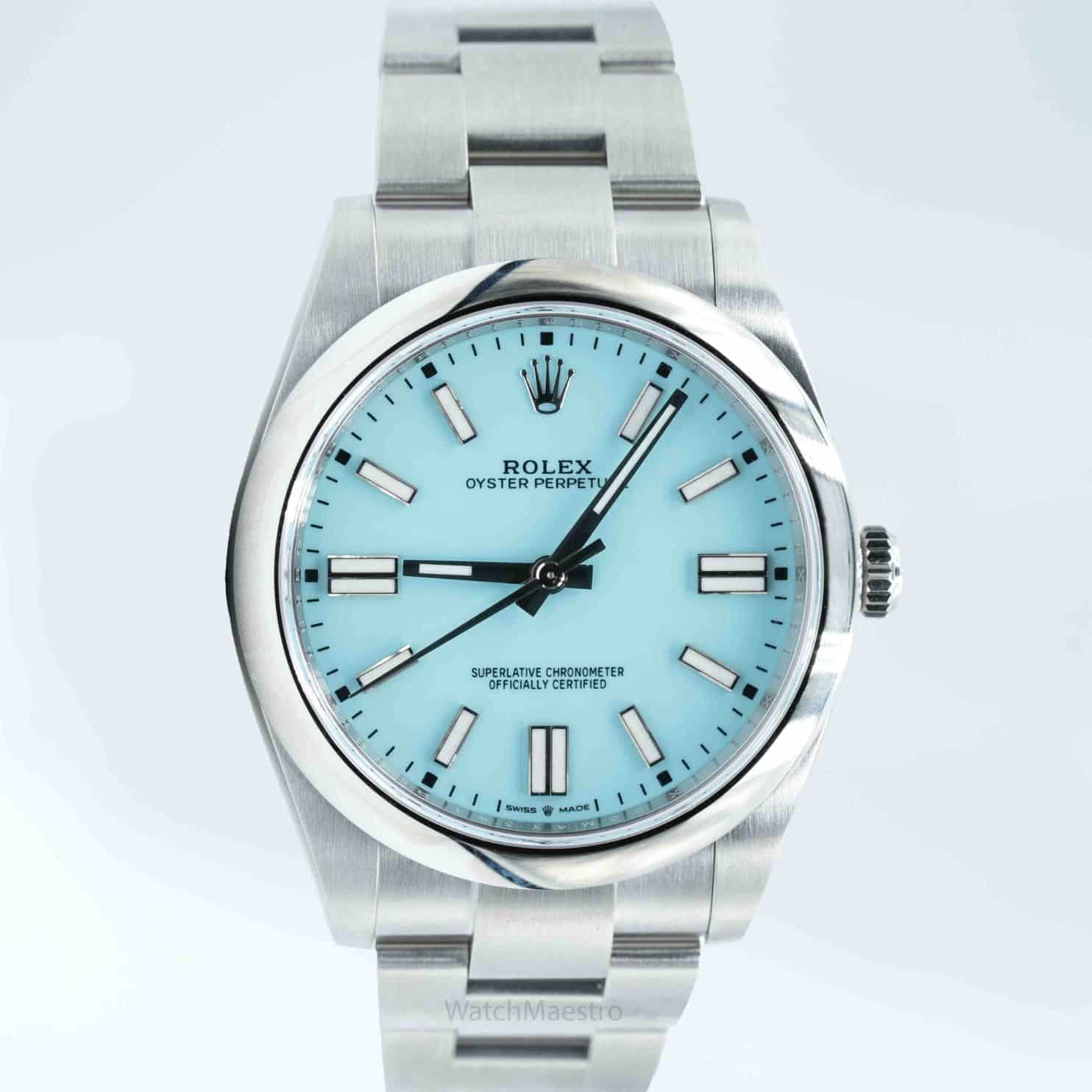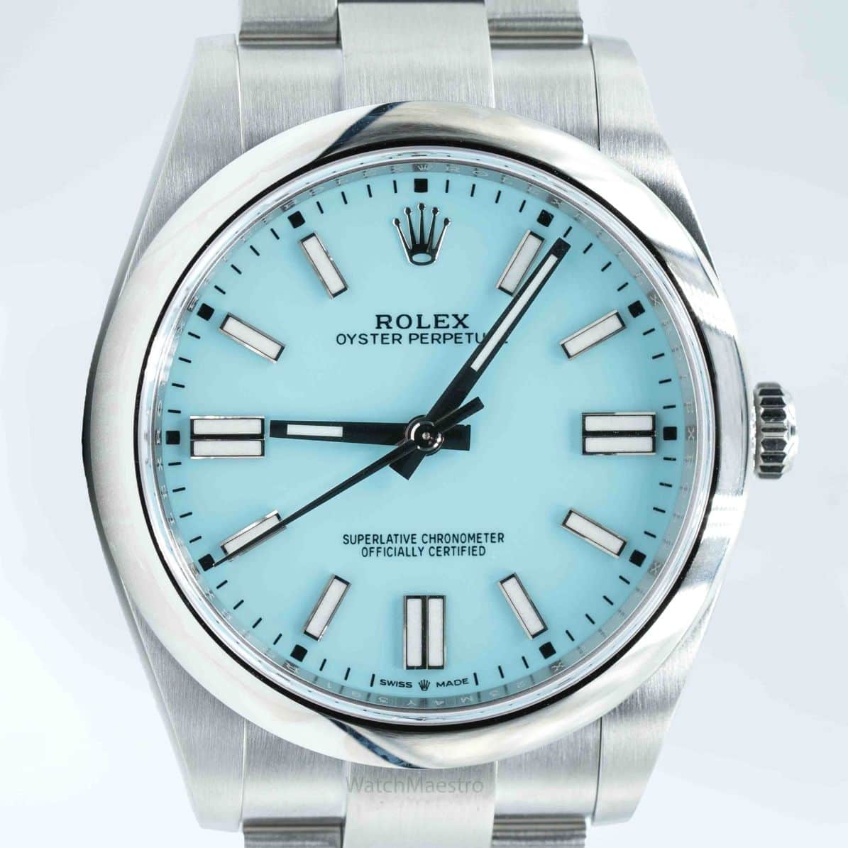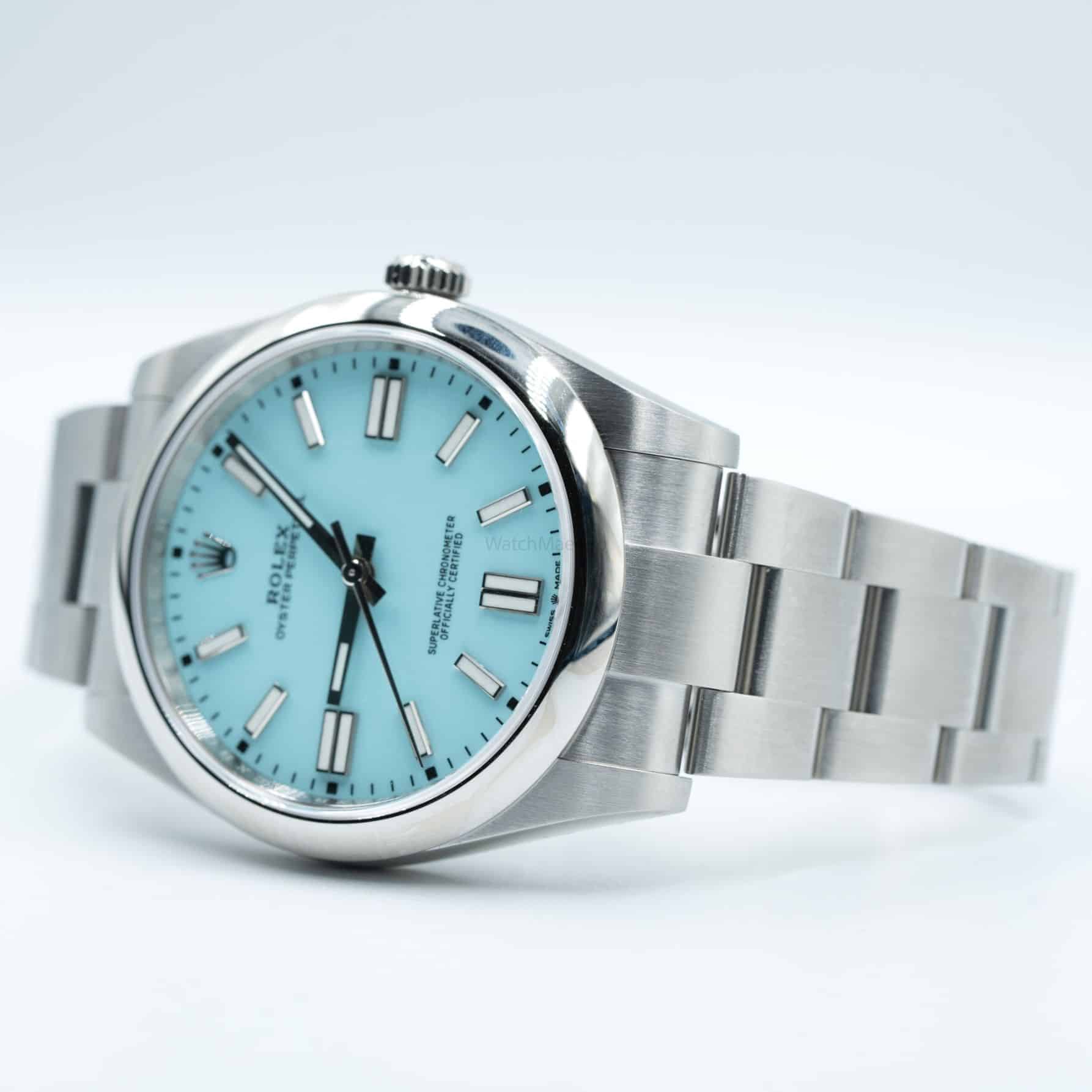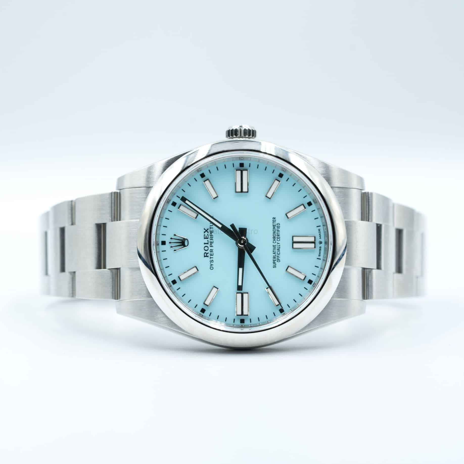 This is a brand-new Rolex Oyster Perpetual 41 ref. 124300 sports a 41mm Turquoise blue dial, which is also popularly known as the Tiffany dial. The watch was purchased in January 2022 and comes with all the paperwork. The Rolex Oyster Perpetual’s 41mm case is made out of Oystersteel, and it comes with the Oyster bracelet.