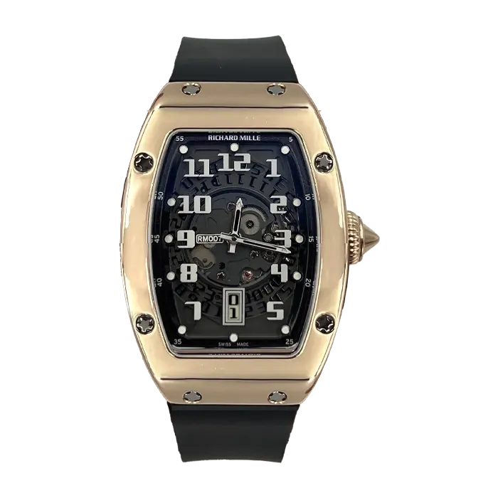 This is a pre-owned Richard Mille RM07 crafted in Rose Gold. Purchased in 2011, the watch is still in a great condition and comes complete with box and papers. At 31mm in width, this women’s watch is the perfect size for everyday wear. The watch even features a date complication that is placed at the 6 o’clock marker.