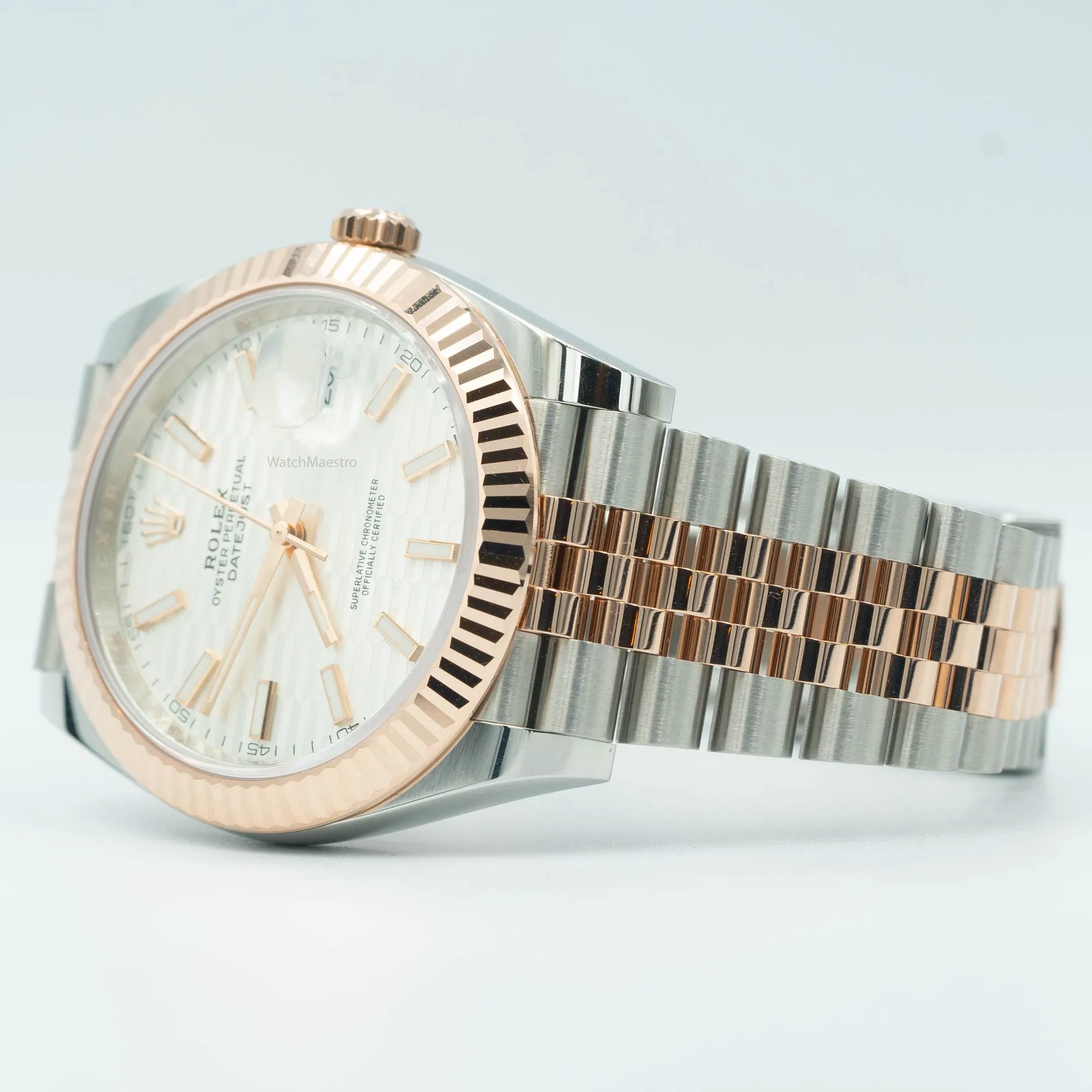 This is a brand-new Rolex Datejust 41 with a two-tone Jubilee bracelet. Purchased in 2022, the watch comes in a complete set with original box and papers. The watch features a White Fluted 41mm dial, which is further complemented by the 18ct Rose Gold Fluted Bezel. It is a recently launched colorway and not many people own it making it extremely desirable.