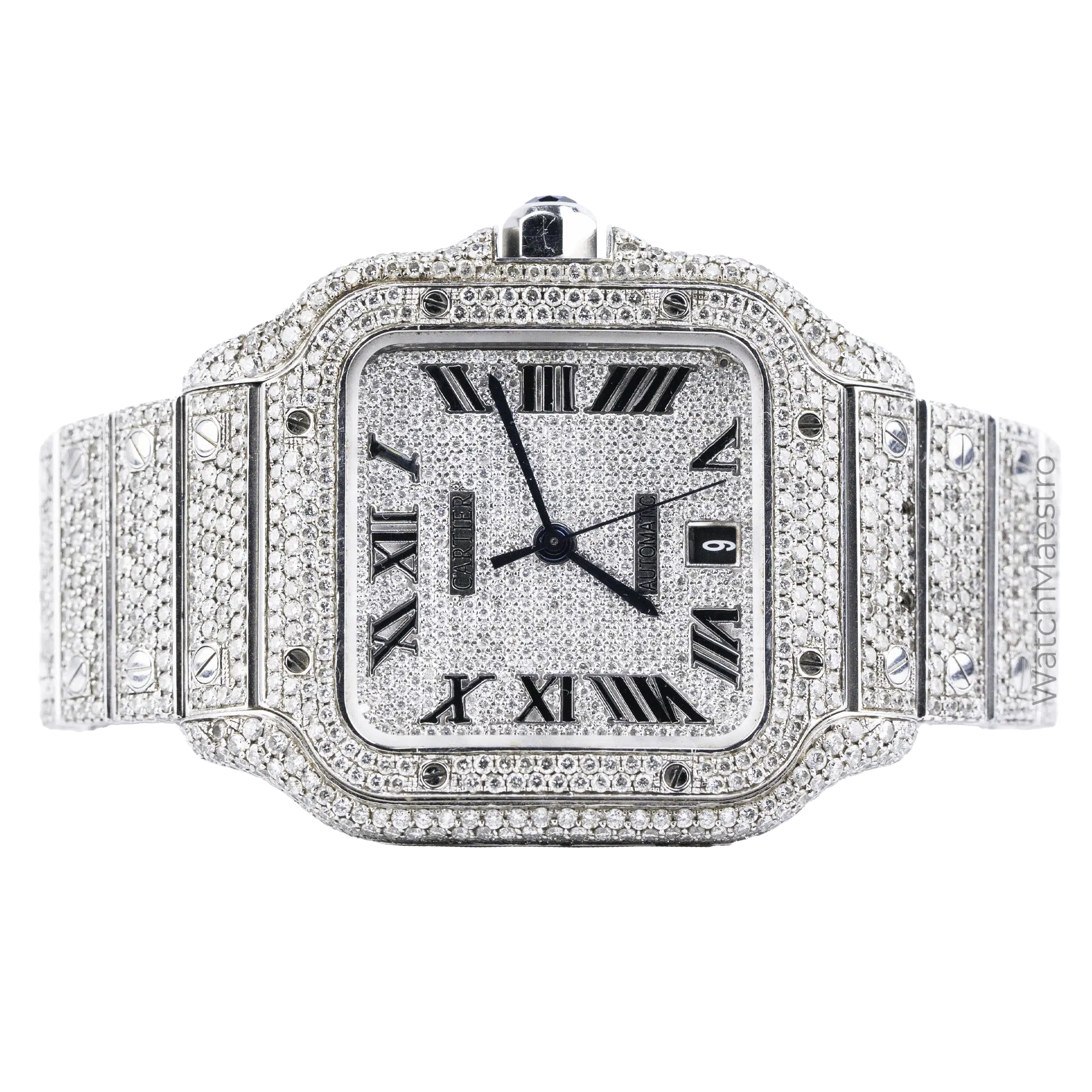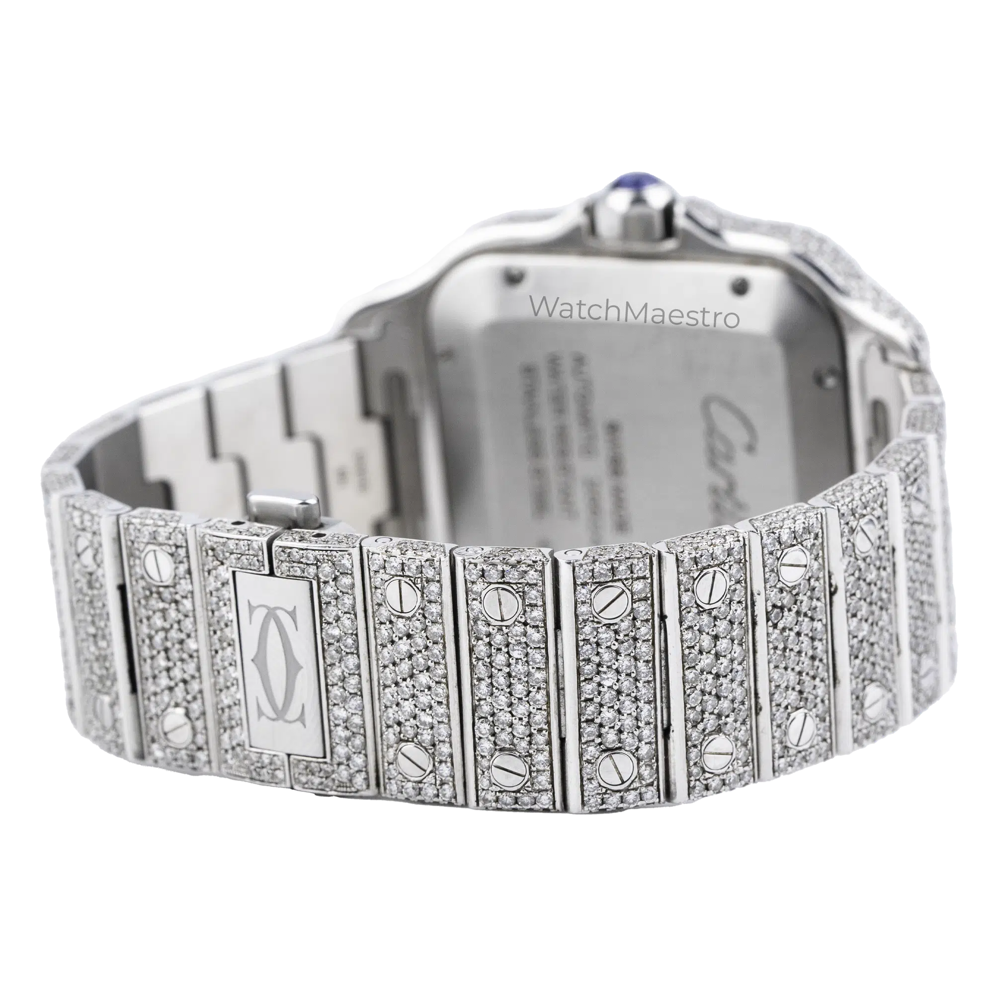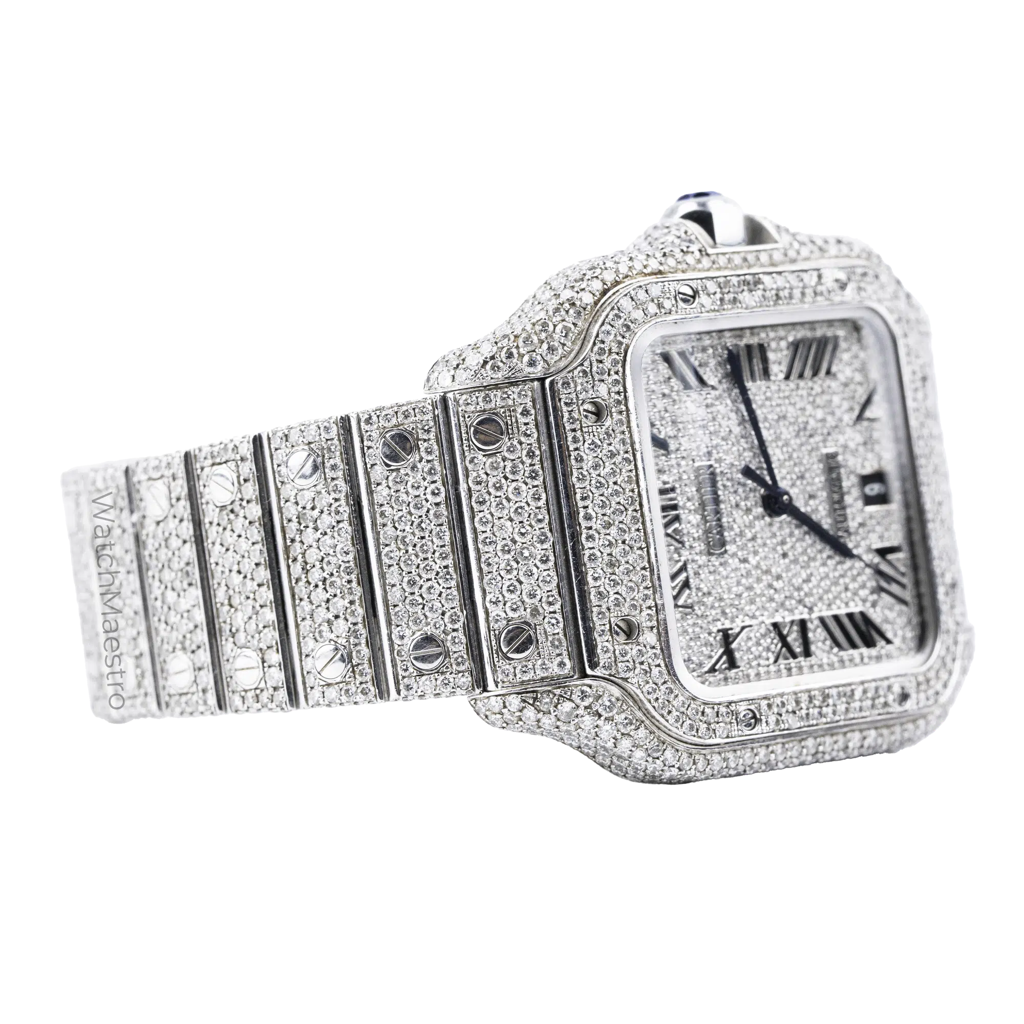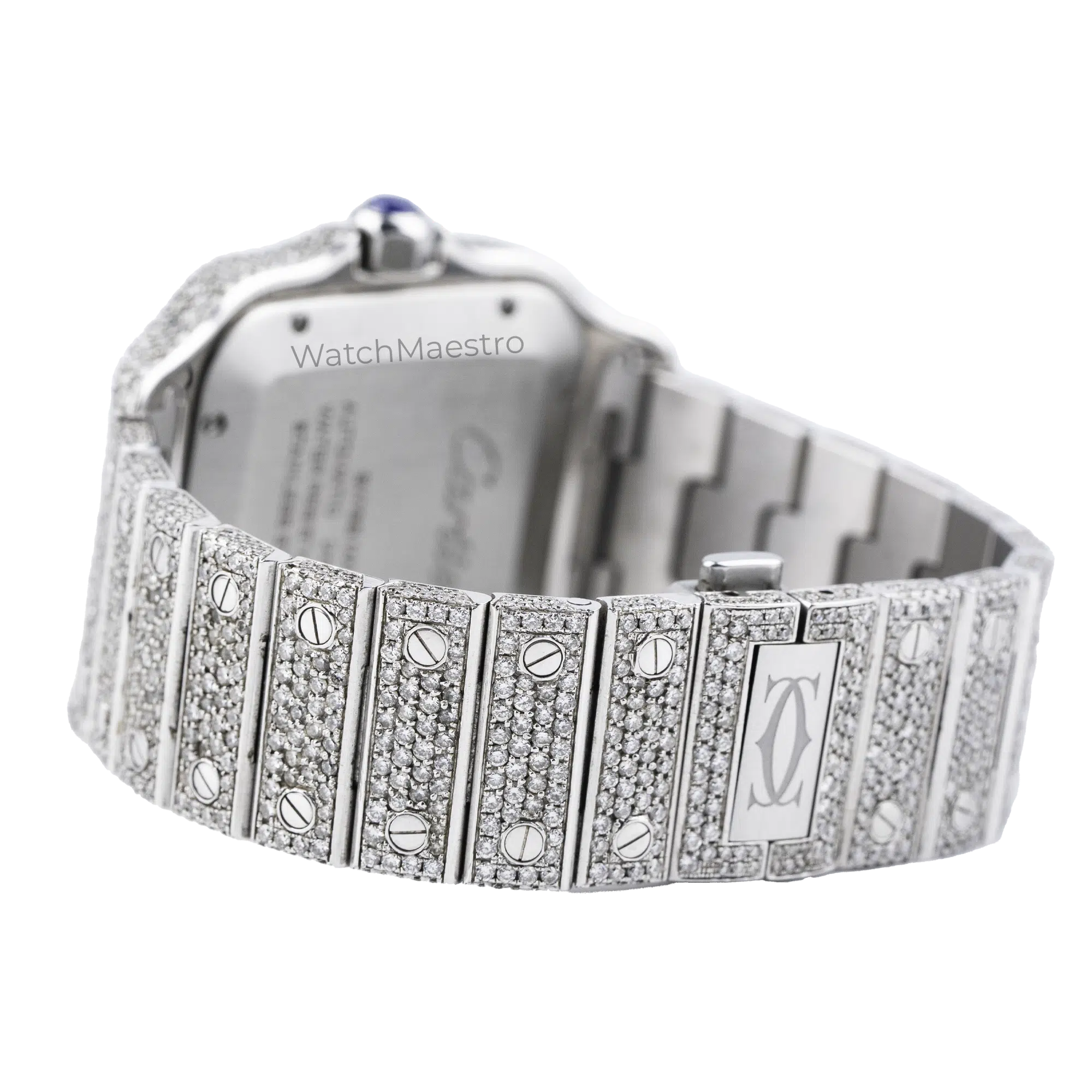 Add this dazzling iced-out Cartier watch to your collection. This is a Cartier Santos that has been treated with high-quality aftermarket diamonds on the case and the bracelet. Even the dial has been replaced with an aftermarket one featuring diamonds on it. Its 39.8mm stainless steel case, alongside the iced bracelet, just stands out and grabs all the attention towards your wrist. This is the perfect watch to wear out at parties and clubs. Shining with diamonds all across, this is a pre-owned watch that was originally purchased in 2022 and is still in great condition. It ships complete with box and papers.