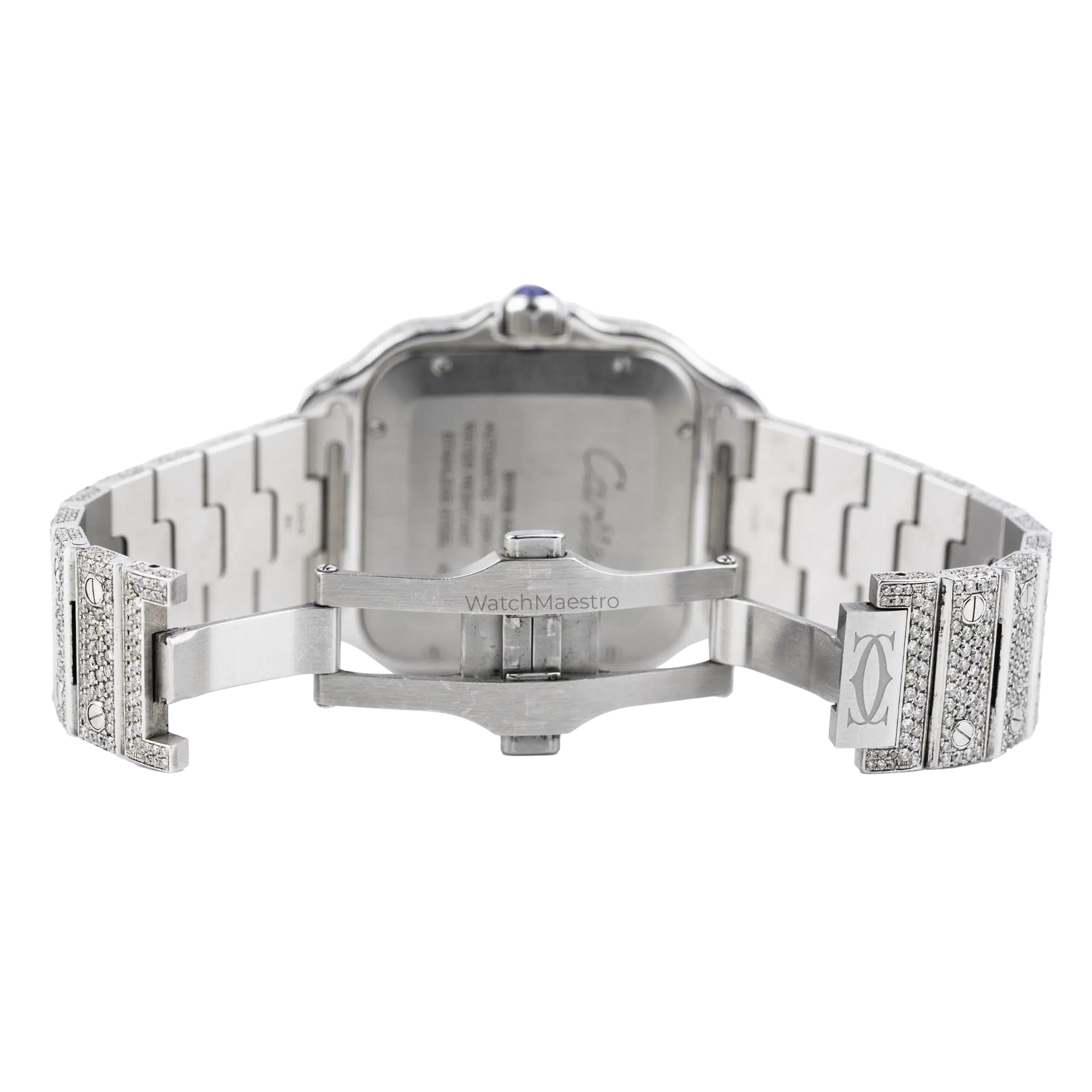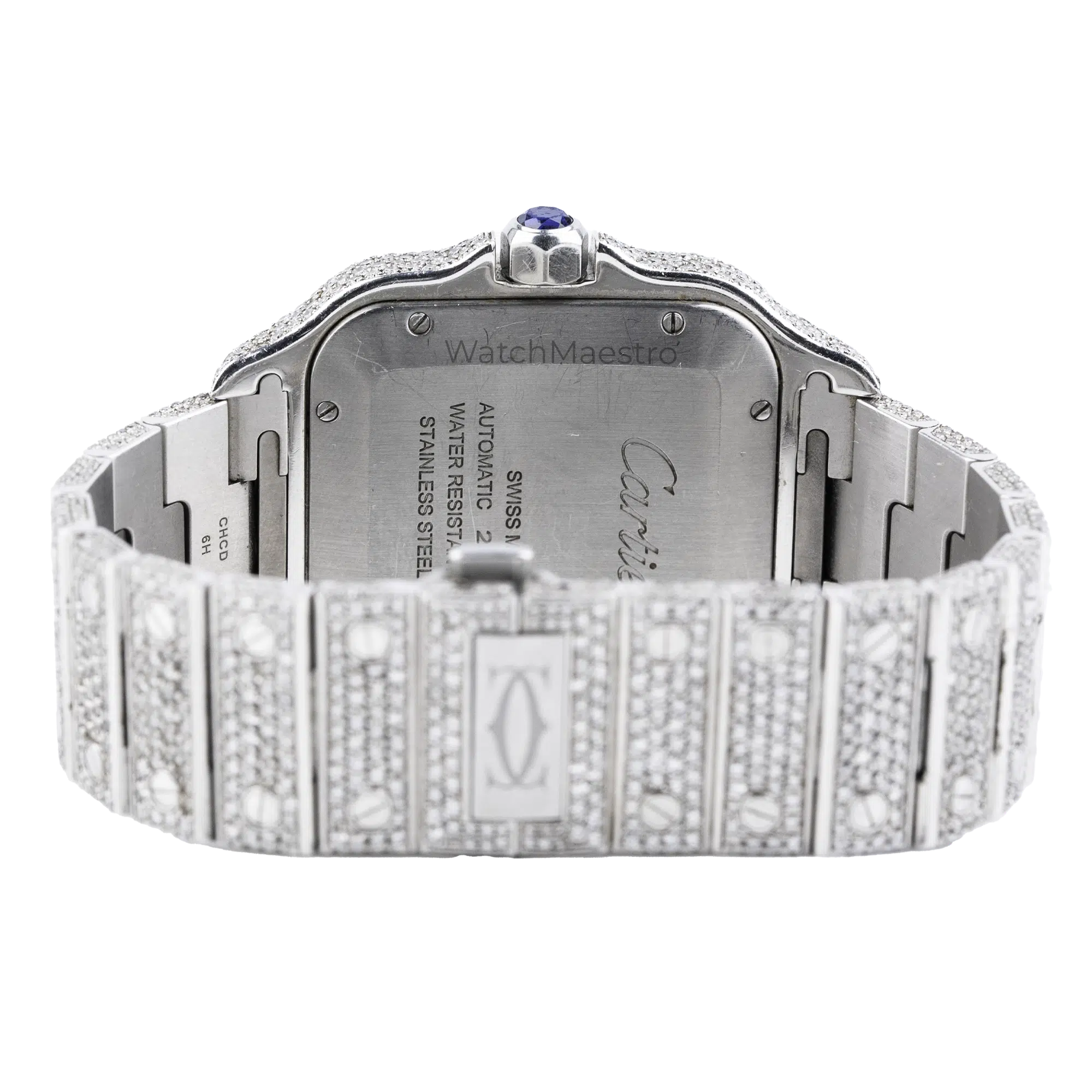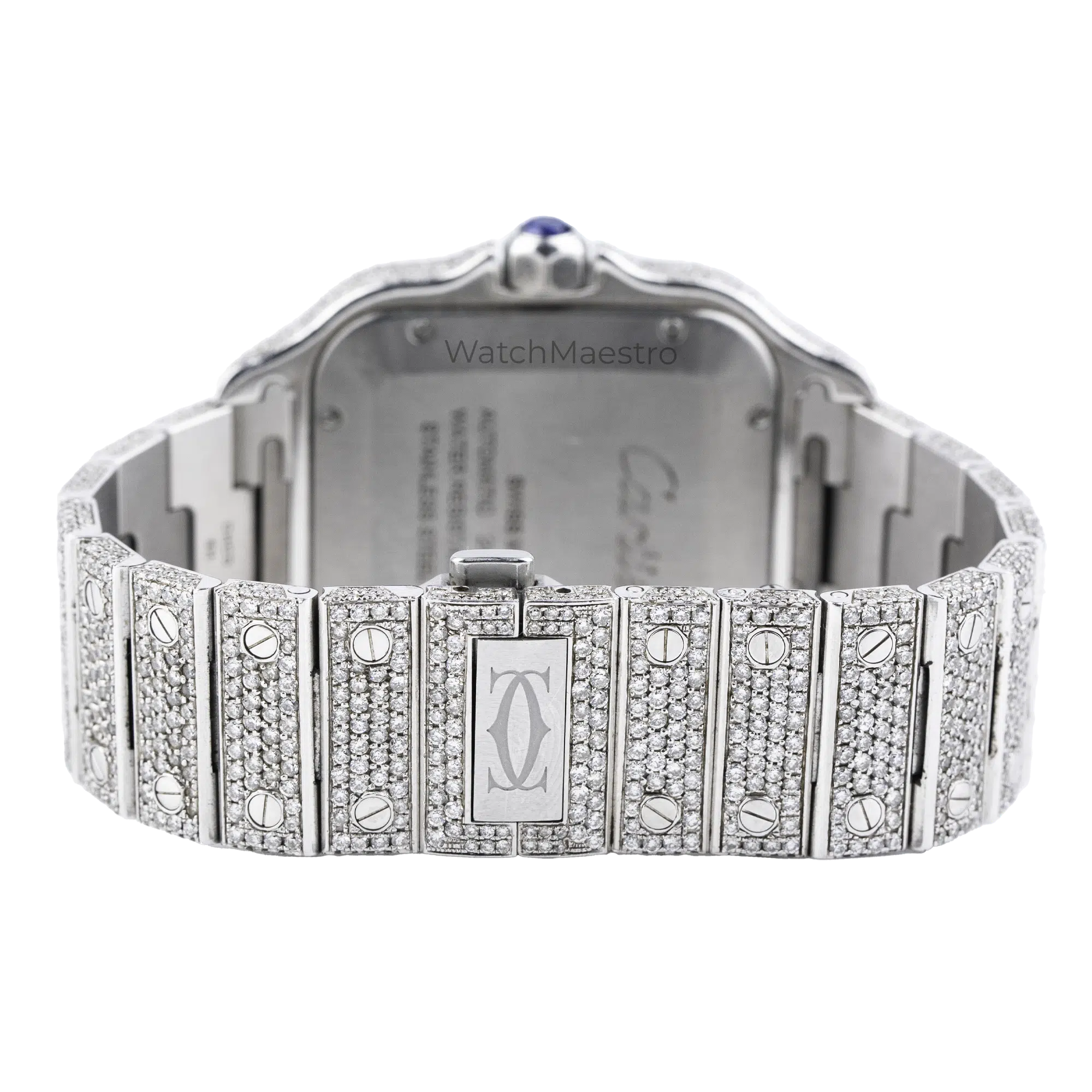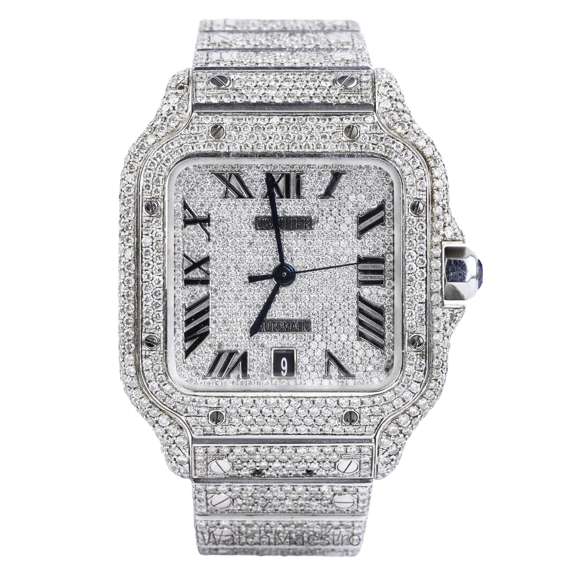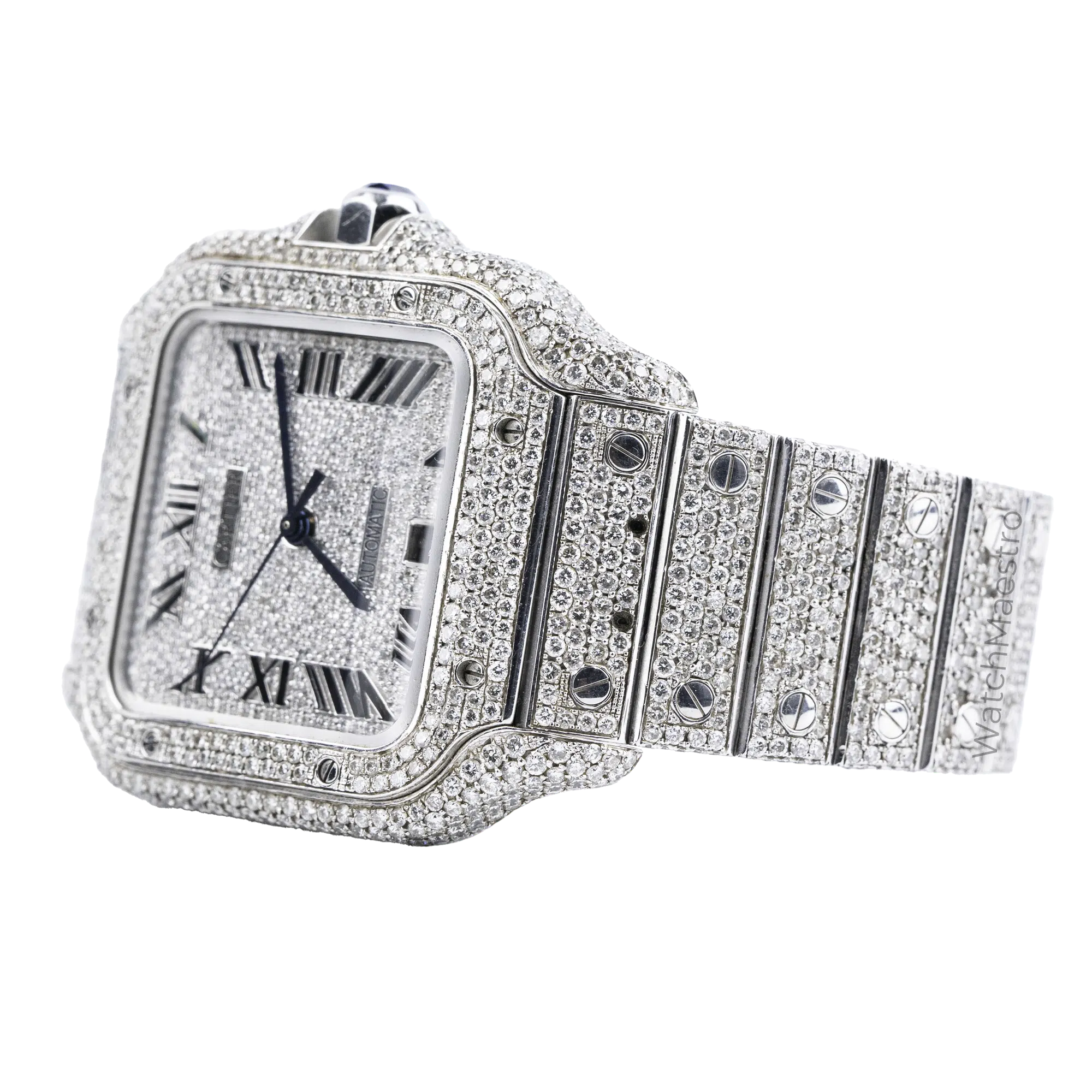 Add this dazzling iced-out Cartier watch to your collection. This is a Cartier Santos that has been treated with high-quality aftermarket diamonds on the case and the bracelet. Even the dial has been replaced with an aftermarket one featuring diamonds on it. Its 39.8mm stainless steel case, alongside the iced bracelet, just stands out and grabs all the attention towards your wrist. This is the perfect watch to wear out at parties and clubs. Shining with diamonds all across, this is a pre-owned watch that was originally purchased in 2022 and is still in great condition. It ships complete with box and papers.