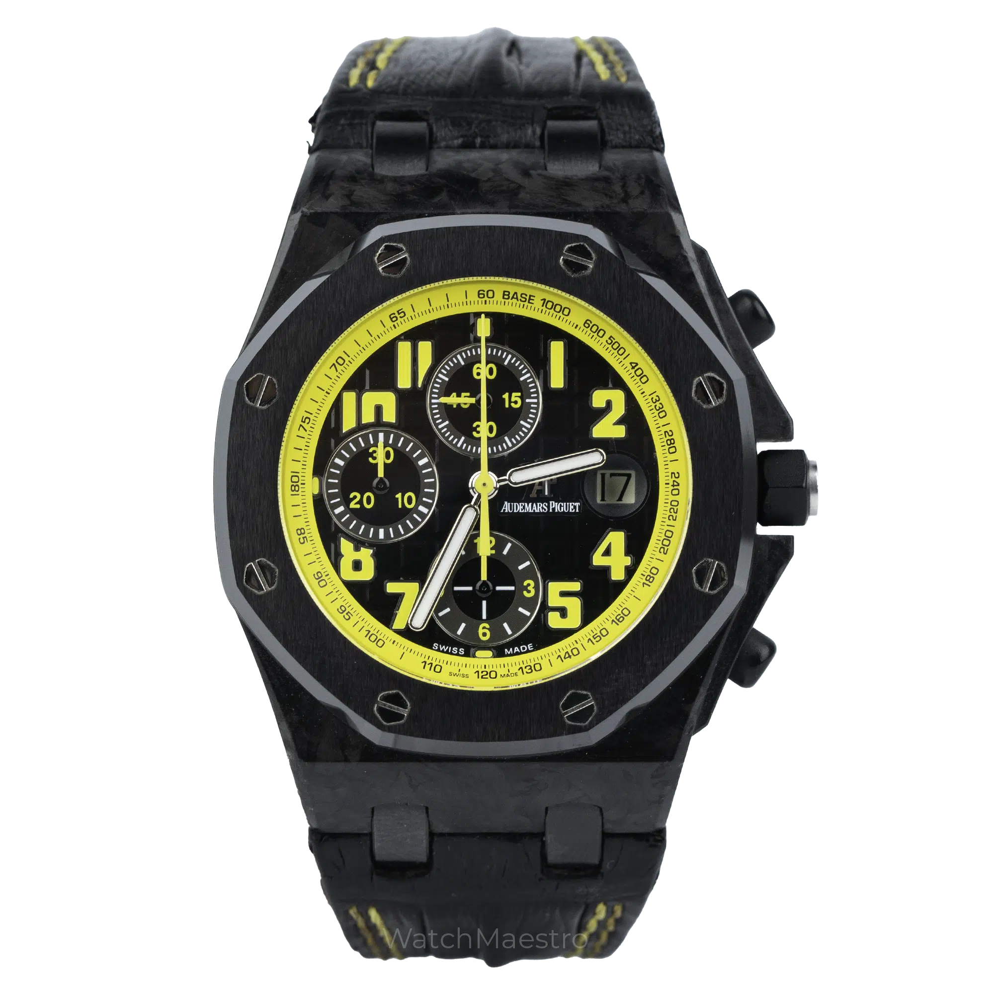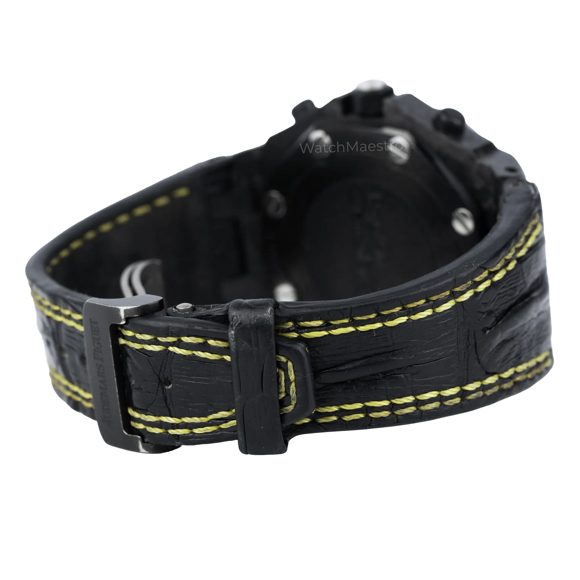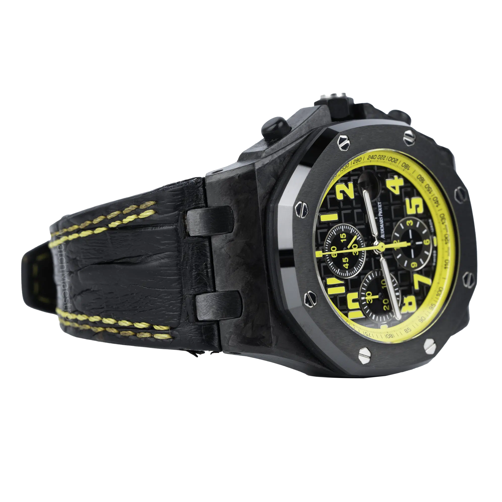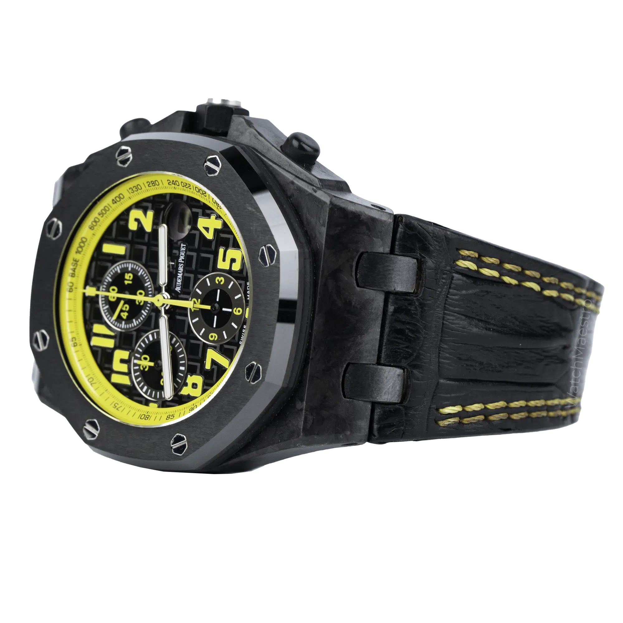 This is a watch that you do not come across every day. It is the Audemars Piguet Royal Oak Offshore Bumble Bee reference 26176FO.OO.D101CR.02. The all-black timepiece manages to stand out with the yellow accents seen on the dial and the strap. This pre-owned model, originally purchased in 2010 comes accompanied by its original box and papers. It features a striking 42mm black and yellow dial with a chronograph function, making it a desirable choice for watch enthusiasts and collectors alike. The unique combination of Black and Yellow has given this watch the nickname – “Bumble Bee.” It features a black carbon case, which offers a lightweight yet durable construction. The case sits on a distinctive black alligator leather strap with yellow stitching that adds a vibrant touch to the overall look of the timepiece.