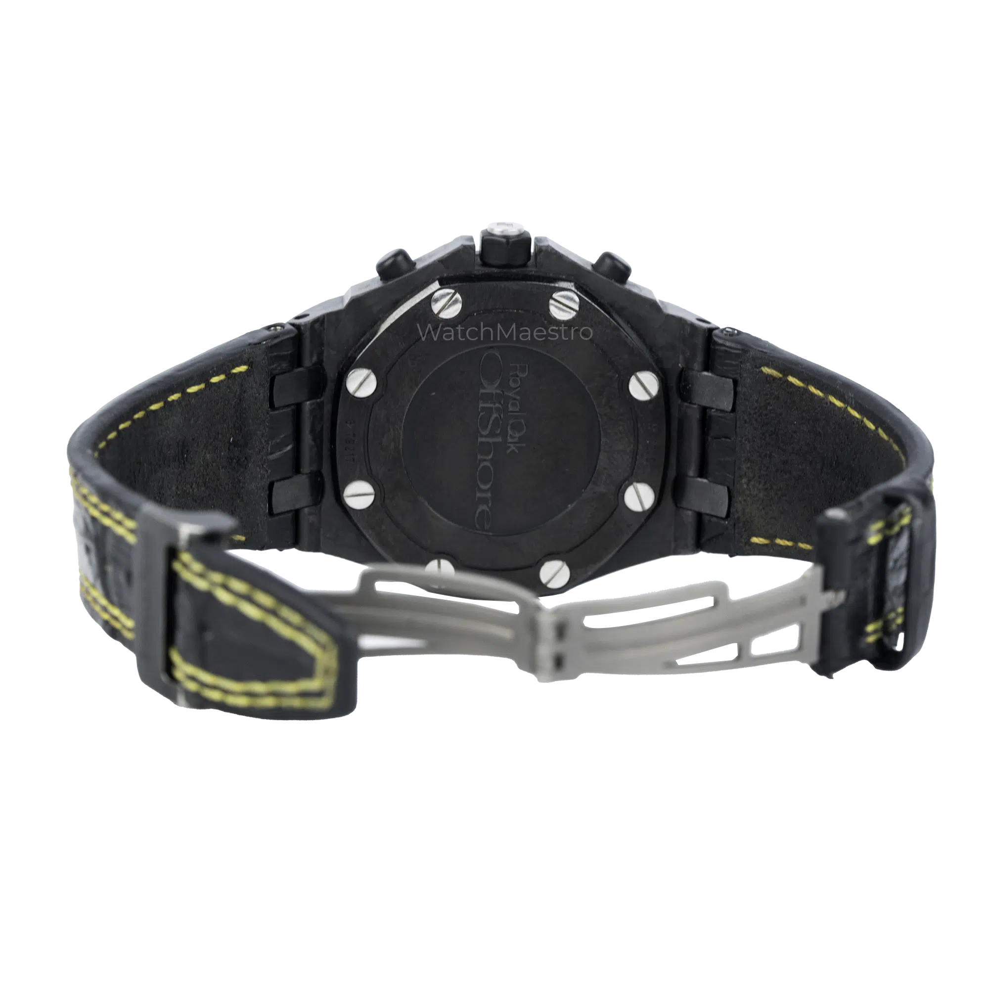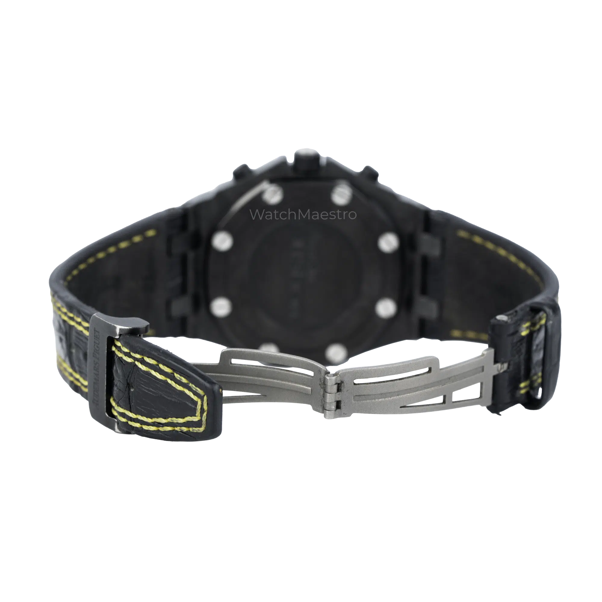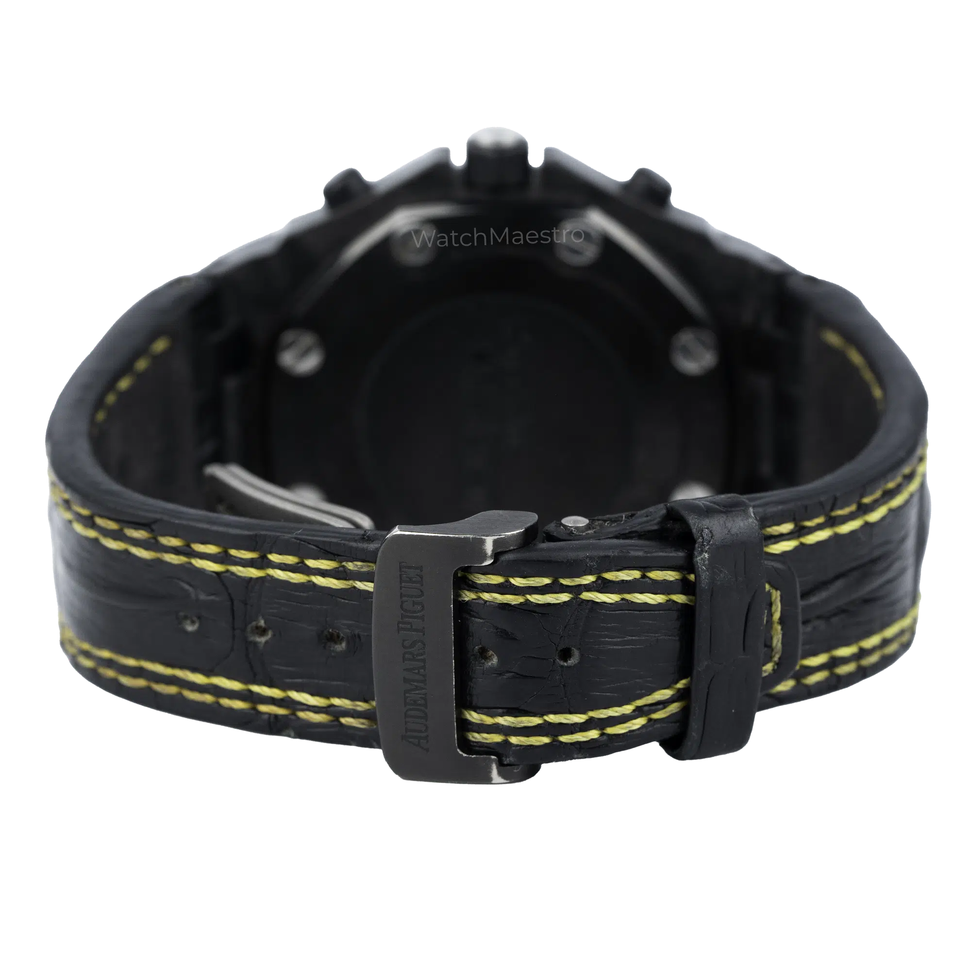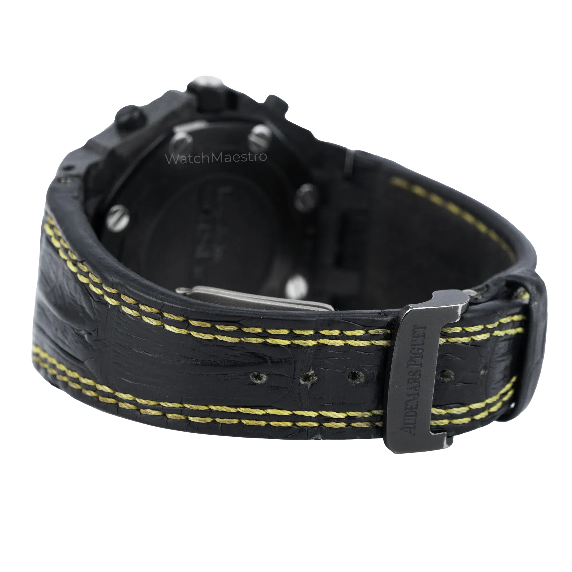 This is a watch that you do not come across every day. It is the Audemars Piguet Royal Oak Offshore Bumble Bee reference 26176FO.OO.D101CR.02. The all-black timepiece manages to stand out with the yellow accents seen on the dial and the strap. This pre-owned model, originally purchased in 2010 comes accompanied by its original box and papers. It features a striking 42mm black and yellow dial with a chronograph function, making it a desirable choice for watch enthusiasts and collectors alike. The unique combination of Black and Yellow has given this watch the nickname – “Bumble Bee.” It features a black carbon case, which offers a lightweight yet durable construction. The case sits on a distinctive black alligator leather strap with yellow stitching that adds a vibrant touch to the overall look of the timepiece.