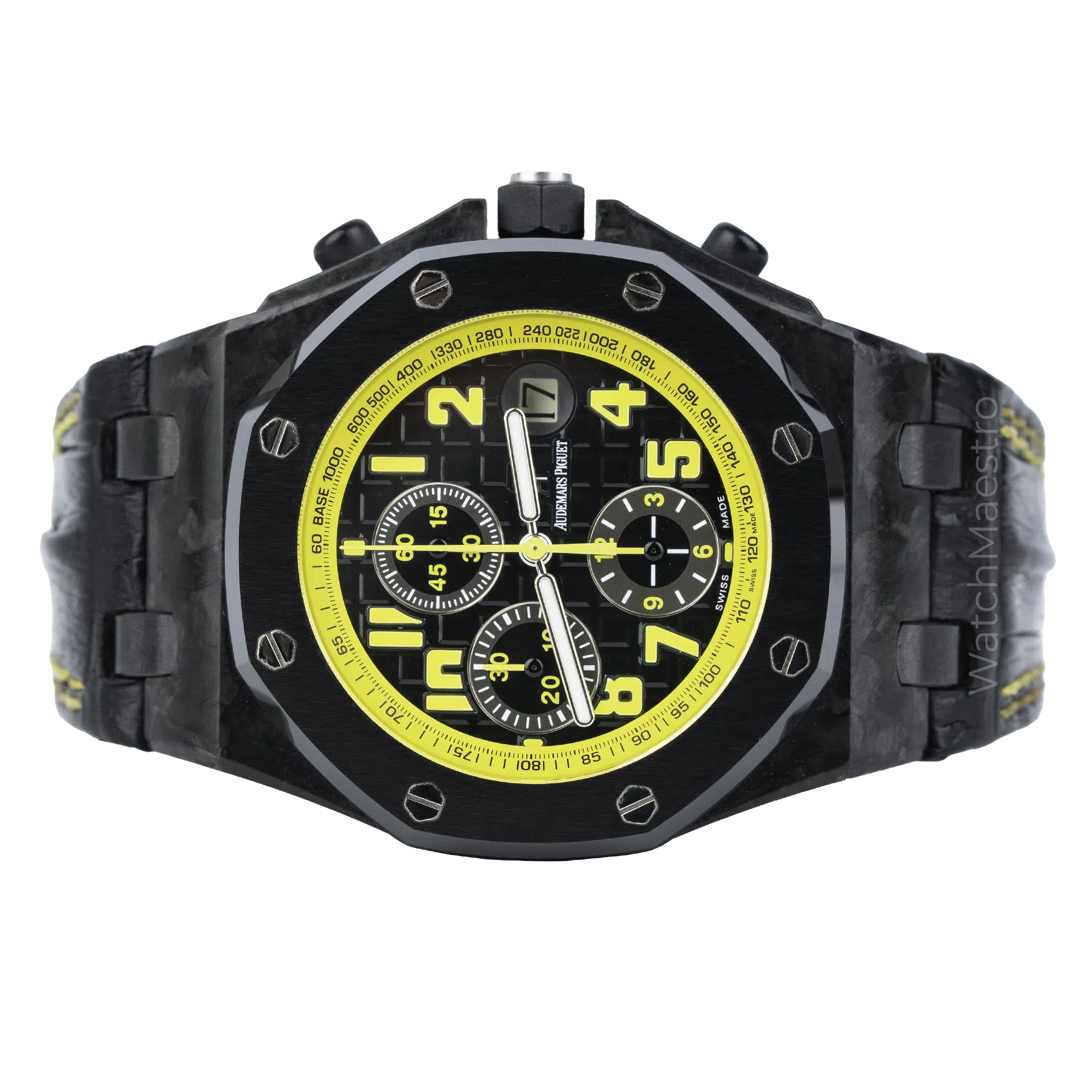 The watch’s chronograph function, powered by an automatic movement, provides precise timekeeping and a sporty aesthetic. The ceramic bezel and forged carbon case complement the bold yellow accents on the dial. The Audemars Piguet Royal Oak Offshore Bumble Bee is surely a standout piece that you can add to your collection.