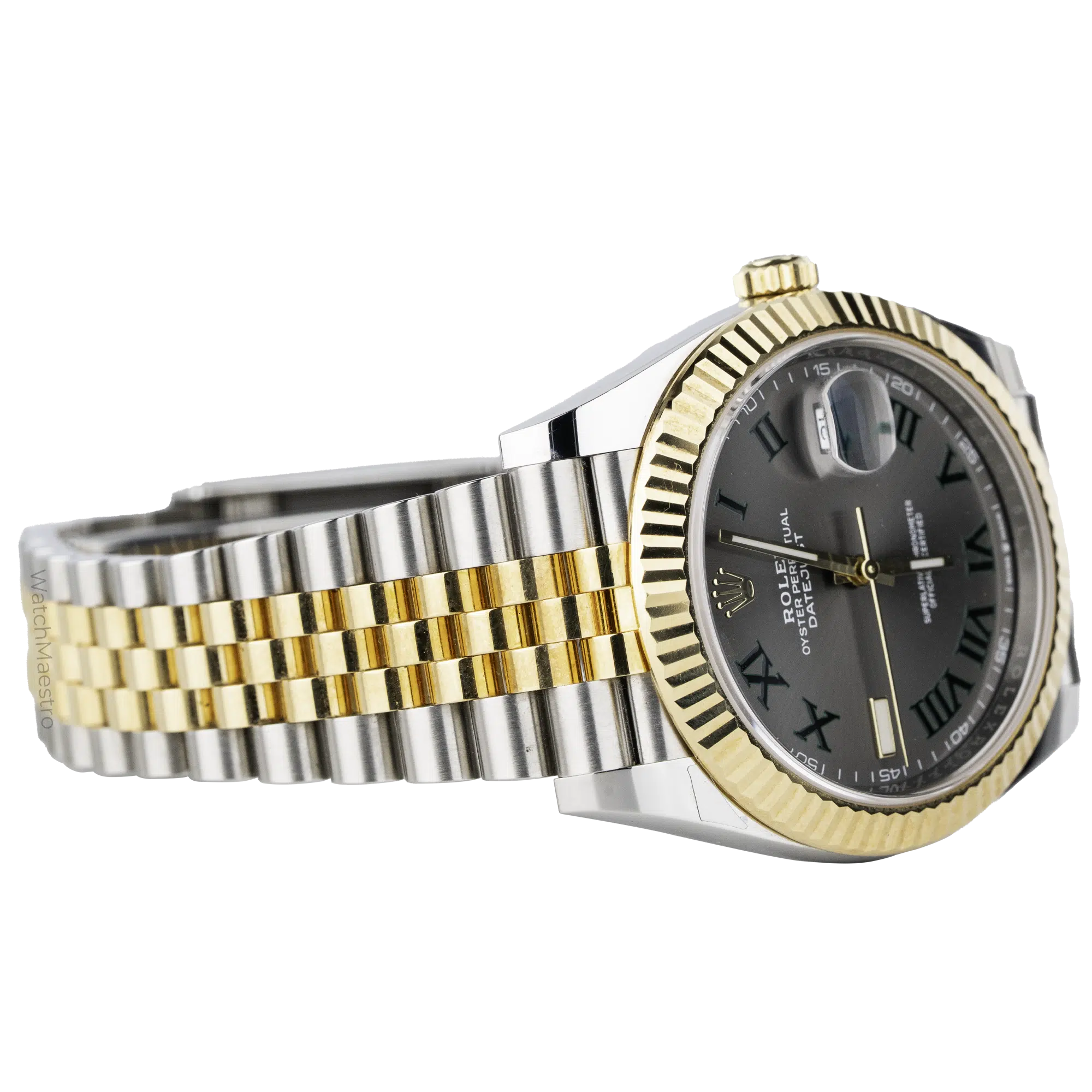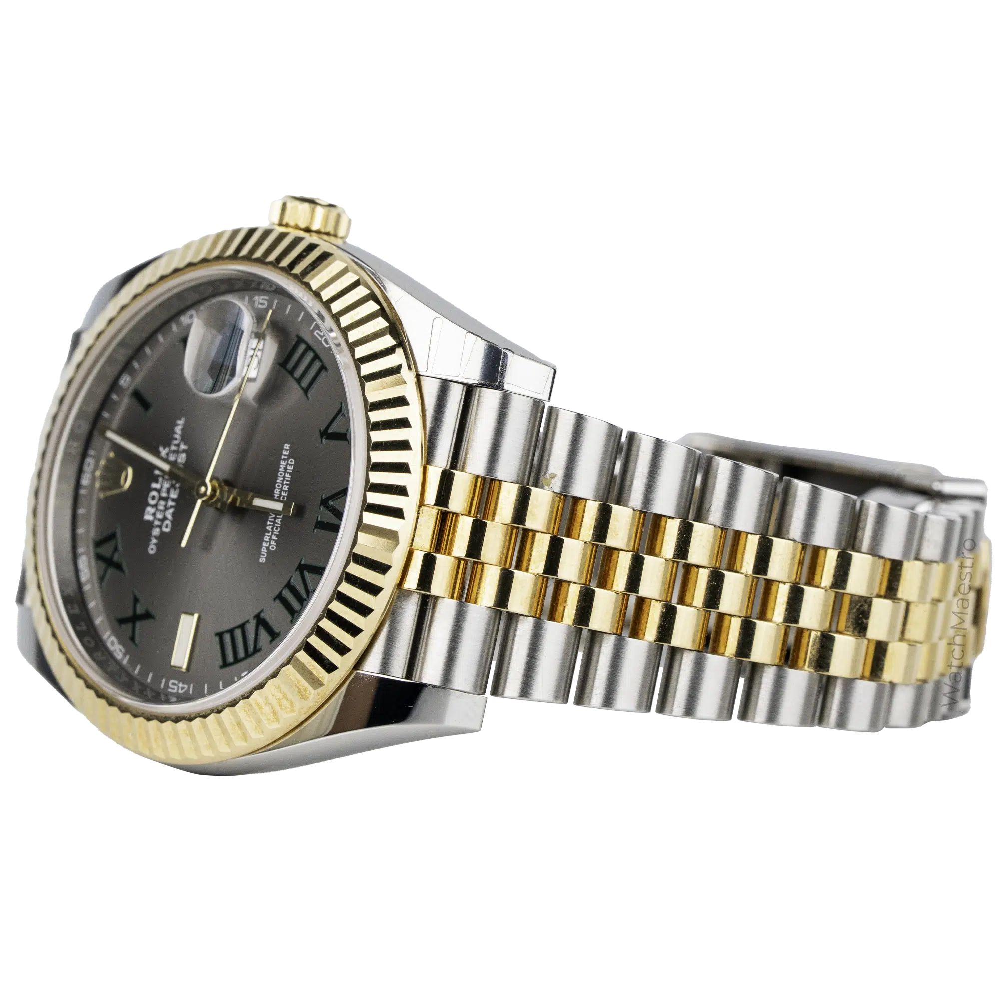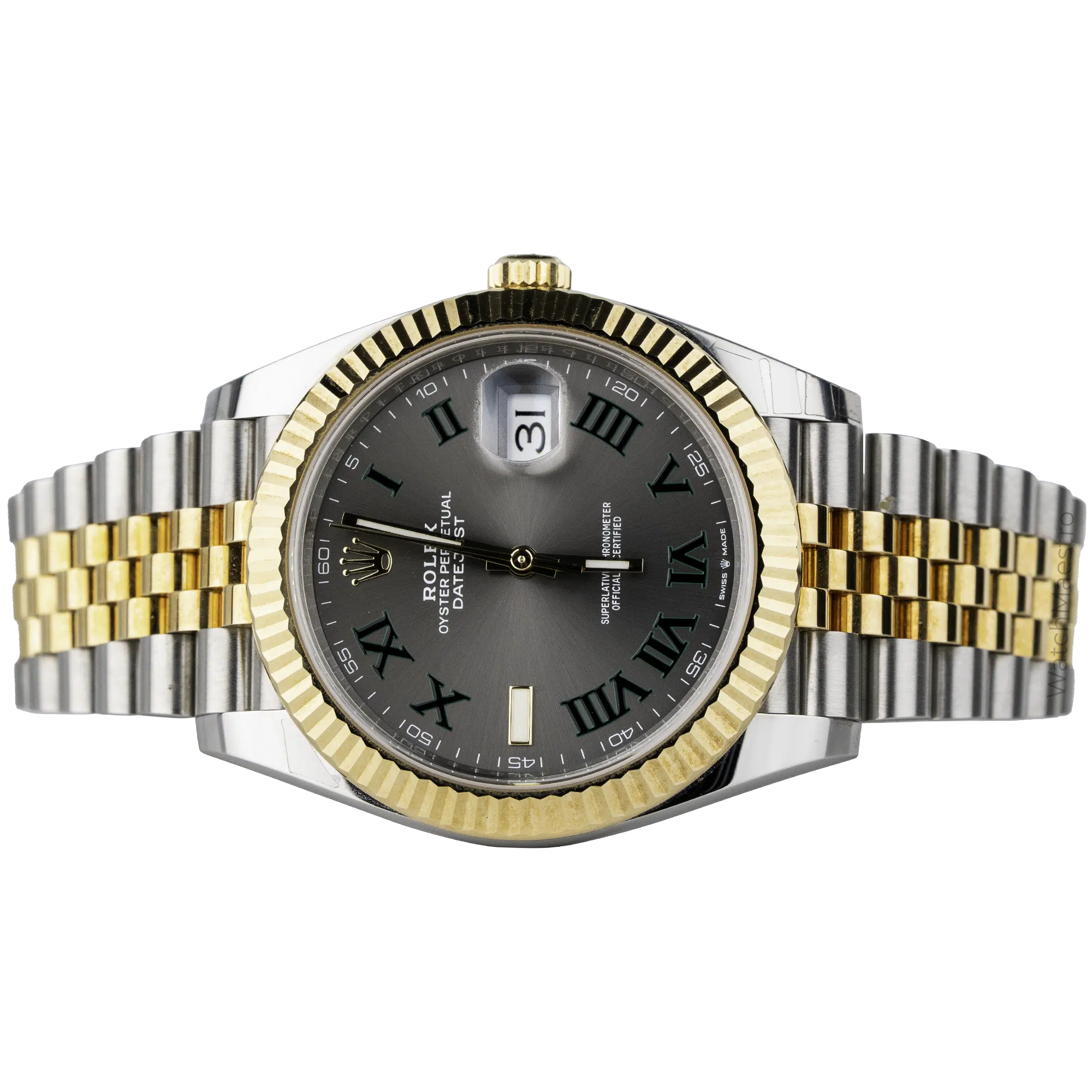 Inspired by the world of Tennis, this Rolex Wimbledon features a 41mm grey dial with Roman numerals, popularly known as the Wimbledon dial because of the green accents. Crafted in Yellow Gold and Stainless Steel, this Datejust features a Yellow Gold Fluted Bezel and a Two-tone Yellow Gold and Steel Jubilee Bracelet. Purchased in 2020, this Rolex Datejust is pre-owned but remains in good condition. It comes complete with its original box and papers.