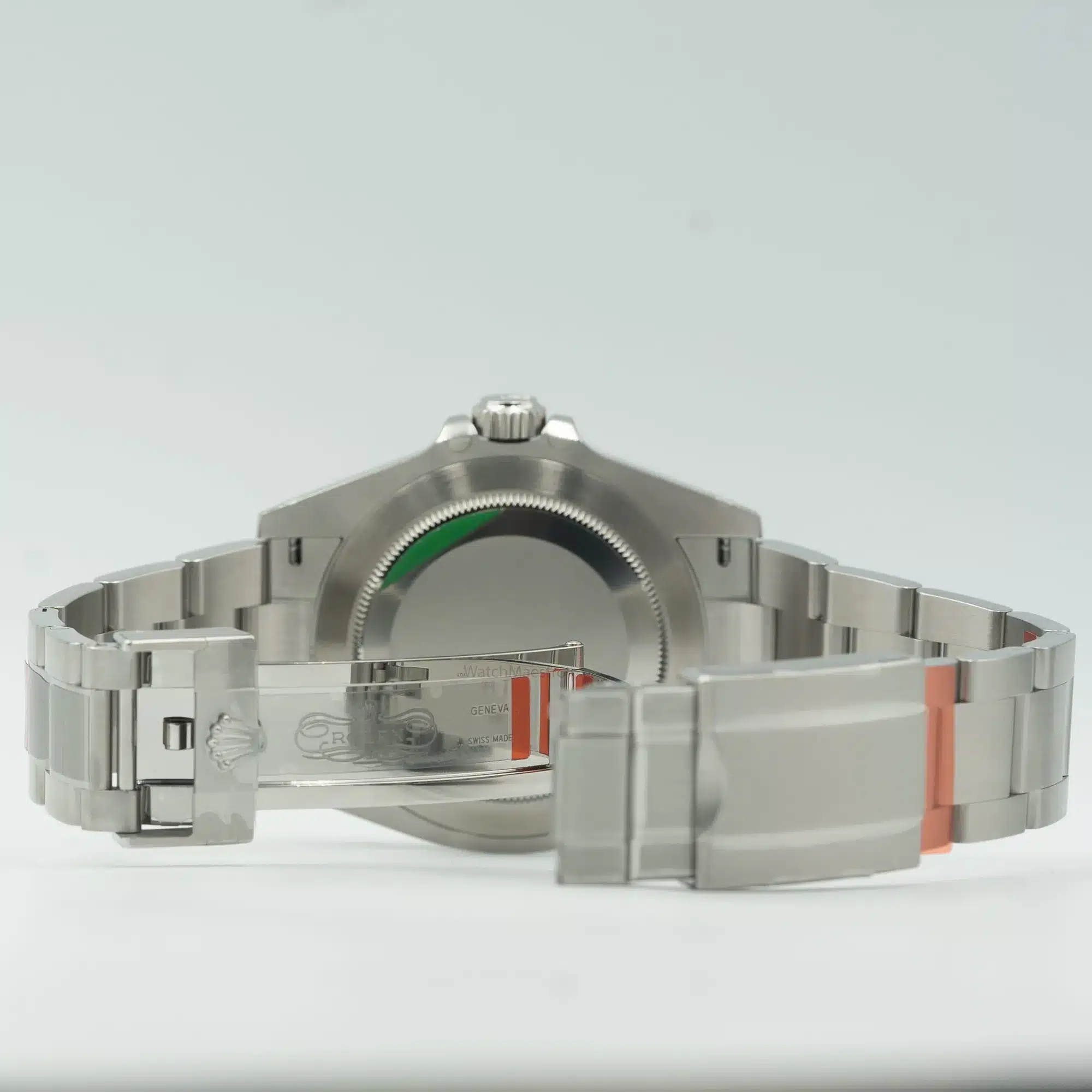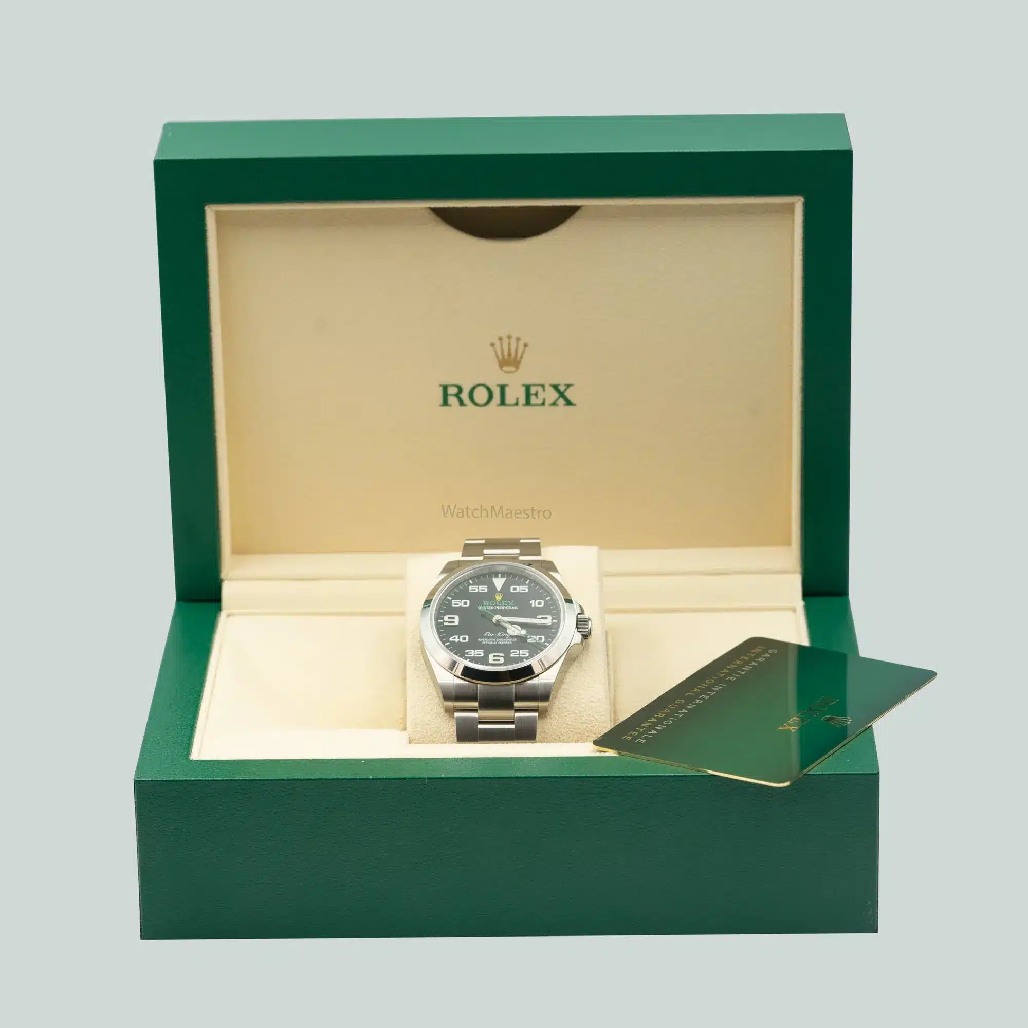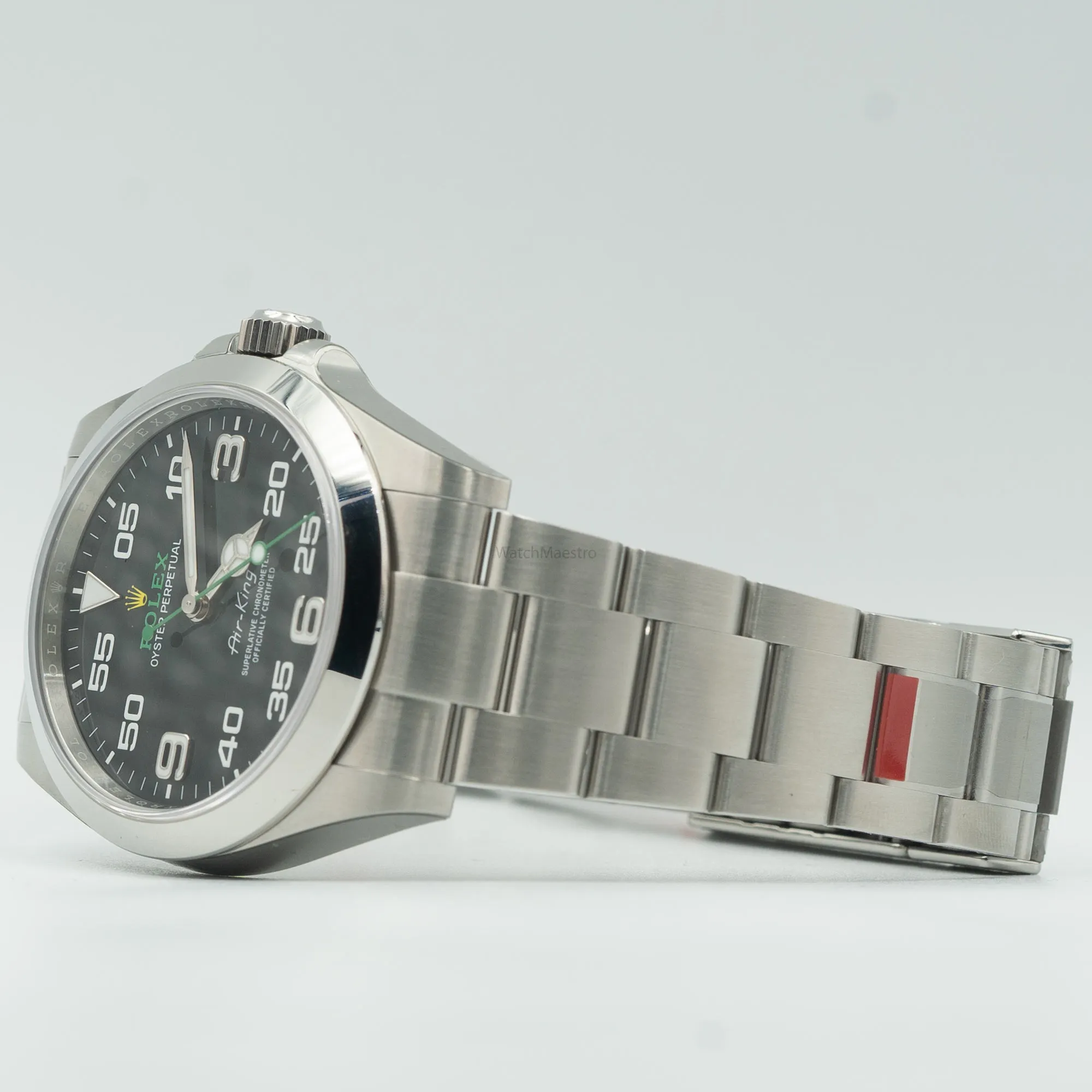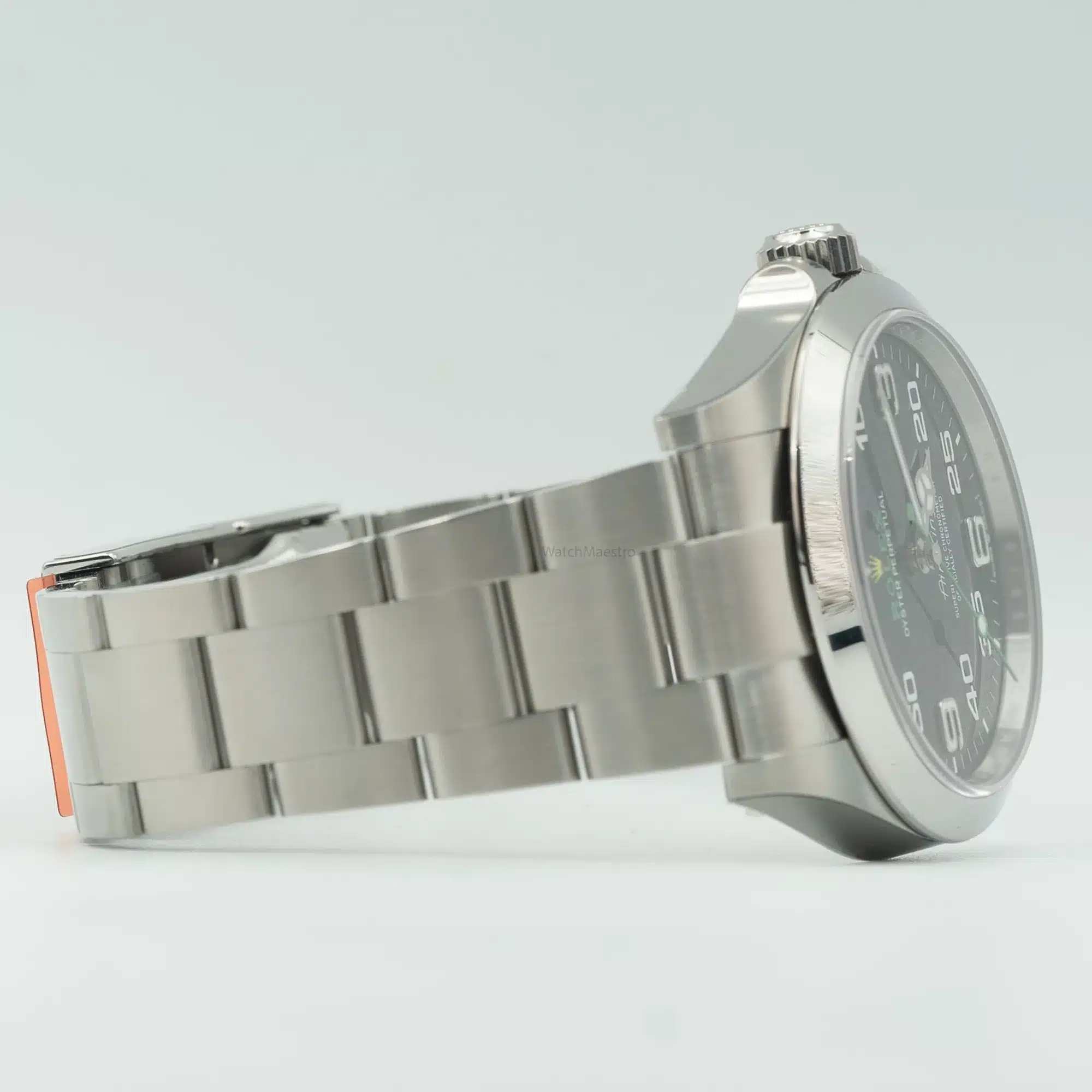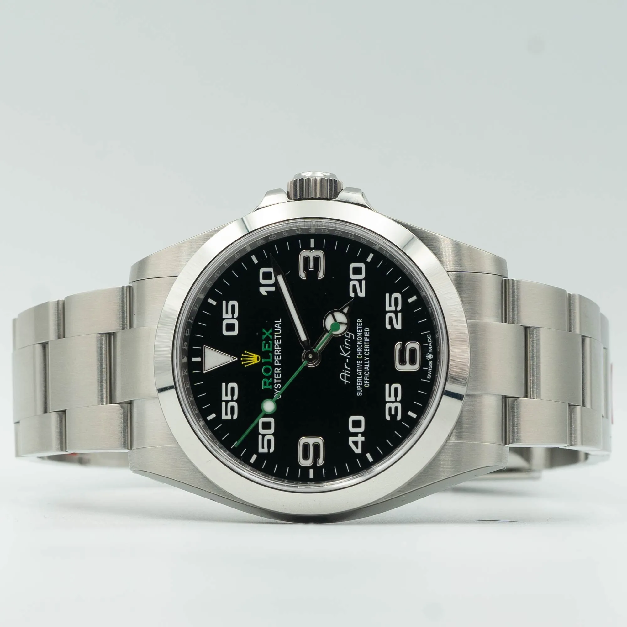 This is a brand-new Rolex Air King with factory stickers still on it. Purchased in 2022, the watch comes with its original box and the green Rolex warranty card. This is the newer reference 126900, and it comes with crown guards making the watch more durable than before. On top of that, Rolex has changed the number ‘5’ to ’05’ just to make way for better symmetry.