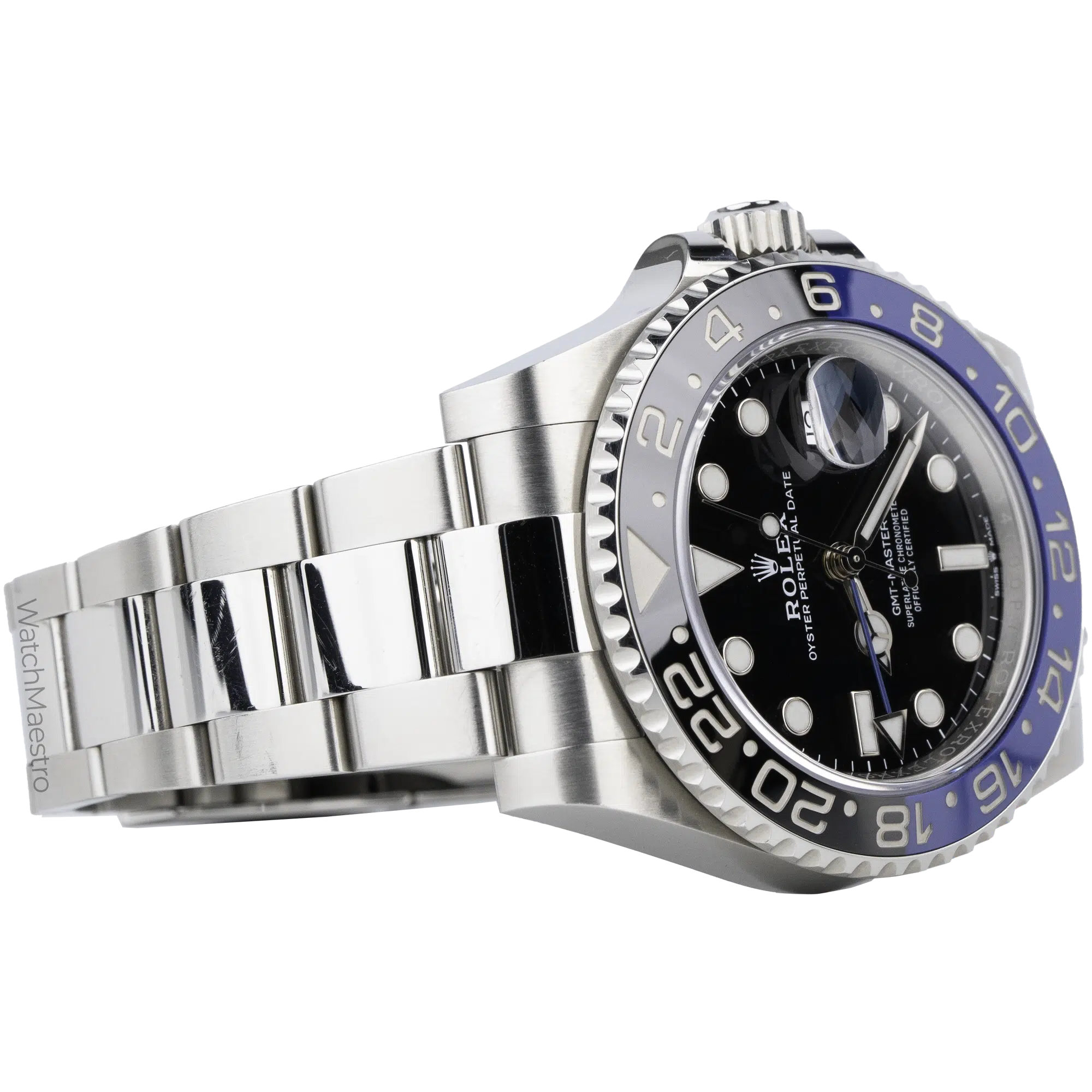 This is a pre-owned Rolex GMT Master II Batman, which got its nickname from the blue-black bi-color bezel. Purchased in 2023, the watch comes complete with box and papers. It features a 40mm black dial and the Oystersteel case sits on an Oyster bracelet. The watch does not just offer looks but also offers functionality. The GMT Master II can keep track of multiple timezones simultaneously making it the perfect watch for travelers. If you have been wanting to add one to your collection, now is the best time to do so!